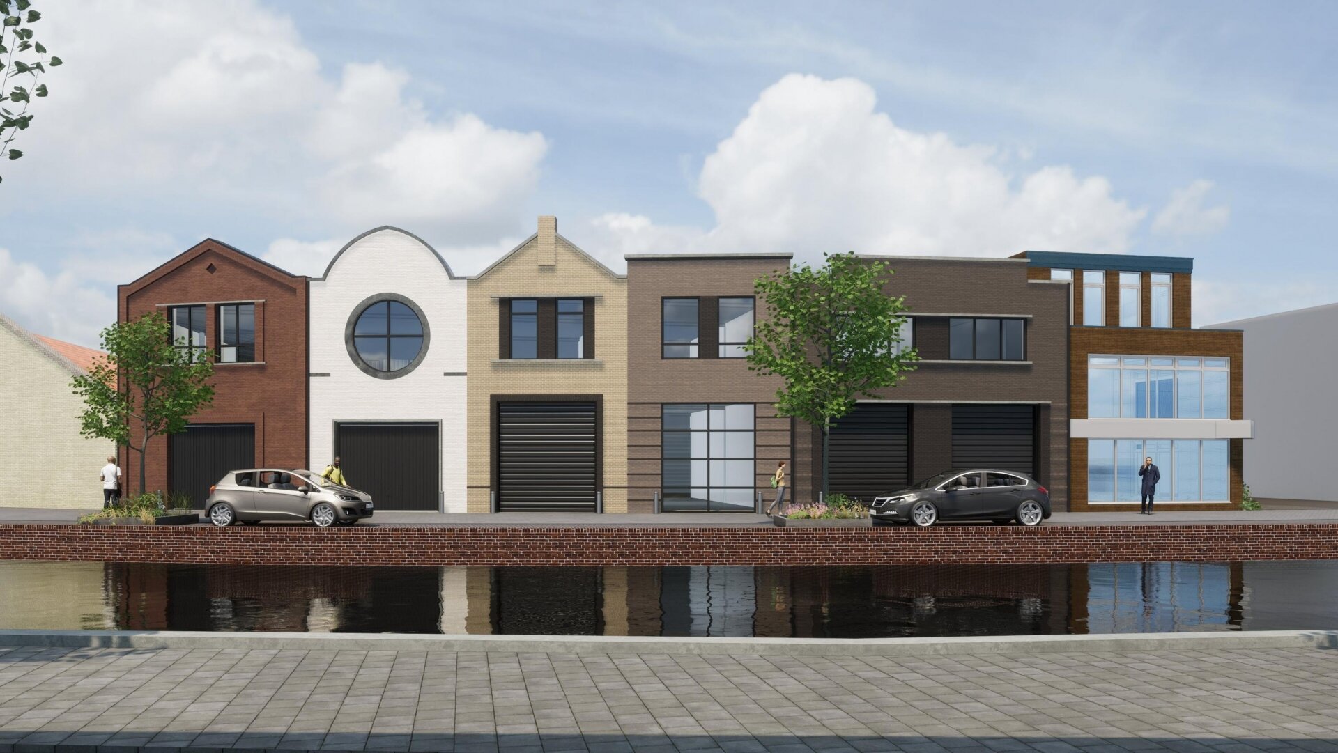 De twintig bedrijfsunits zijn gegroepeerd in drie blokken rondom een gemeenschappelijk binnenterrein. Het meest prominente blok, gelegen aan het Jaagpad, biedt uitzicht over het water van de Kromme Gouwe.