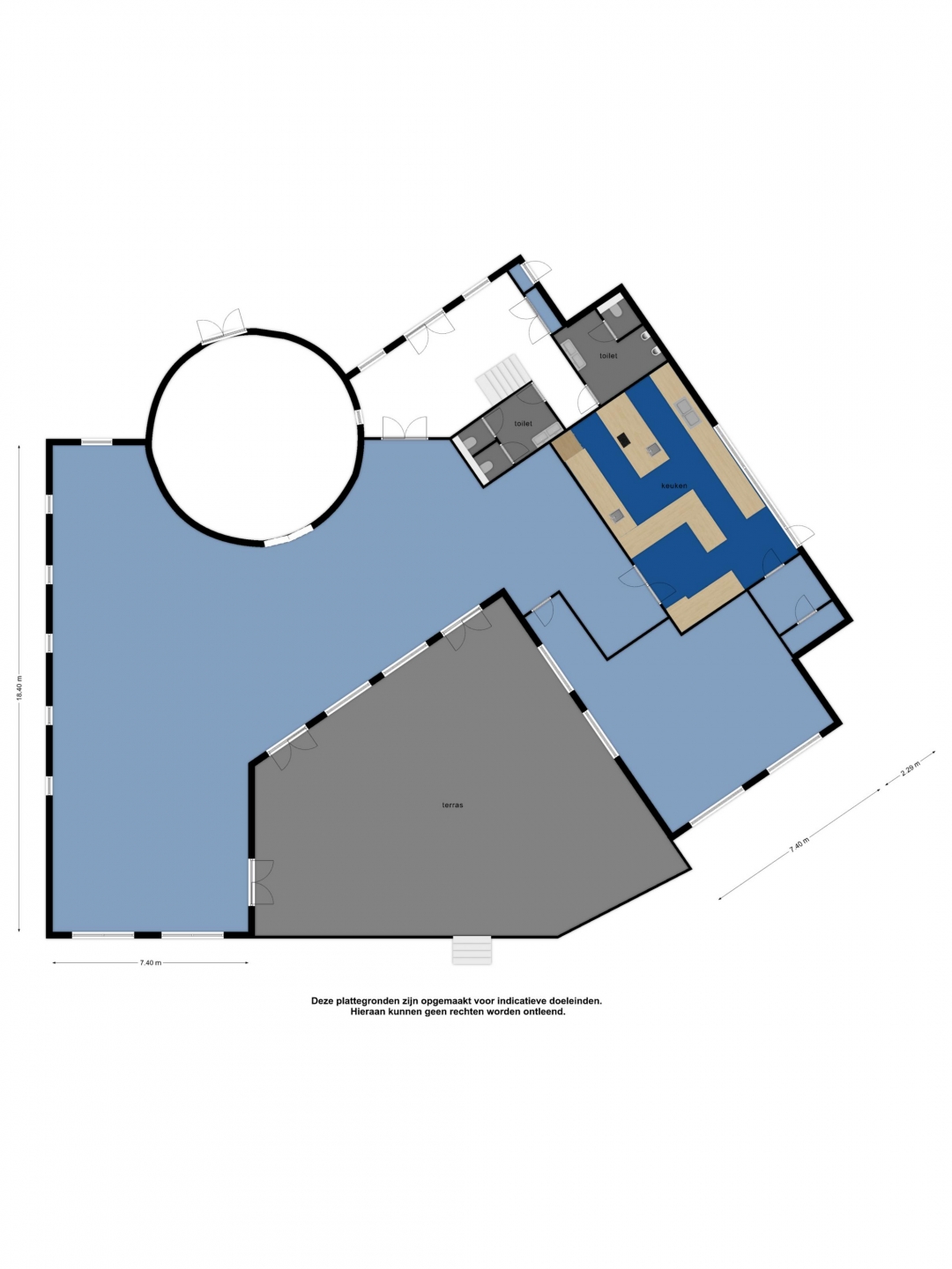 Globale indeling: Entree via de dubbele deuren, garderobe, toiletten, trapopgang naar verdieping.