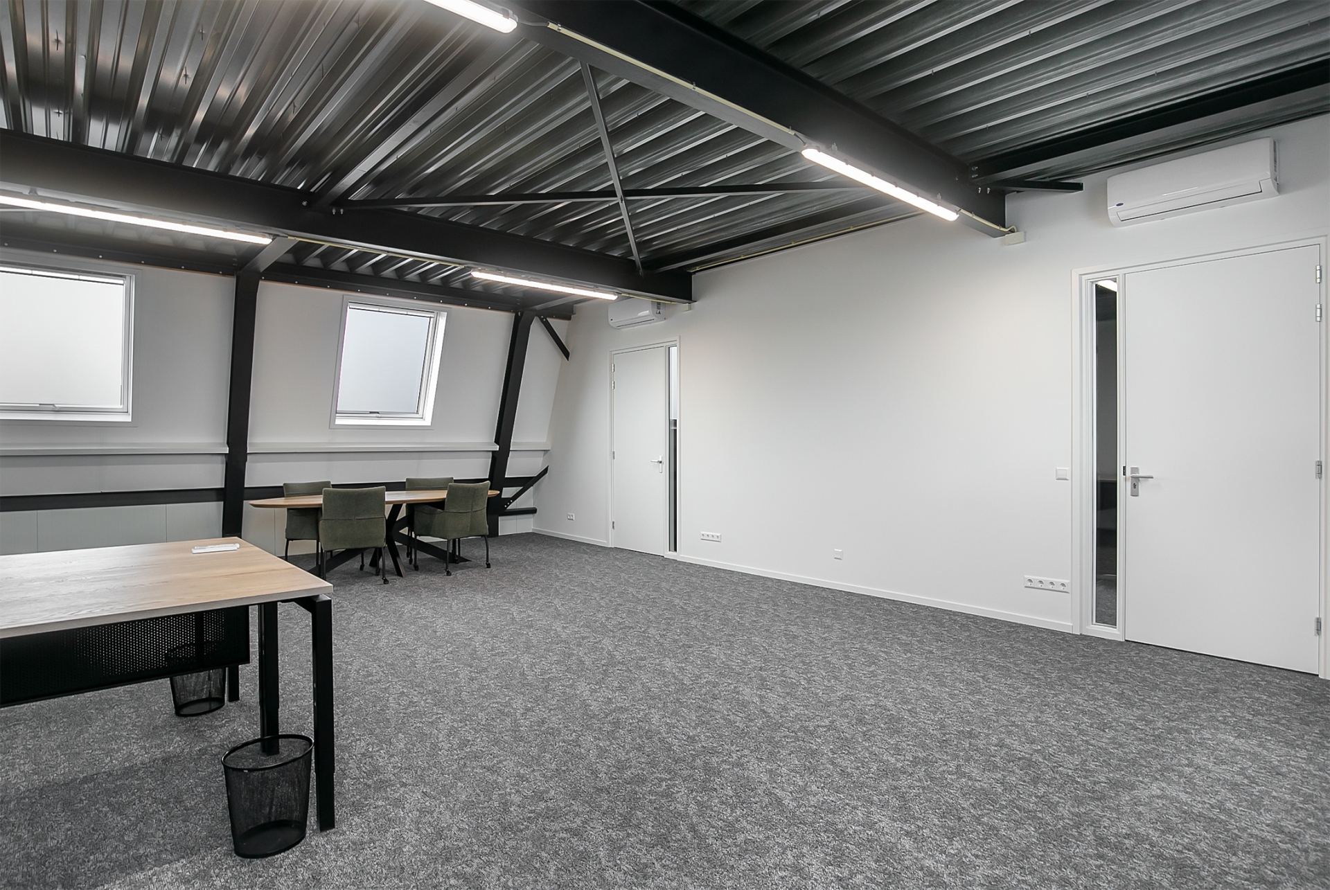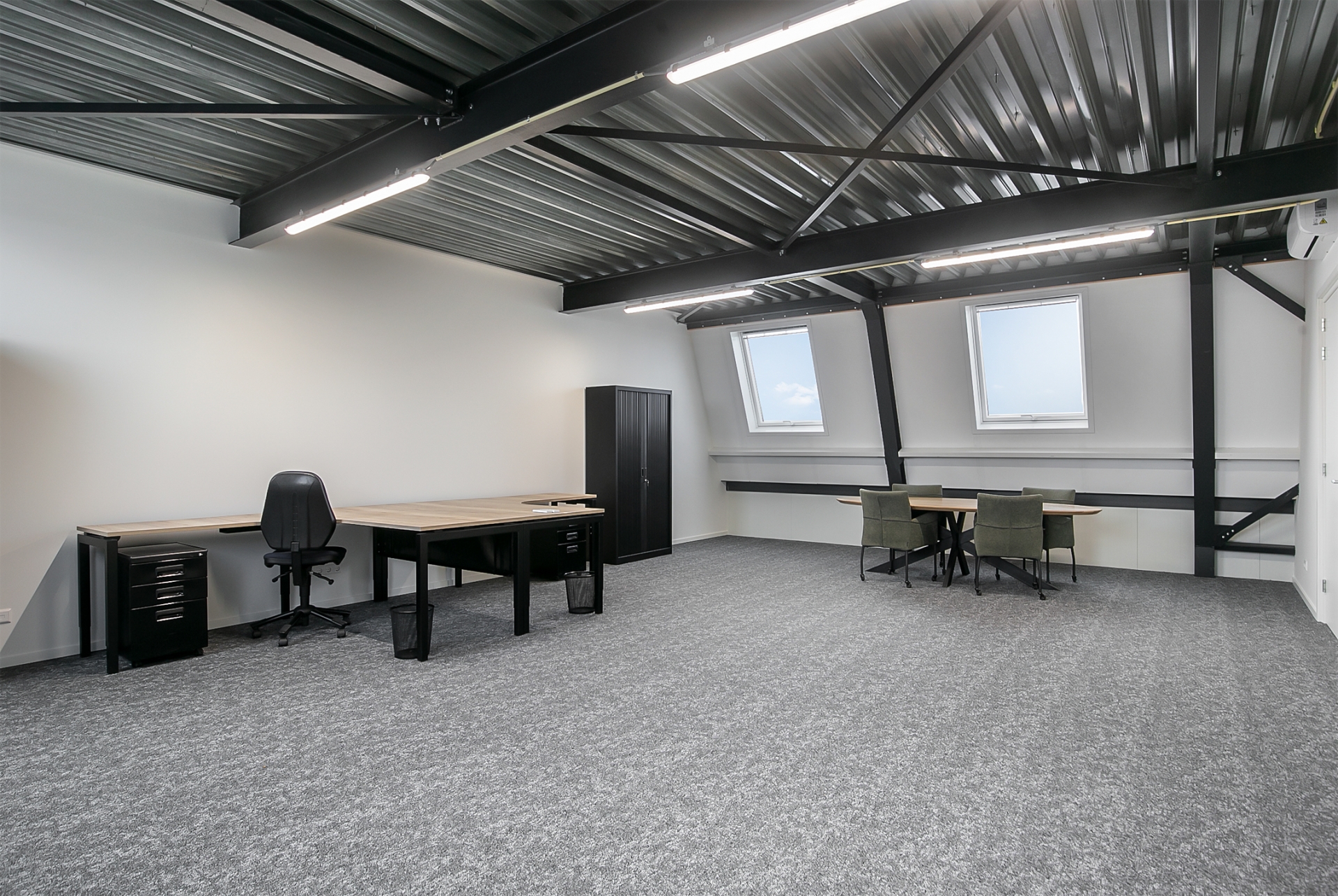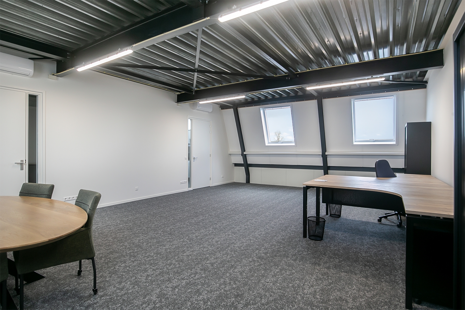 - kantoorindeling op de verdieping voorzien van vloerbedekking, pantry, toilet, airco-splitunit, aansluitpunten voor internet, systeemplafond met
