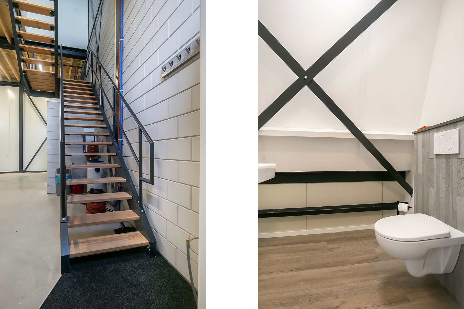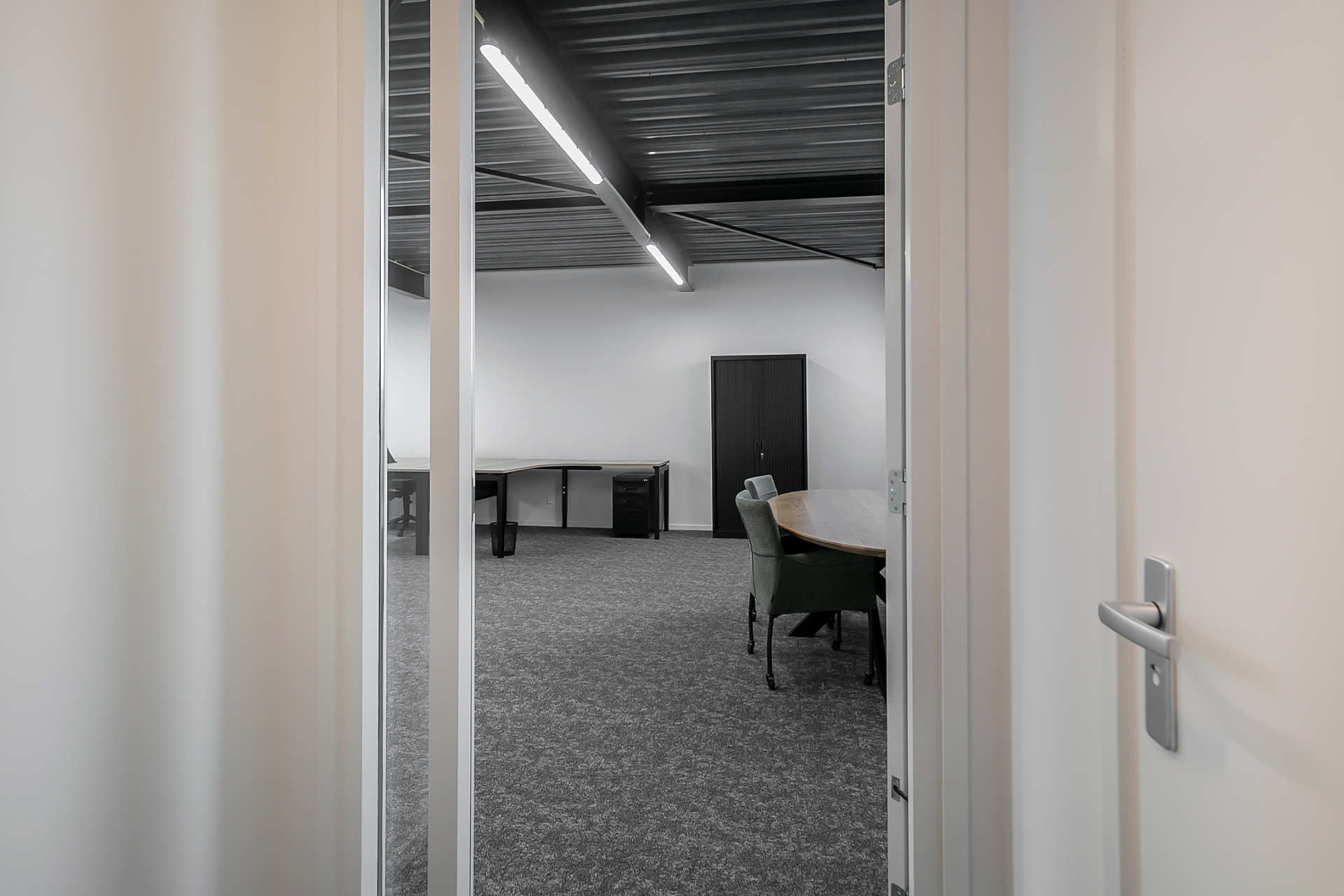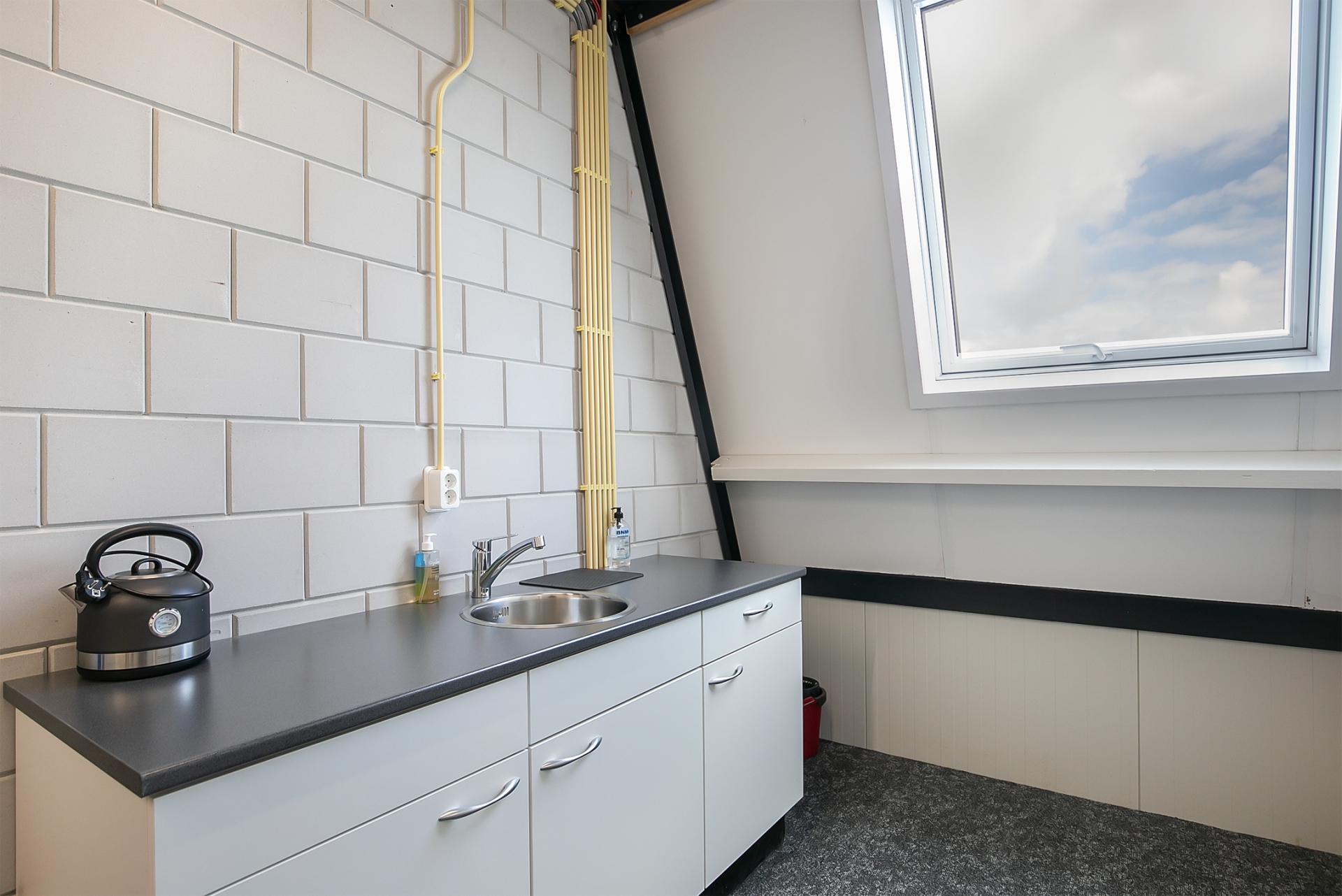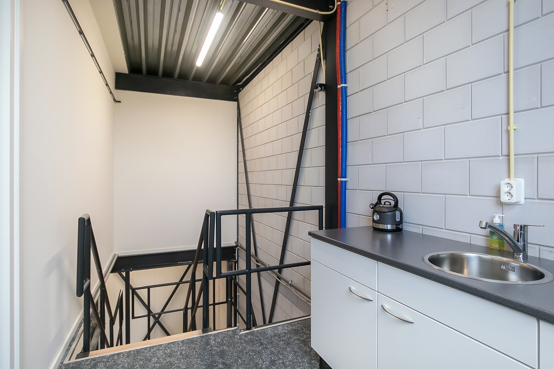 - kantoorindeling op de verdieping voorzien van vloerbedekking, pantry, toilet, airco-splitunit, aansluitpunten voor internet, systeemplafond met
