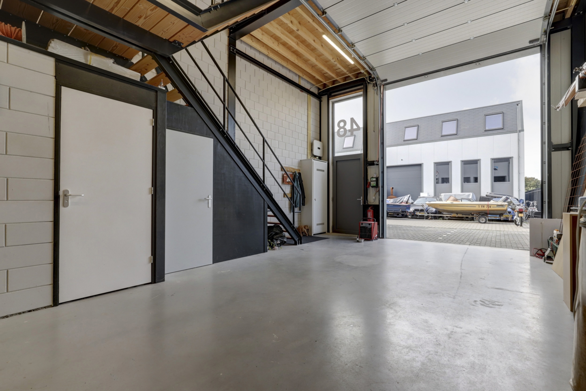 Voor de bedrijfsunit zijn twee eigen parkeerplaatsen beschikbaar. Het terrein is volledig omsloten door een hekwerk. Toegang tot het terrein via een op afstand bedienbare elektrische schuifpoort.
