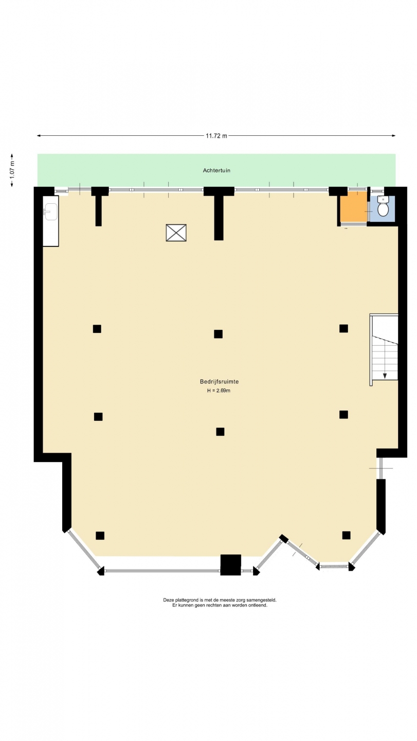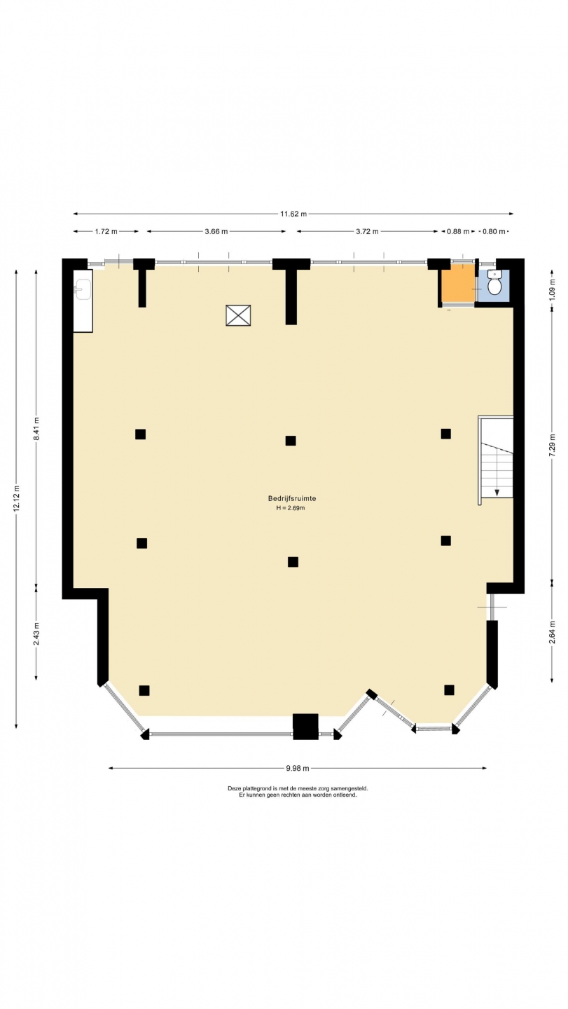 Deze commerciële bedrijfsruimte wordt in de huidige staat opgeleverd. Er wordt casco verhuurd. De in het gehuurde aanwezige voorzieningen die niet tot het casco behoren worden door verhuurder om niet ter beschikking gesteld.