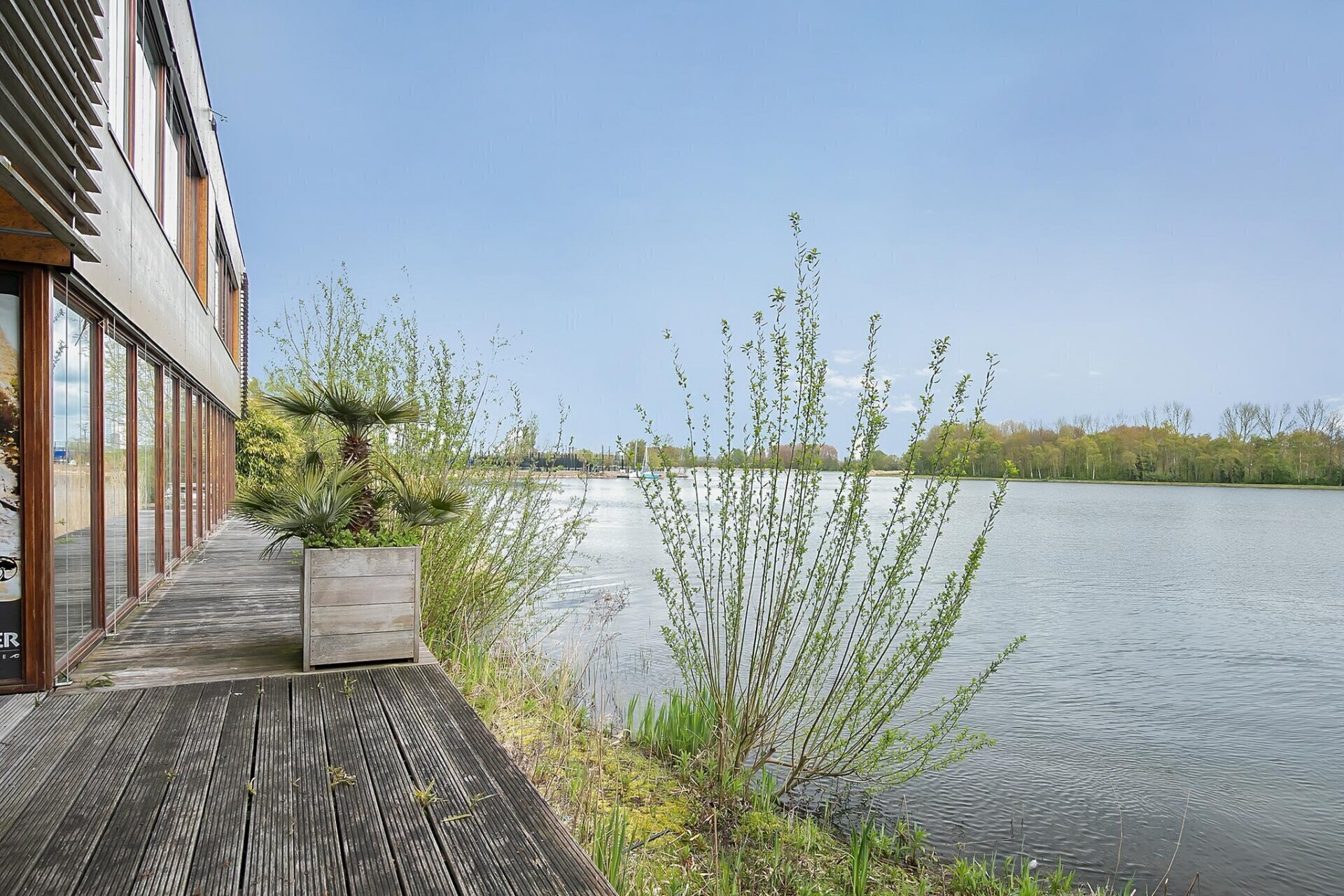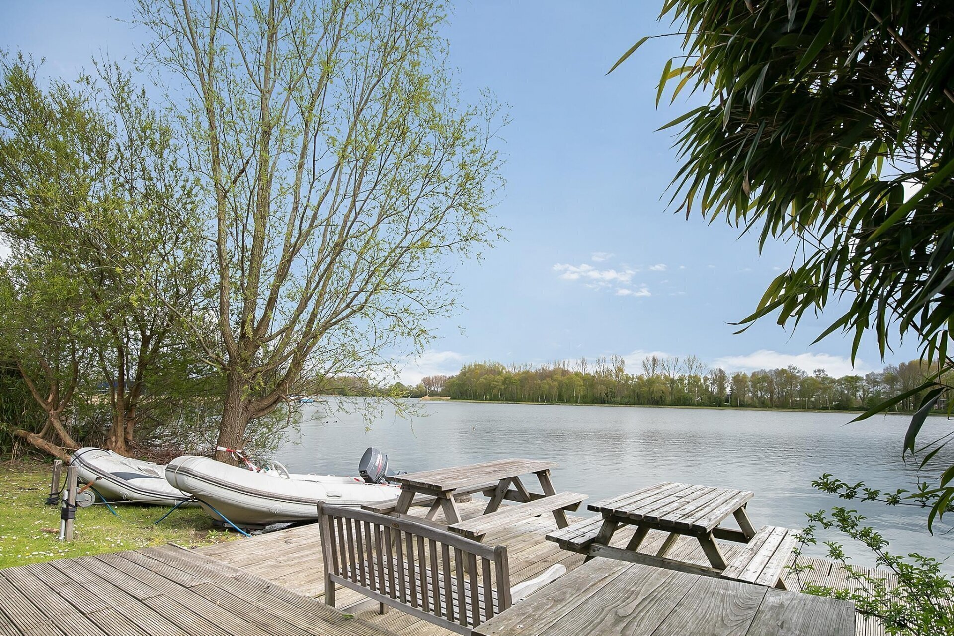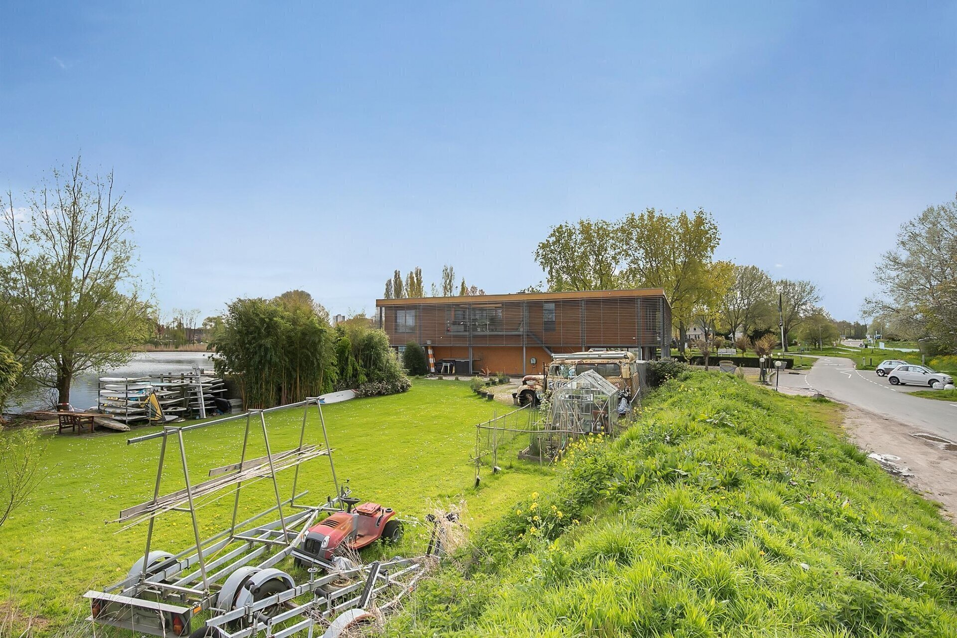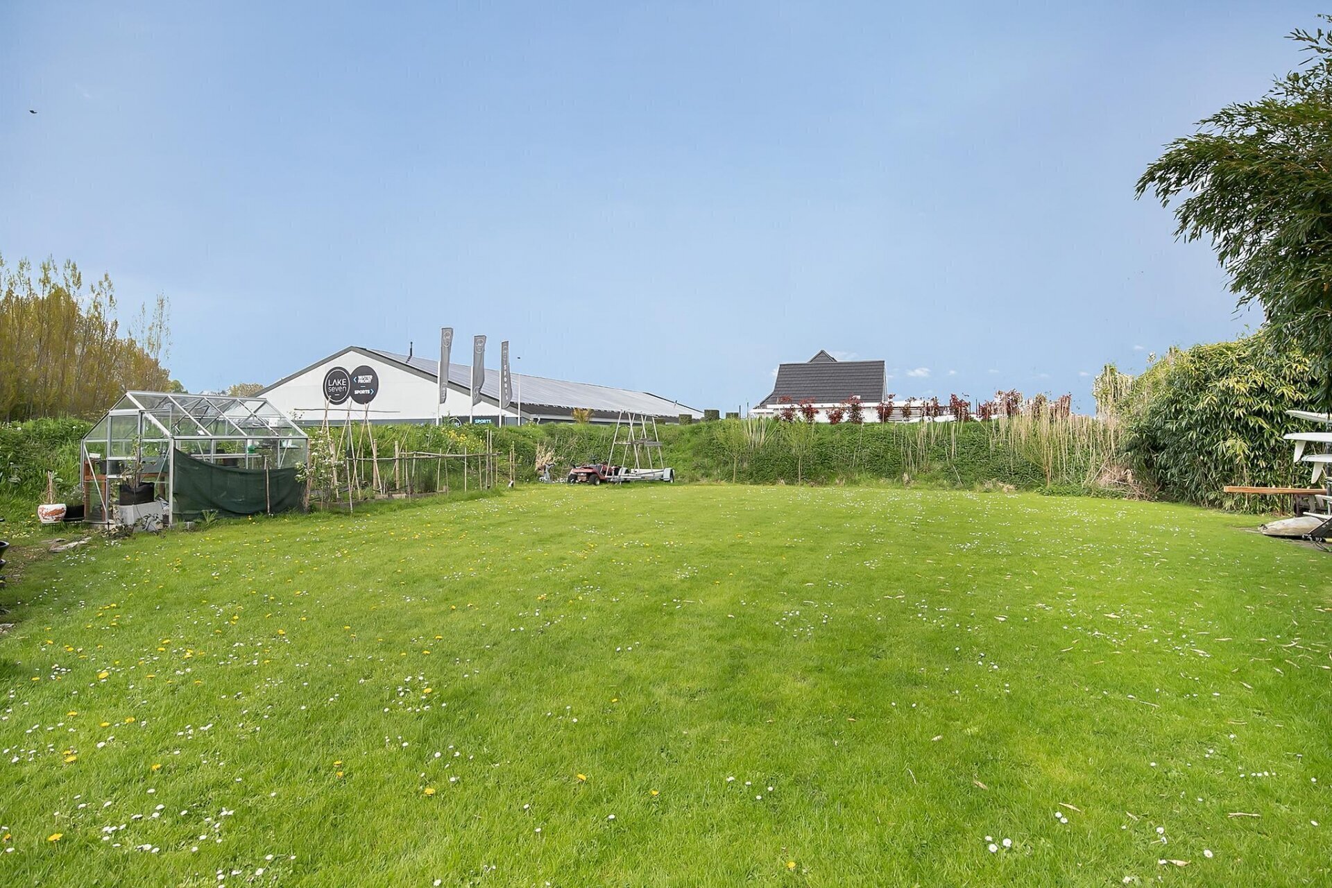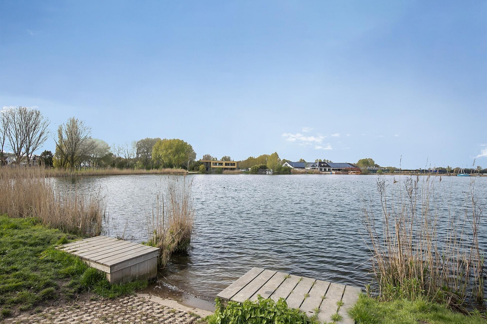 De hele kavel grenst aan het water, met een steiger en zelfs een stukje strand! Denkt u aan alle mogelijkheden van recreatie, sport en ontspanning die hier te realiseren zijn.