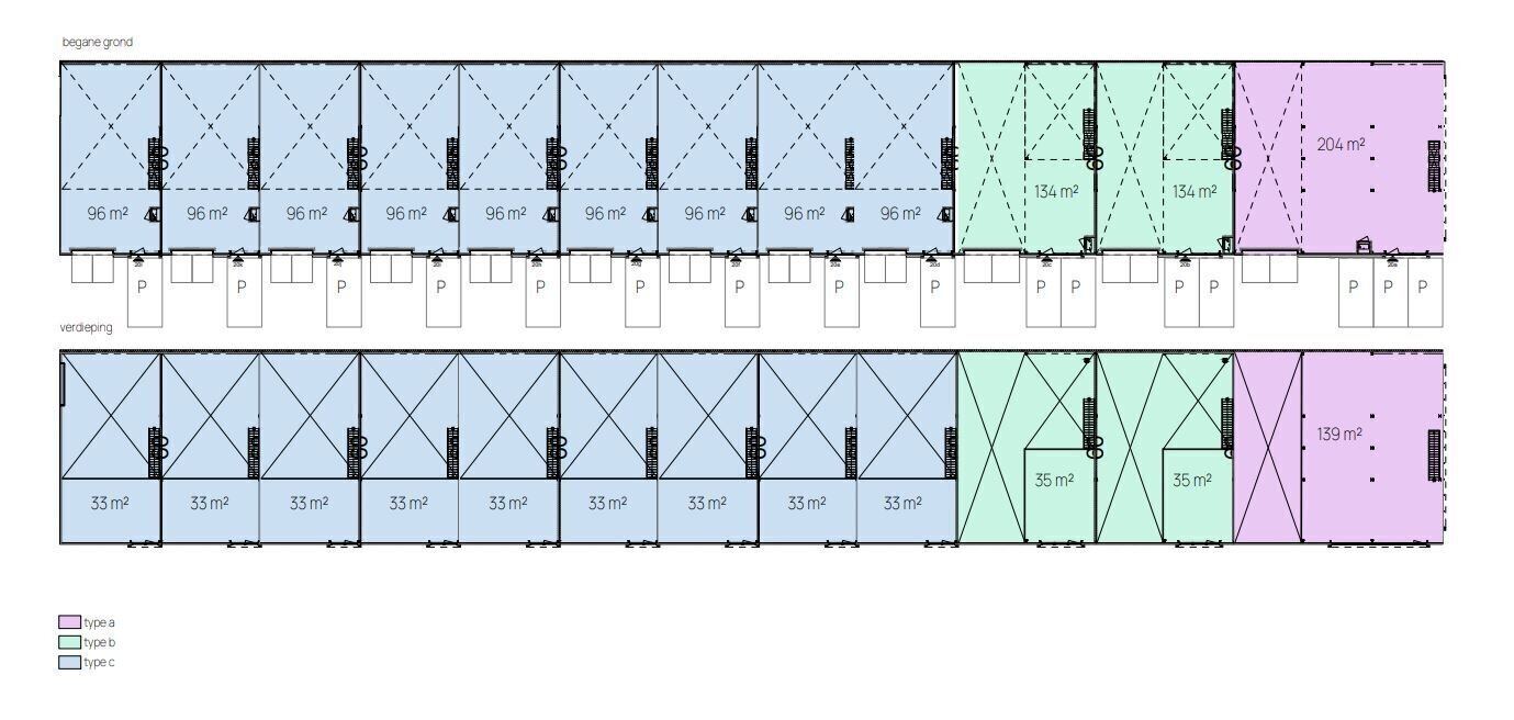 De units beschikken over een vrije hoogte van ca. 8 m1 meter op de begane grond, op het deel waar geen verdiepingsvloer boven ligt.