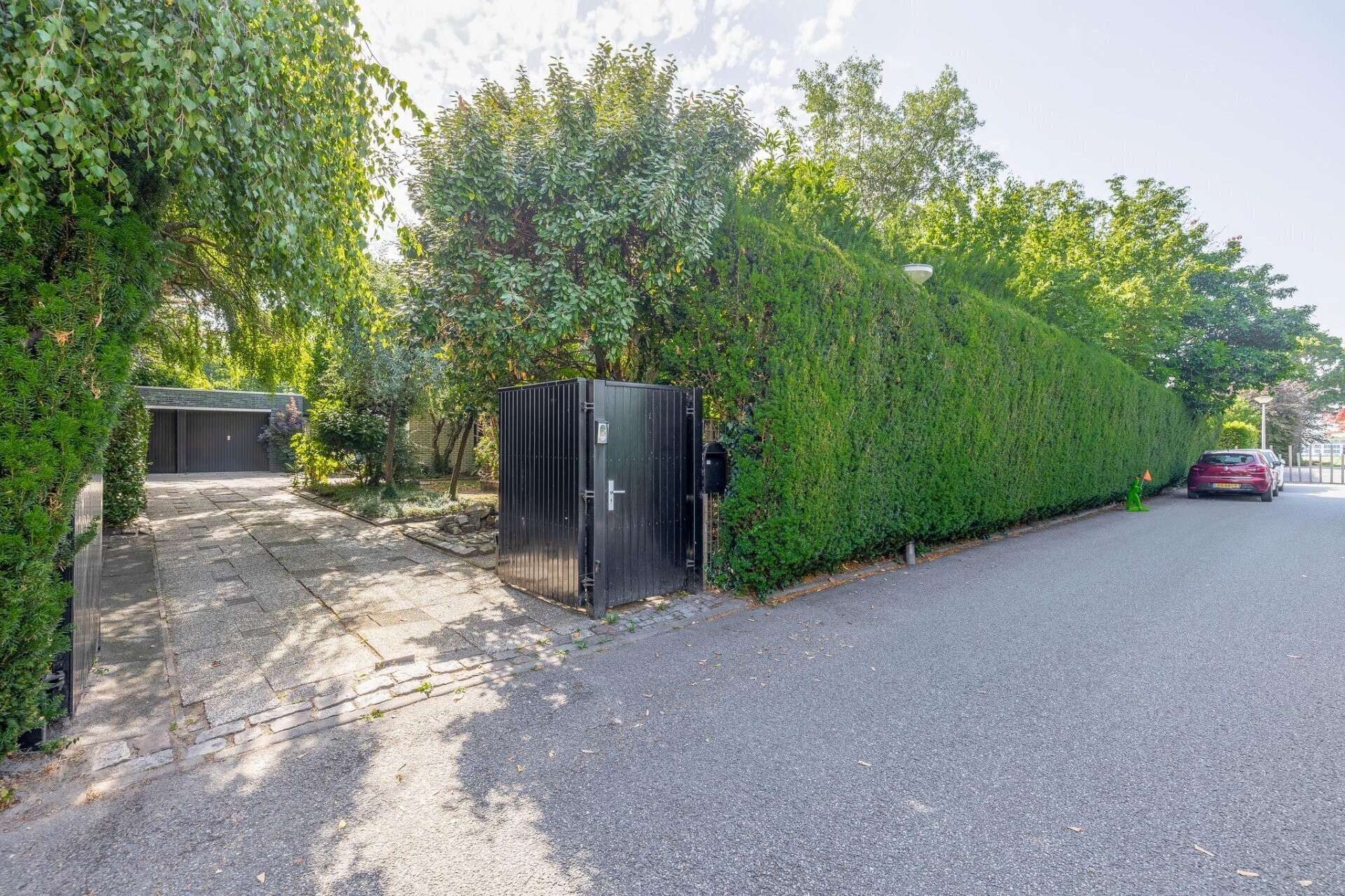 Dubbele garage en grote oprit met laadpaal