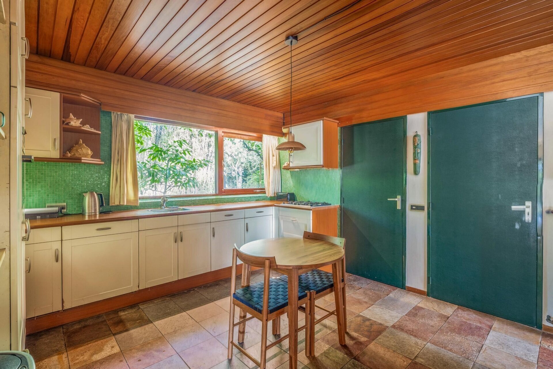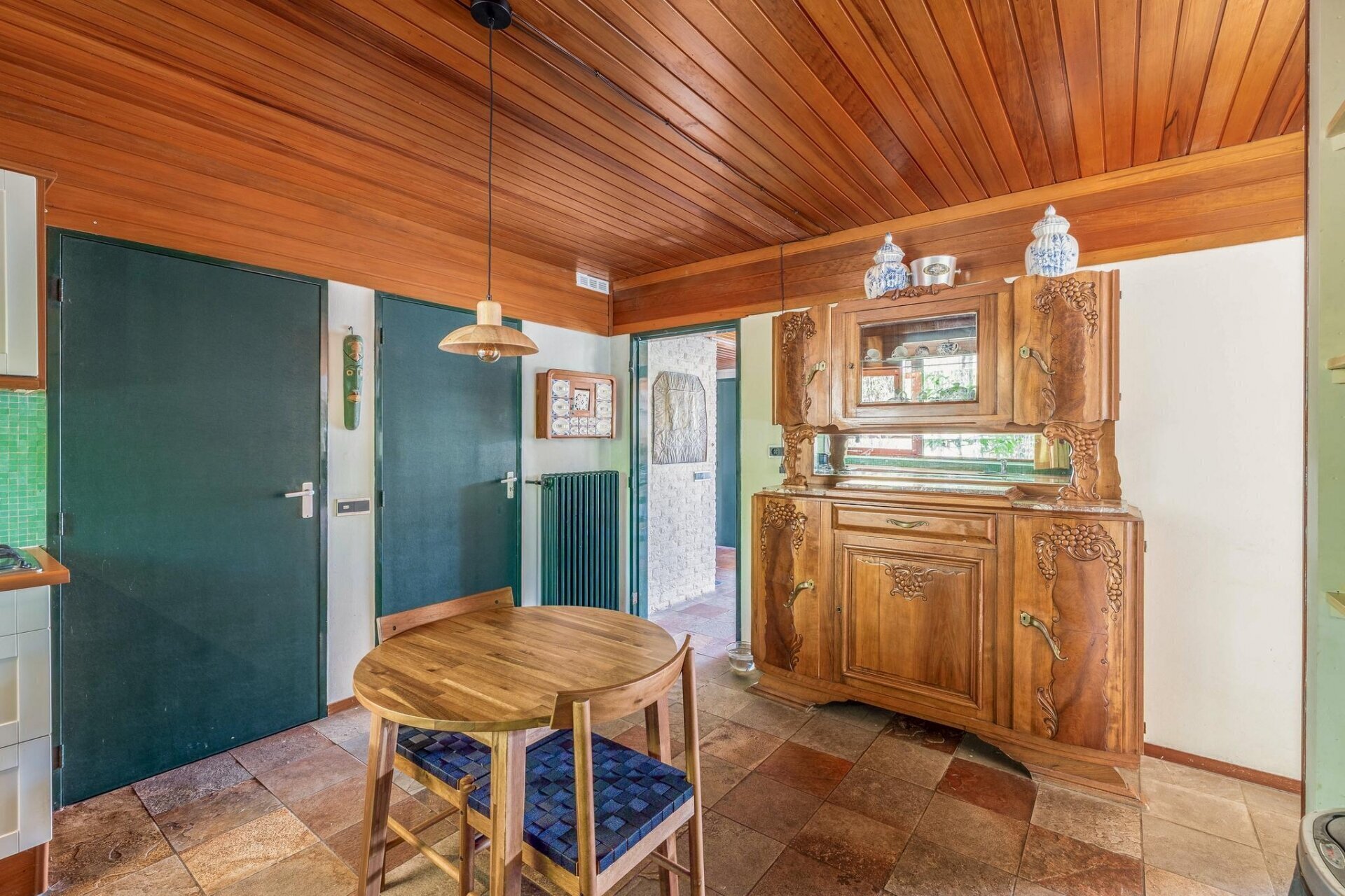 Inside, you’ll find a spacious, garden-oriented living room with large windows that bring in lots of light and offer views of the surrounding greenery. The warm atmosphere and generous layout provide plenty of options for different interior arrangements to suit your personal living style. The adjacent open-plan kitchen is roomy and forms the heart of the home.
