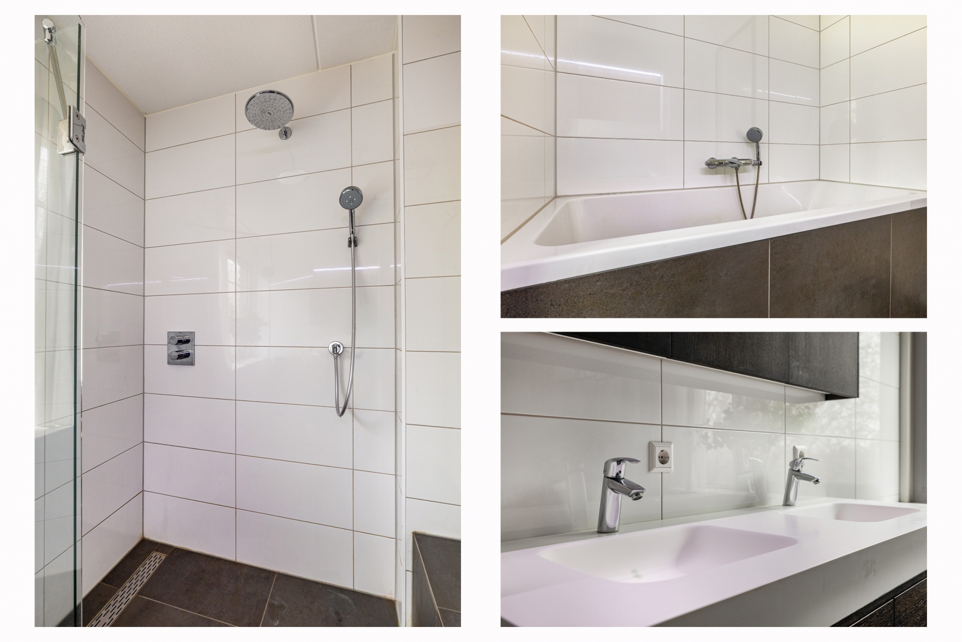 De ensuite badkamer is stijlvol en comfortabel ingericht en beschikt over een ligbad, ruime inloopdouche, dubbele wastafel en hoogwaardige afwerking. Alles is ruim opgezet en perfect passend bij de doelgroep die gelijkvloers wil wonen zonder concessies te doen aan luxe en comfort. De tweede badkamer is ideaal voor logees of (klein) gezin en zorgt ervoor dat iedereen hier zijn eigen plek heeft.