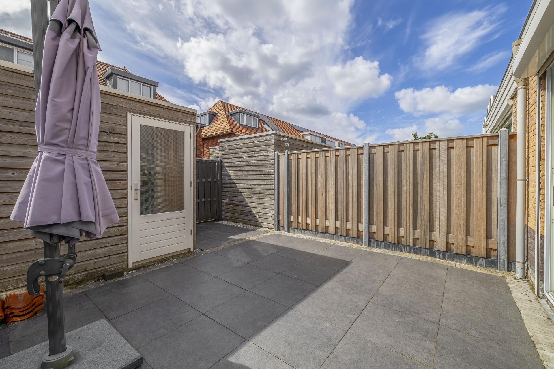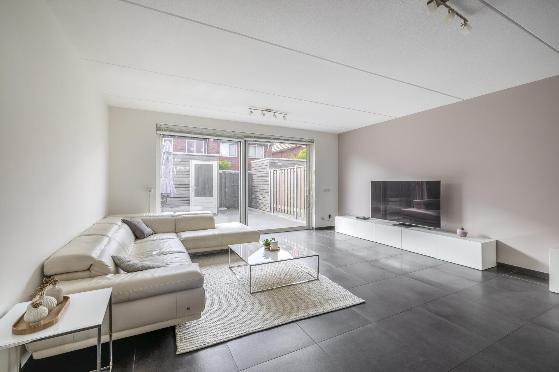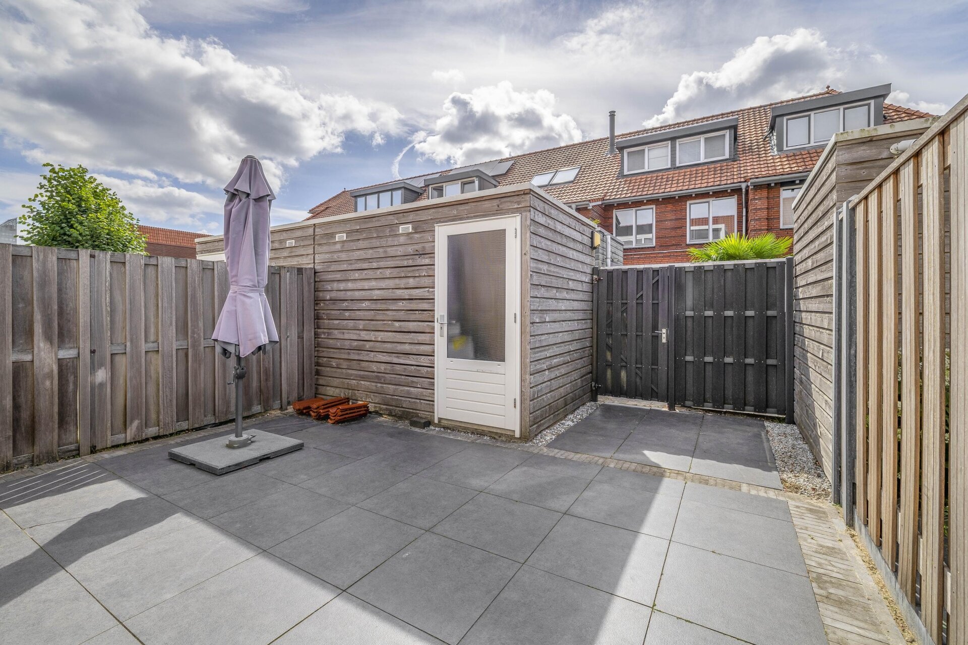 Dankzij de uitbouw biedt de woonkamer, voorzien van comfortabele vloerverwarming, volop ruimte voor zowel een eetgedeelte als een zithoek. Via de schuifpui bereikt u de zonnige, op het westen gelegen achtertuin. Deze is fraai aangelegd met grote tegels en beschikt over een houten berging en een praktische achterom.