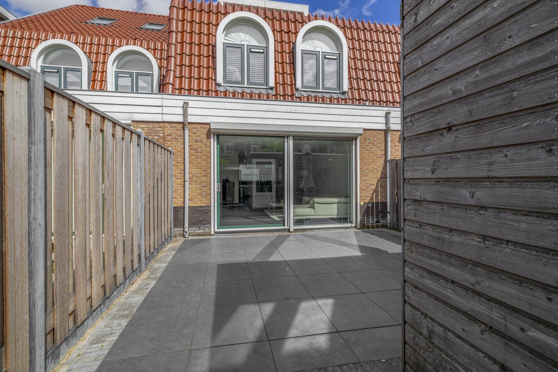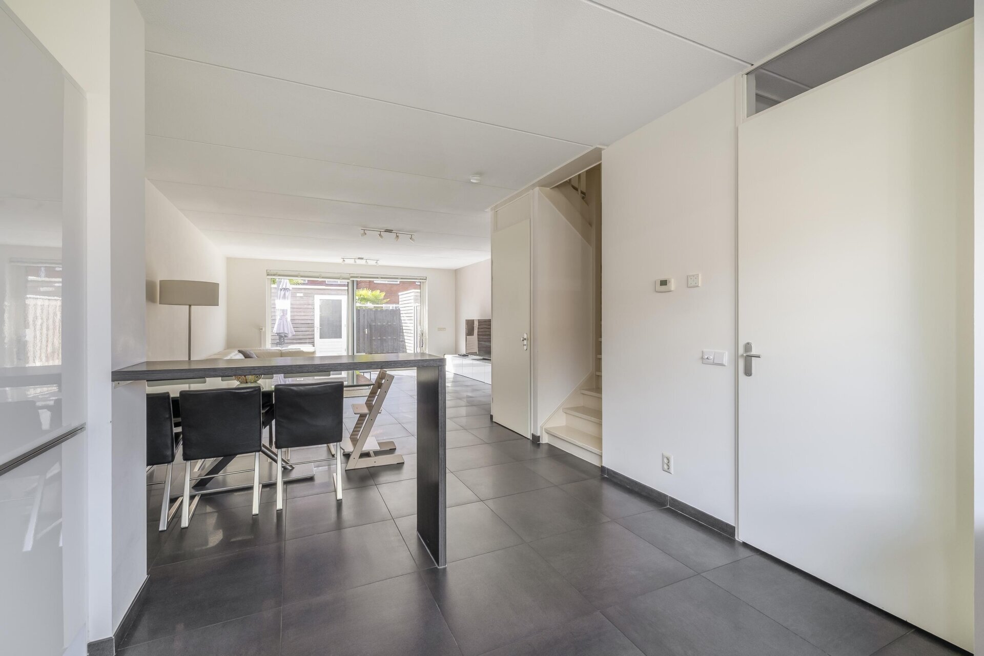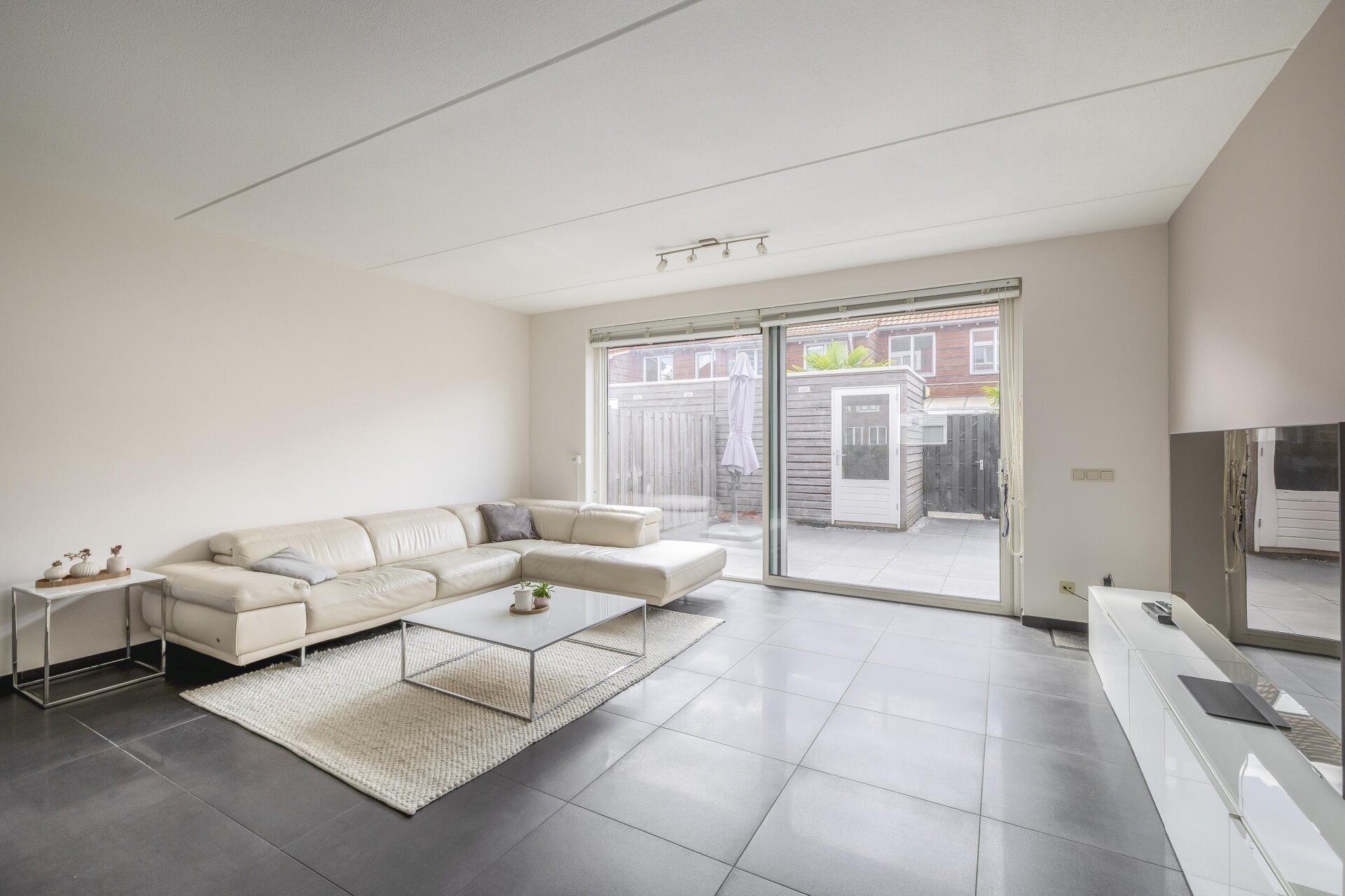 Dankzij de uitbouw biedt de woonkamer, voorzien van comfortabele vloerverwarming, volop ruimte voor zowel een eetgedeelte als een zithoek. Via de schuifpui bereikt u de zonnige, op het westen gelegen achtertuin. Deze is fraai aangelegd met grote tegels en beschikt over een houten berging en een praktische achterom.