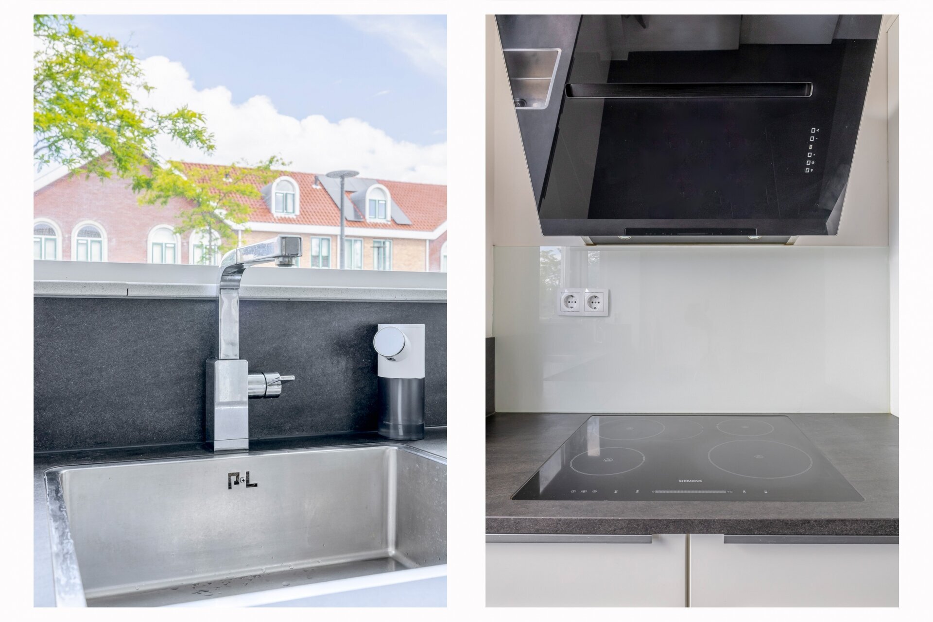 De ruime, open keuken is toegankelijk vanuit de hal en is voorzien van alle benodigde inbouwapparatuur, waaronder een vaatwasser, inductiekookplaat met afzuigschouw, combimagnetron en een geïntegreerde koelvriescombinatie.