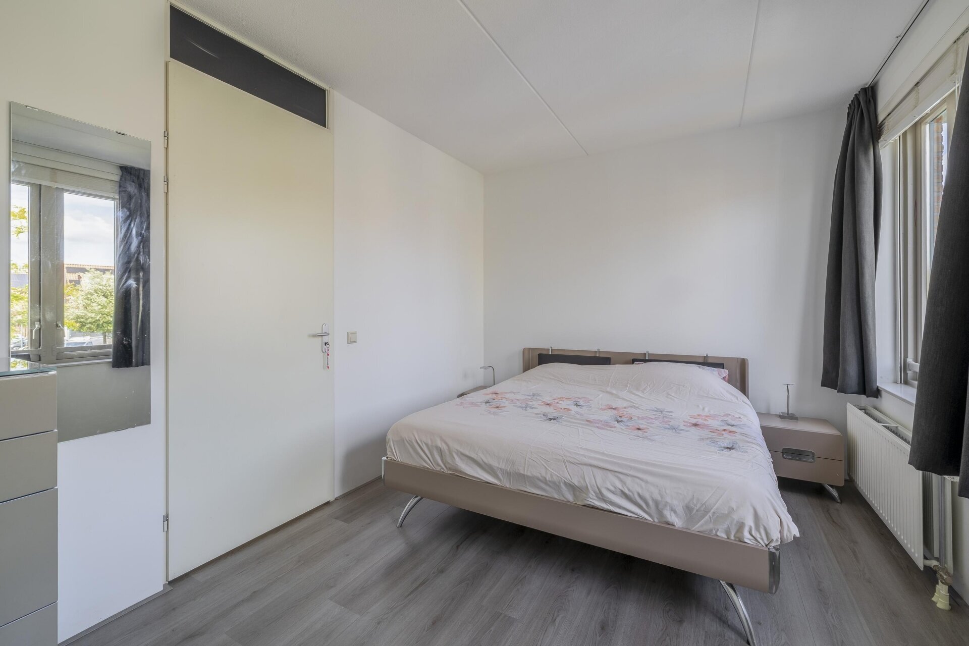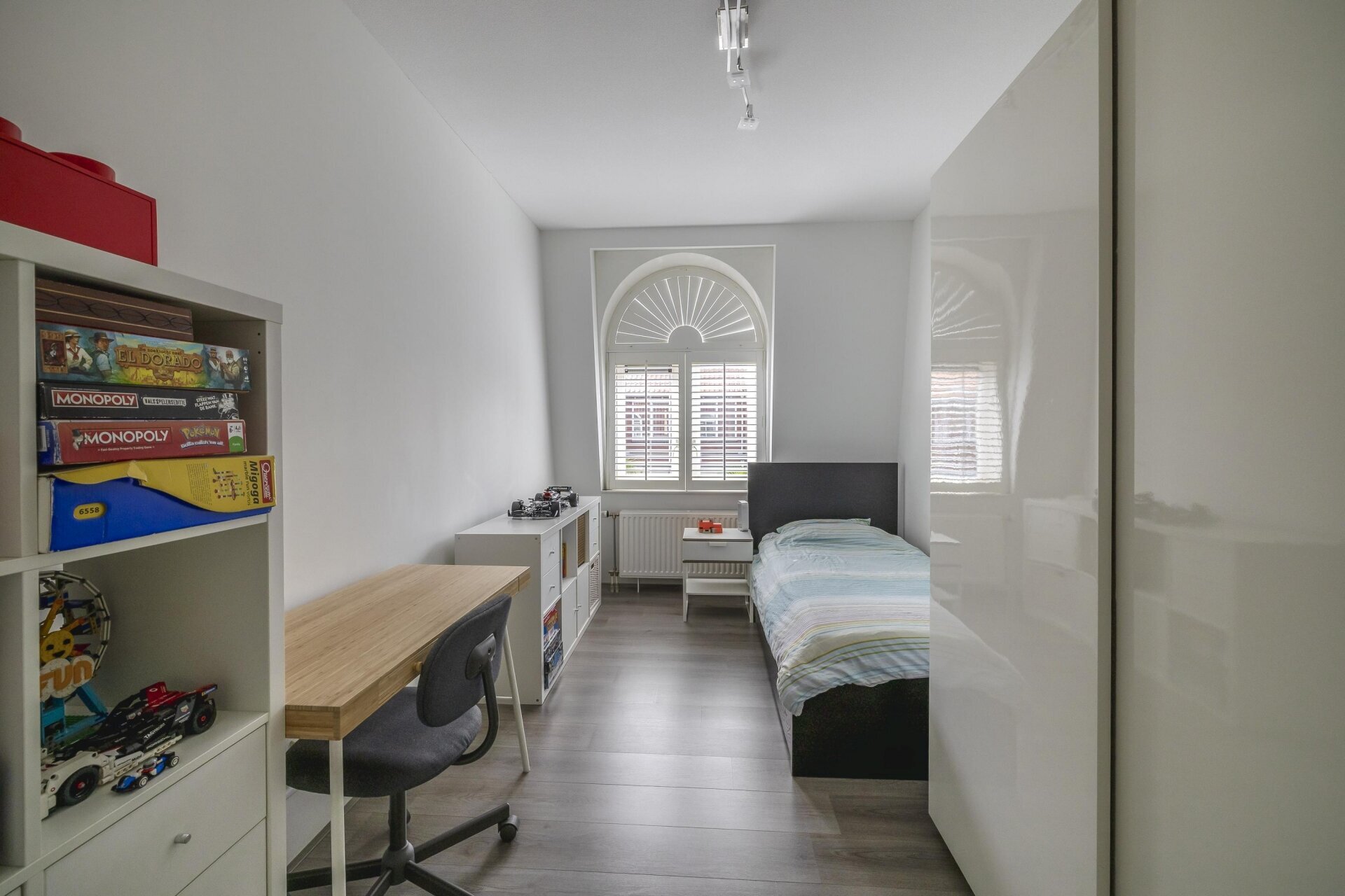 Via de trap in de woonkamer bereikt u de eerste verdieping. Vanaf de overloop zijn alle vertrekken toegankelijk. Aan de voorzijde bevindt zich de royale master bedroom, die zich uitstrekt over de volledige breedte van de woning en daardoor voldoende ruimte biedt voor een grote kledingkast of extra opbergruimte.