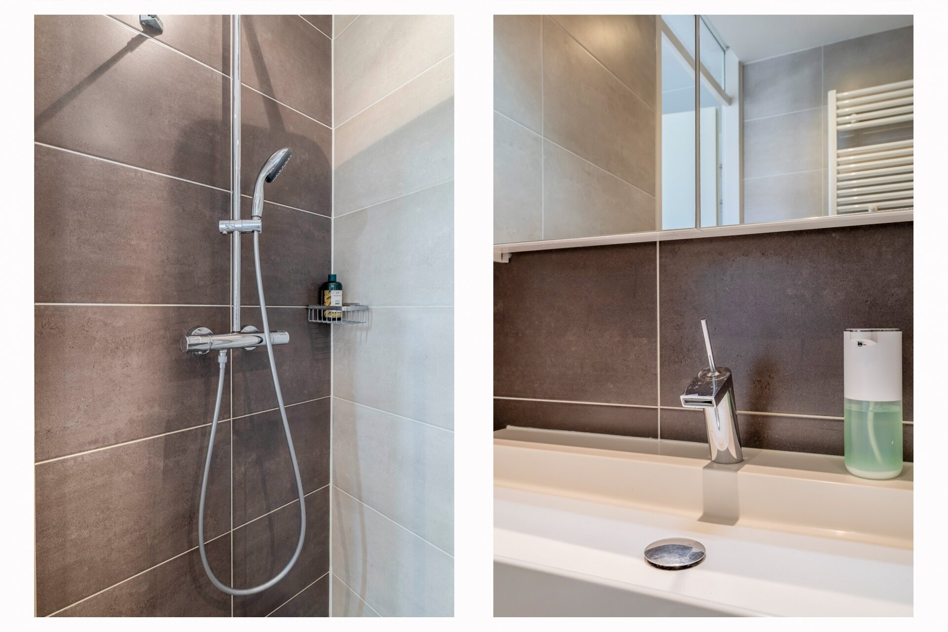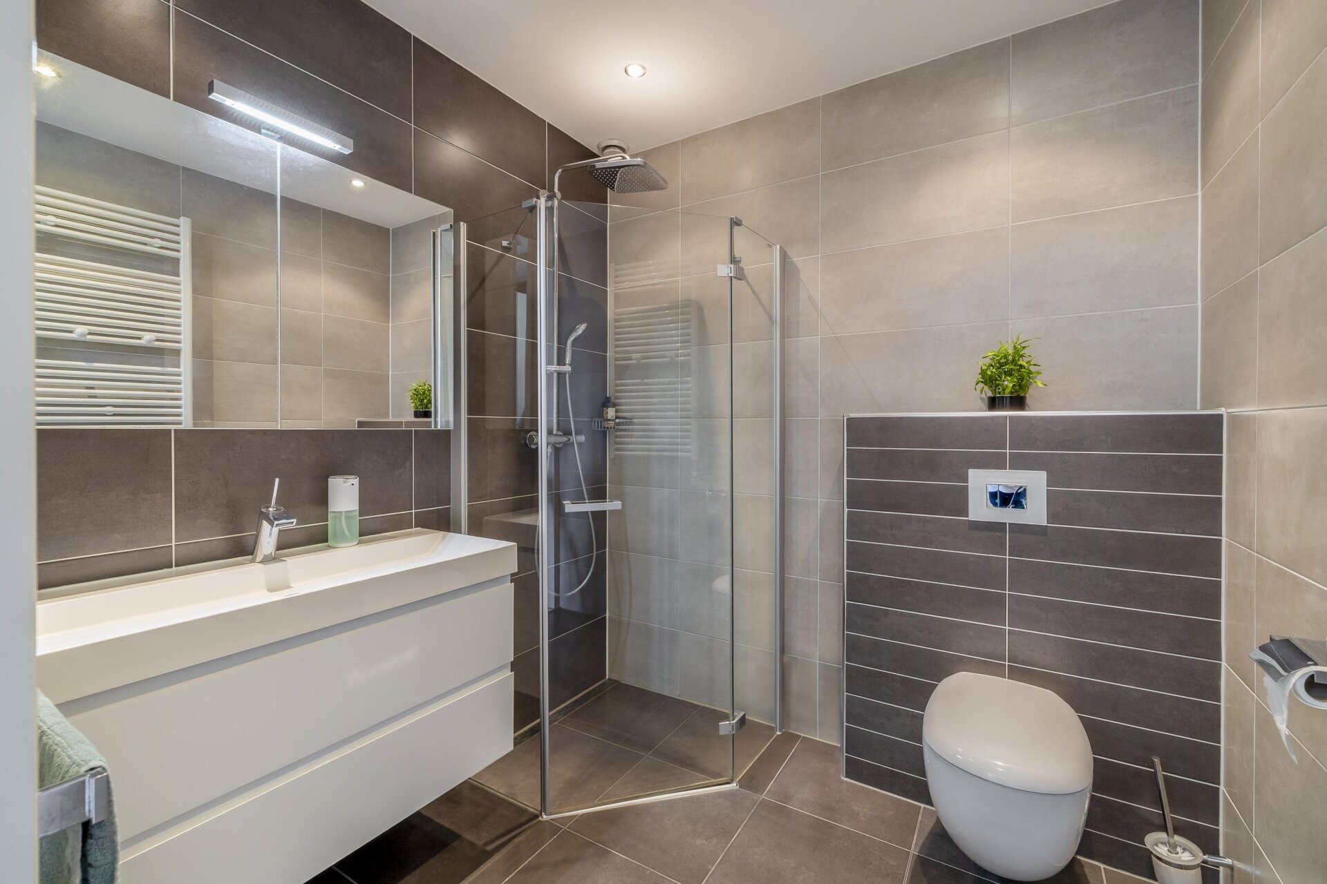 De badkamer is modern en strak afgewerkt en beschikt over een inloopdouche, een toilet en een stijlvol wastafelmeubel.