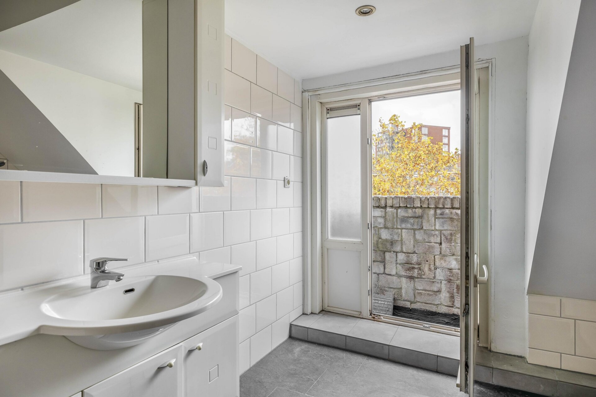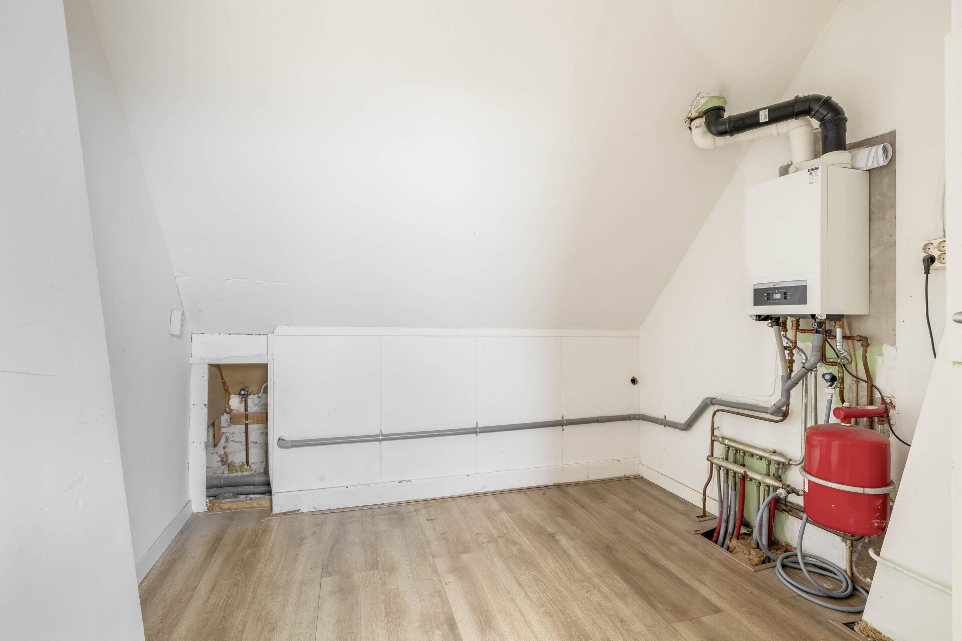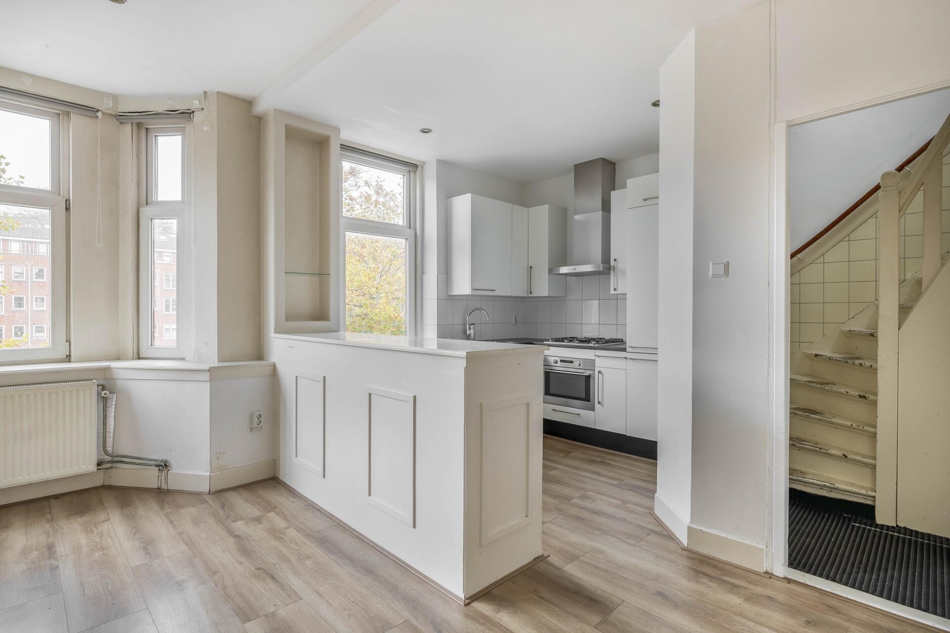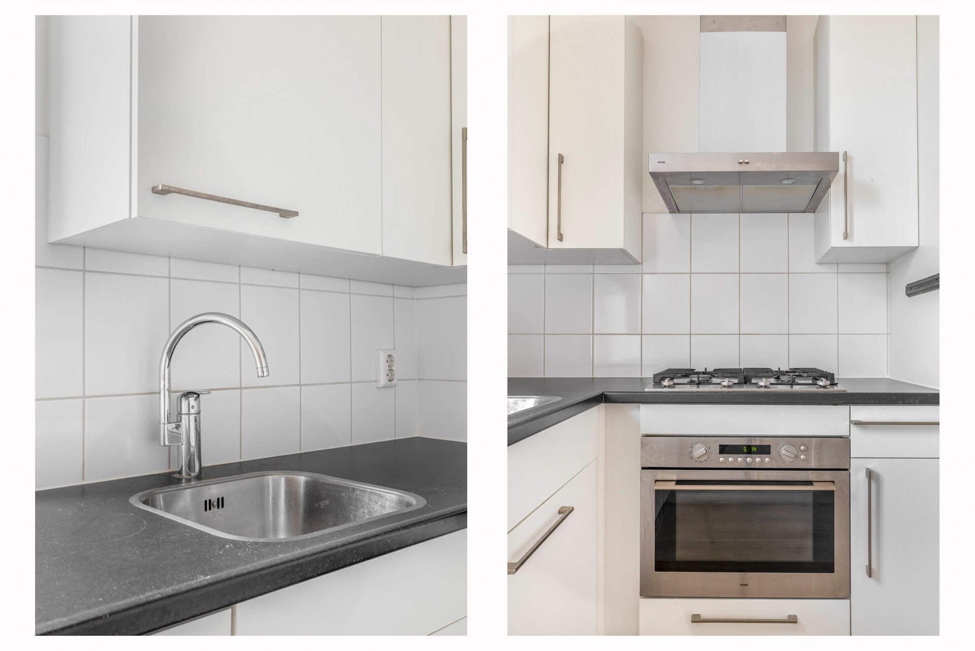 De keuken ligt aan de achterzijde en is praktisch ingericht, met voldoende kastruimte en plek voor apparatuur. De interne trap leidt naar de derde woonlaag, waar zich de slaapkamers bevinden. In totaal telt de woning vier kamers, waarvan drie te gebruiken zijn als slaapkamer en één als werk-, hobby- of logeerkamer. De badkamer is netjes en functioneel uitgevoerd met ruimte voor een wastafel en douche.