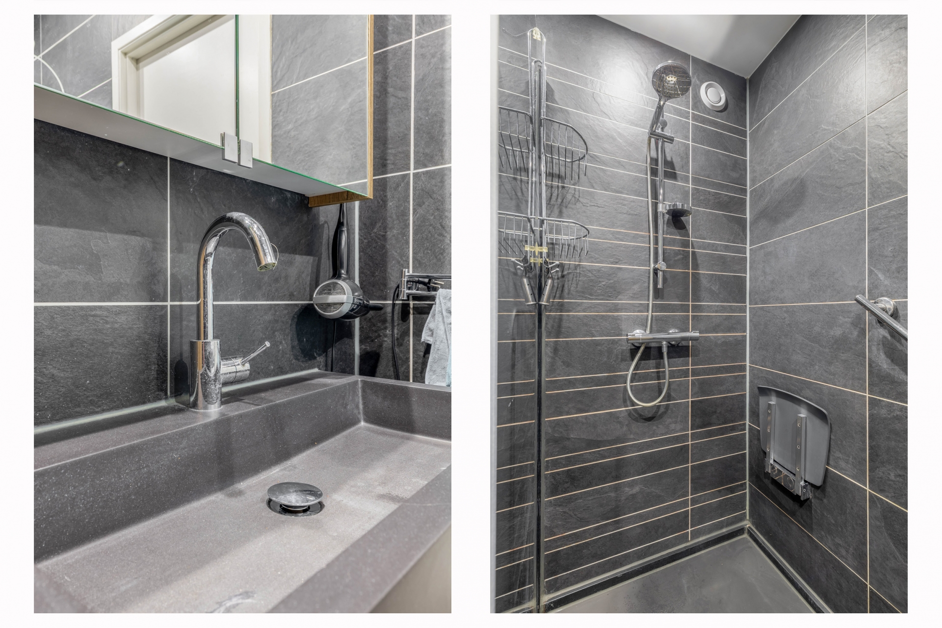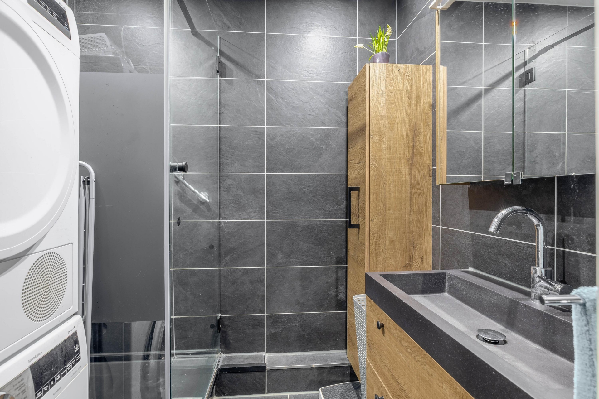 De badkamer is modern uitgevoerd en strak afgewerkt met donkere tegels en een stijlvol wastafelmeubel met houtaccenten. Dit geeft de ruimte een eigentijdse en luxe uitstraling. Daarnaast is de badkamer praktisch ingericht met een inloopdouche en aansluitingen voor wasmachine en droger.