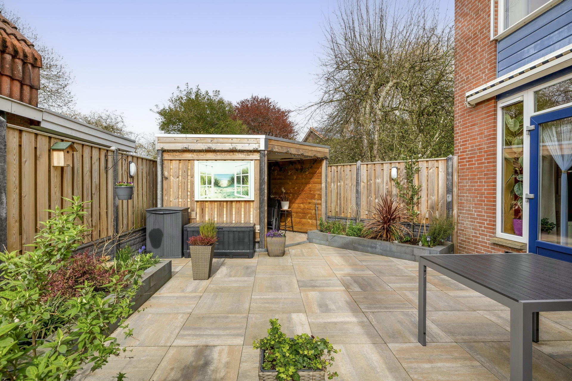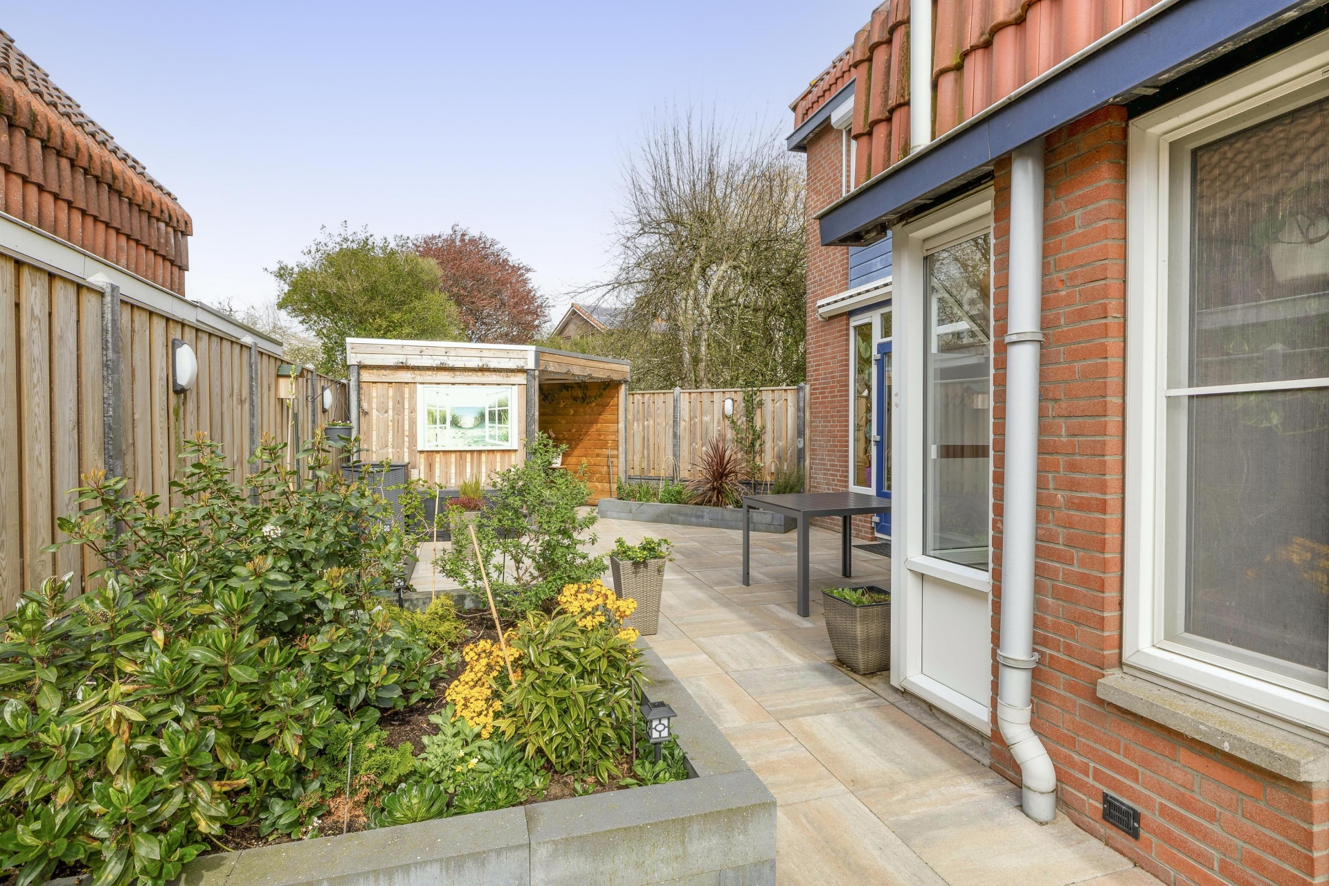 Achterin de tuin vind je een gezellige overkapping die zorgt voor extra leefruimte buiten. Of je nu beschut wilt zitten bij minder weer of juist langer wilt genieten op een zwoele zomeravond, deze plek maakt het mogelijk.