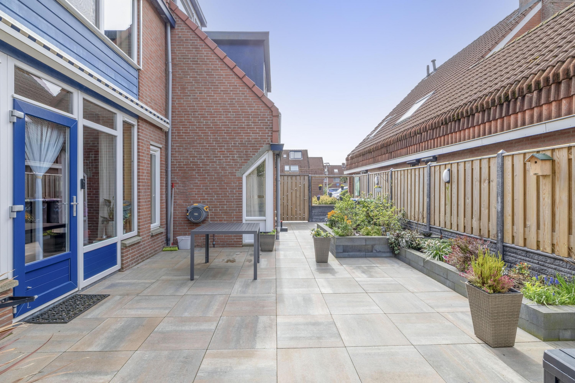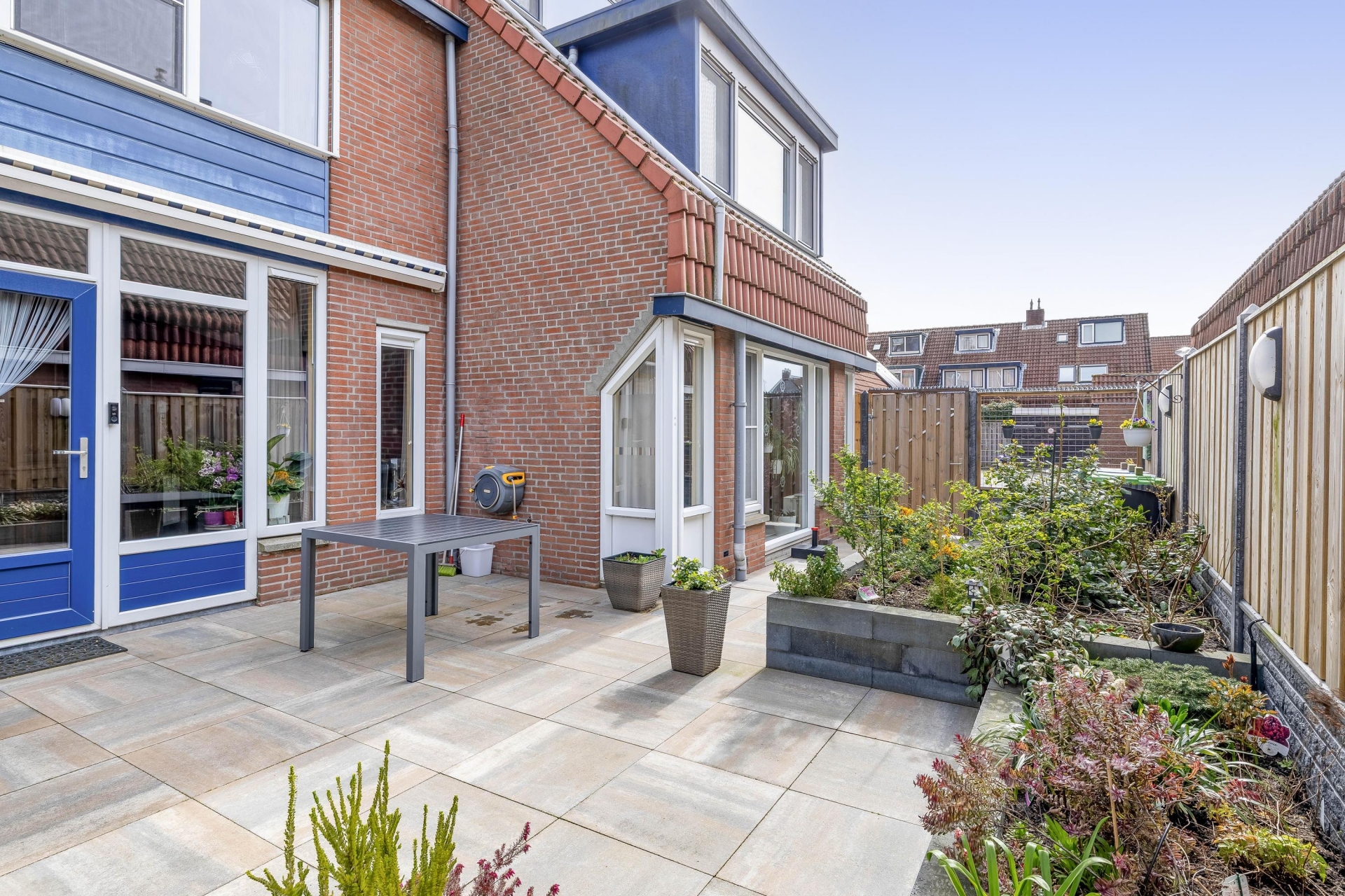 De achtertuin is verzorgd aangelegd en ligt op het westen, waardoor je hier volop van de middag- en avondzon kunt genieten. Dankzij de combinatie van bestrating en groen is de tuin onderhoudsvriendelijk en toch sfeervol ingericht.