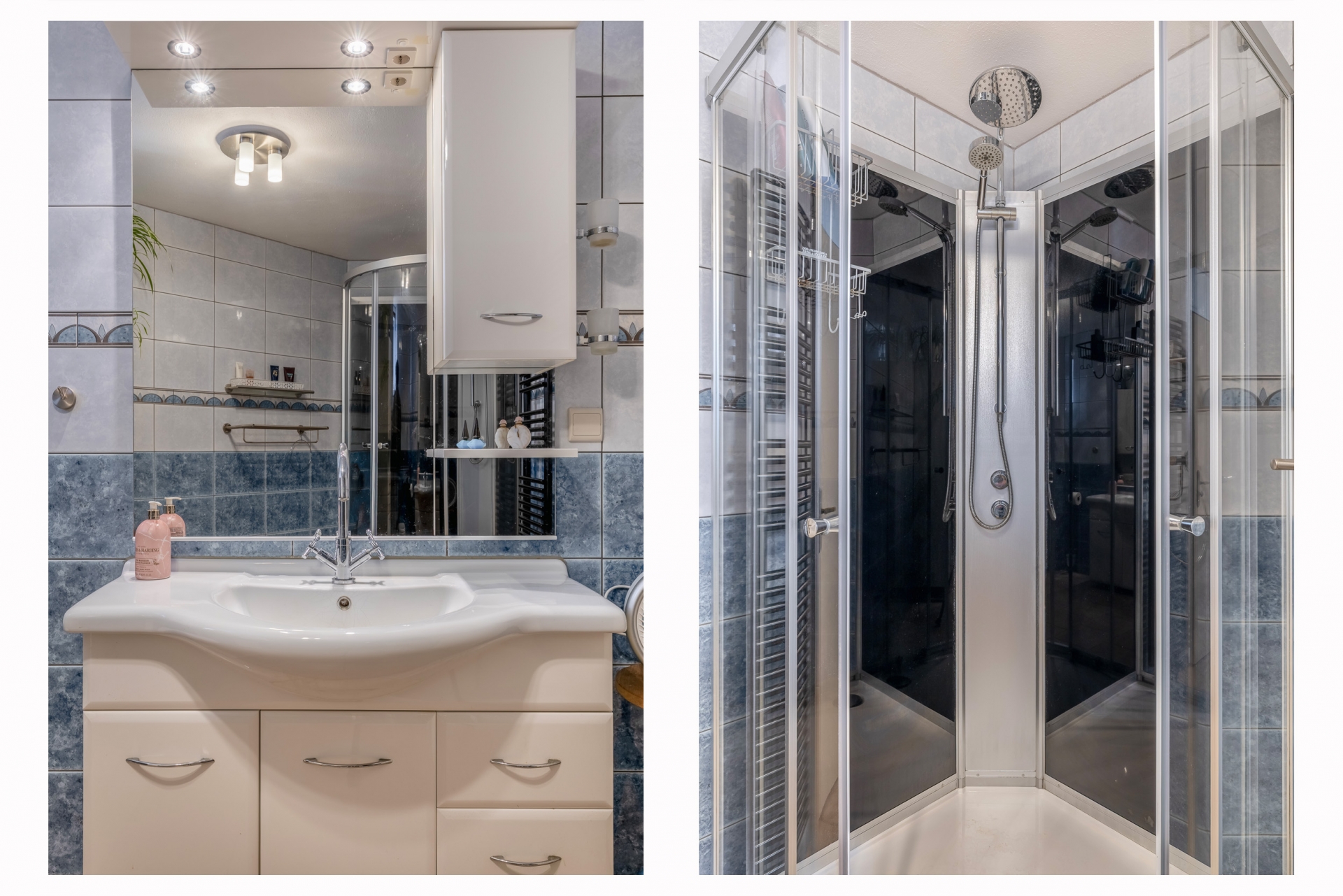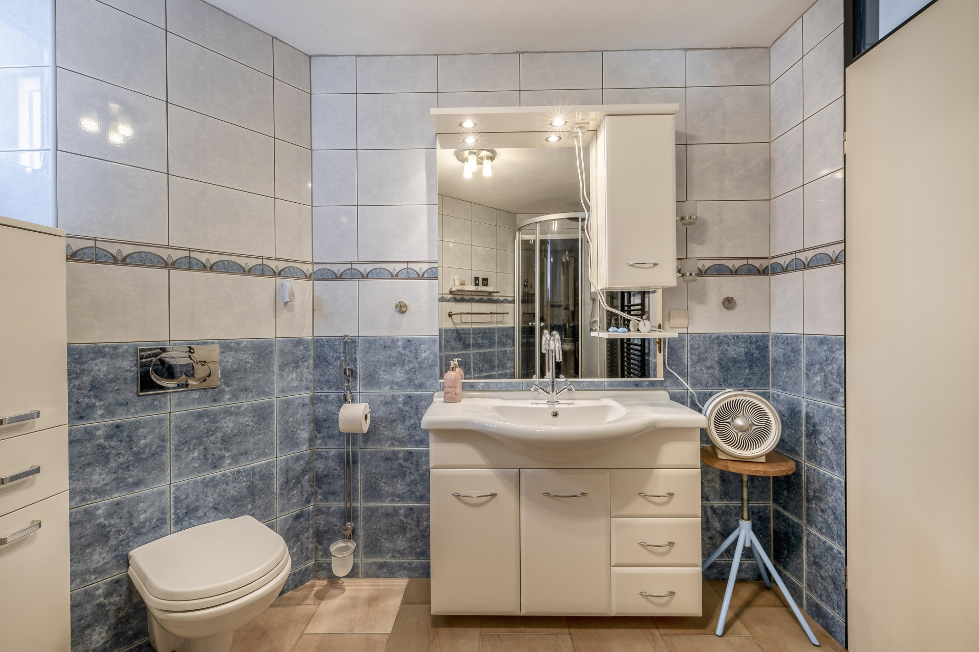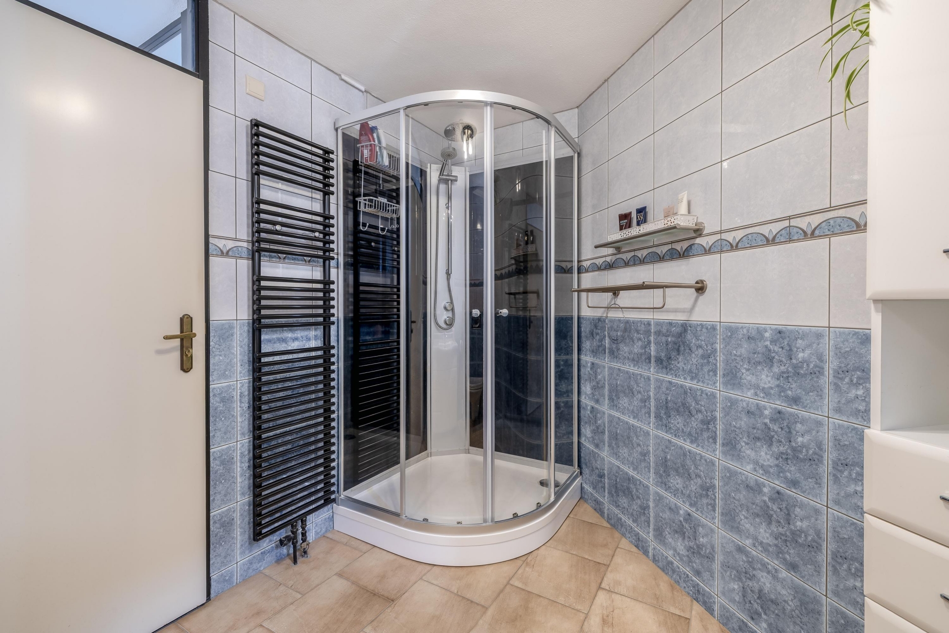 De badkamer is compleet uitgevoerd met een douche, wastafelmeubel en toilet. Netjes onderhouden en praktisch ingericht, met mogelijkheden om het naar eigen smaak te moderniseren.