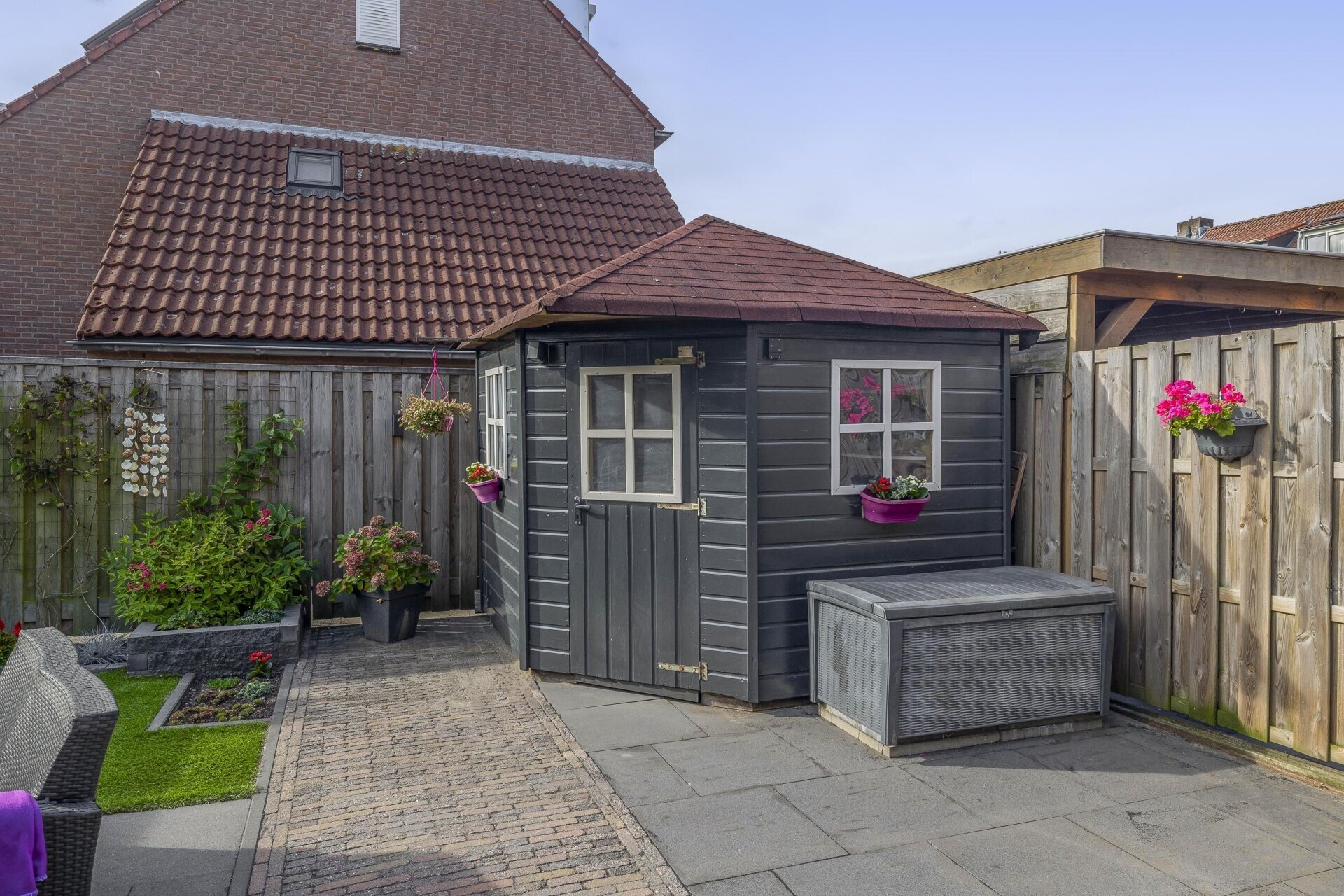 Stap je via de achterdeur naar buiten, dan sta je meteen in een heerlijke tuin op het zuiden. De tuin is met zorg ingericht: mooie bestrating, borders met beplanting, een groot terras én een vrijstaande houten berging maken dit tot een plek waar je ’s zomers het liefst de hele dag doorbrengt. Dankzij de ligging op het zuiden zit je hier al snel in de zon. Met genoeg ruimte voor een loungeset, barbecue en speelhoek is dit een tuin die past bij het gezinsleven én bij lekker buiten leven.