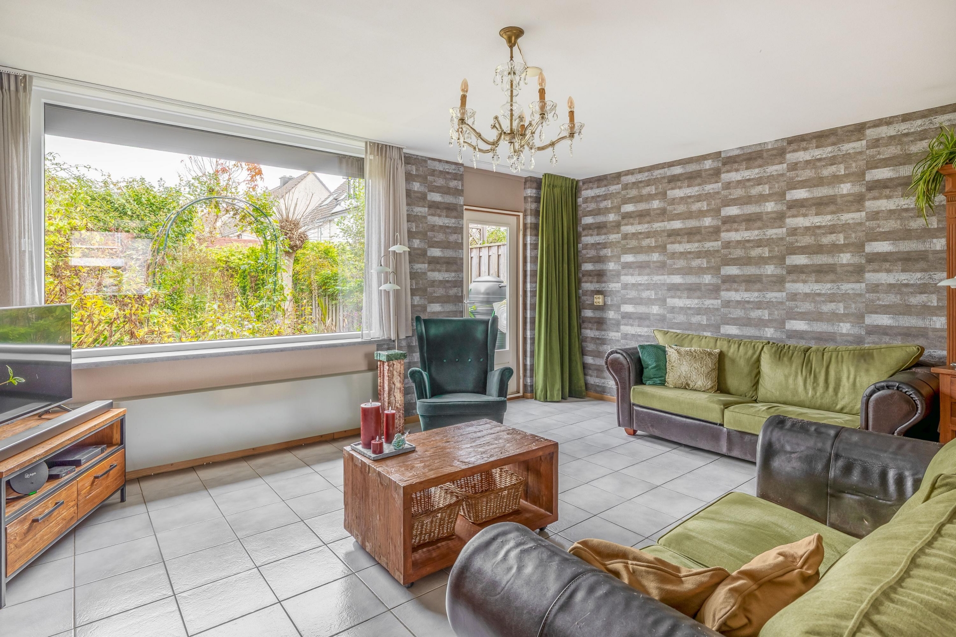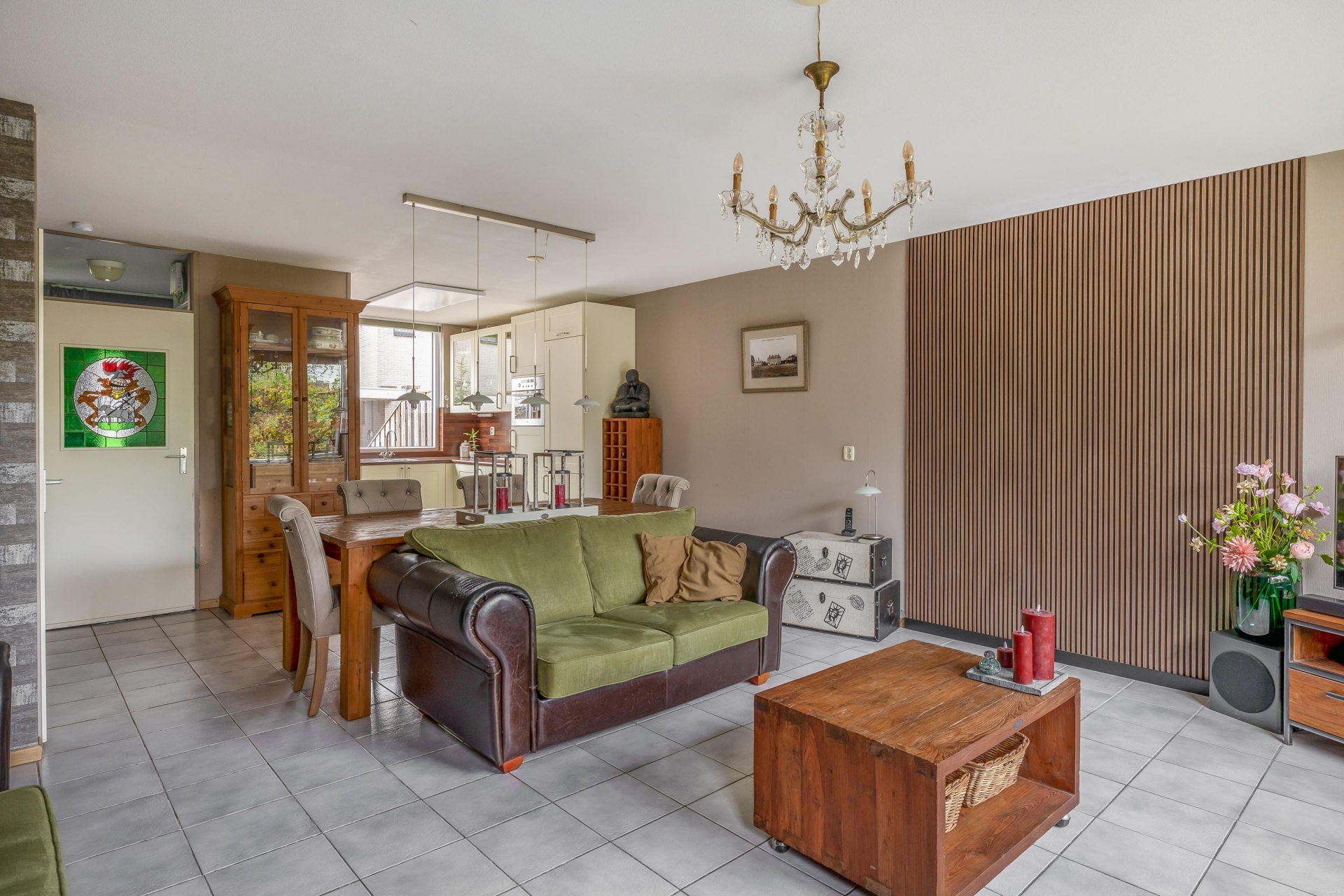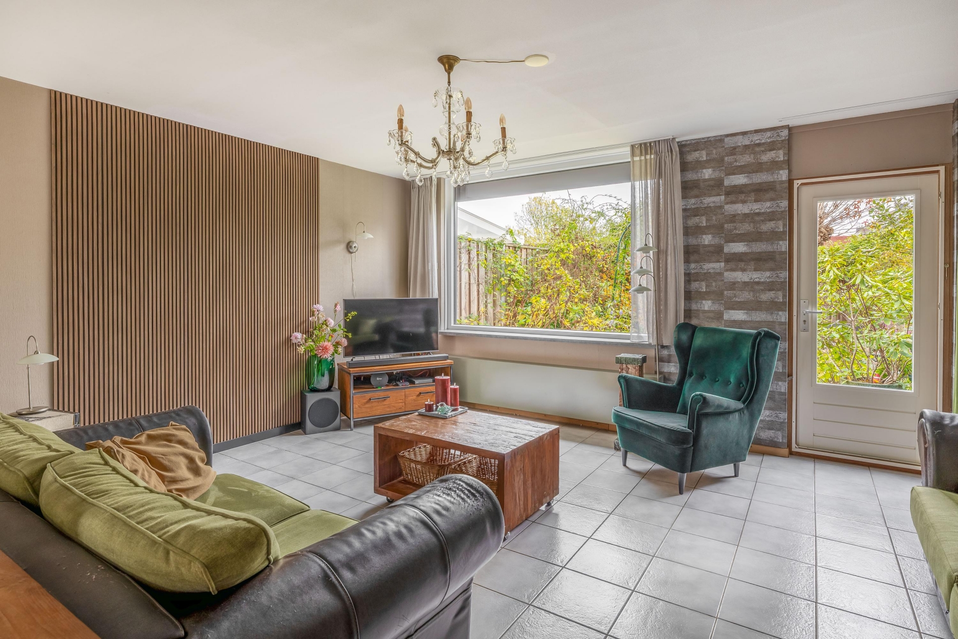 De woonkamer is tuingericht en heeft dankzij de grote raampartijen een mooie lichtinval. Er is voldoende ruimte voor een royale zithoek en een gezellige eethoek. De vloer is neutraal betegeld en vormt samen met de lichte wandafwerking een rustige basis. Via de achterdeur stap je zo de tuin in.