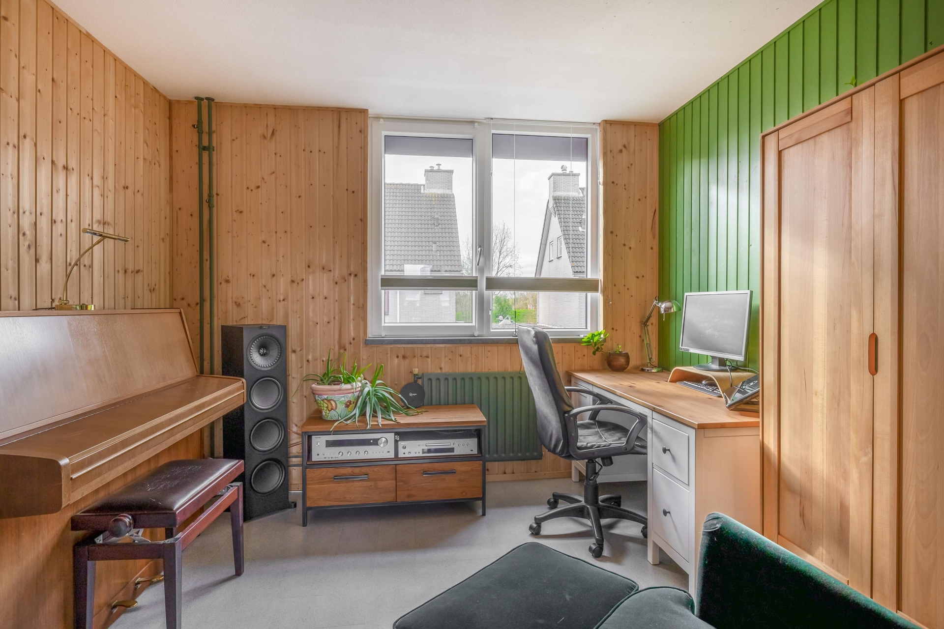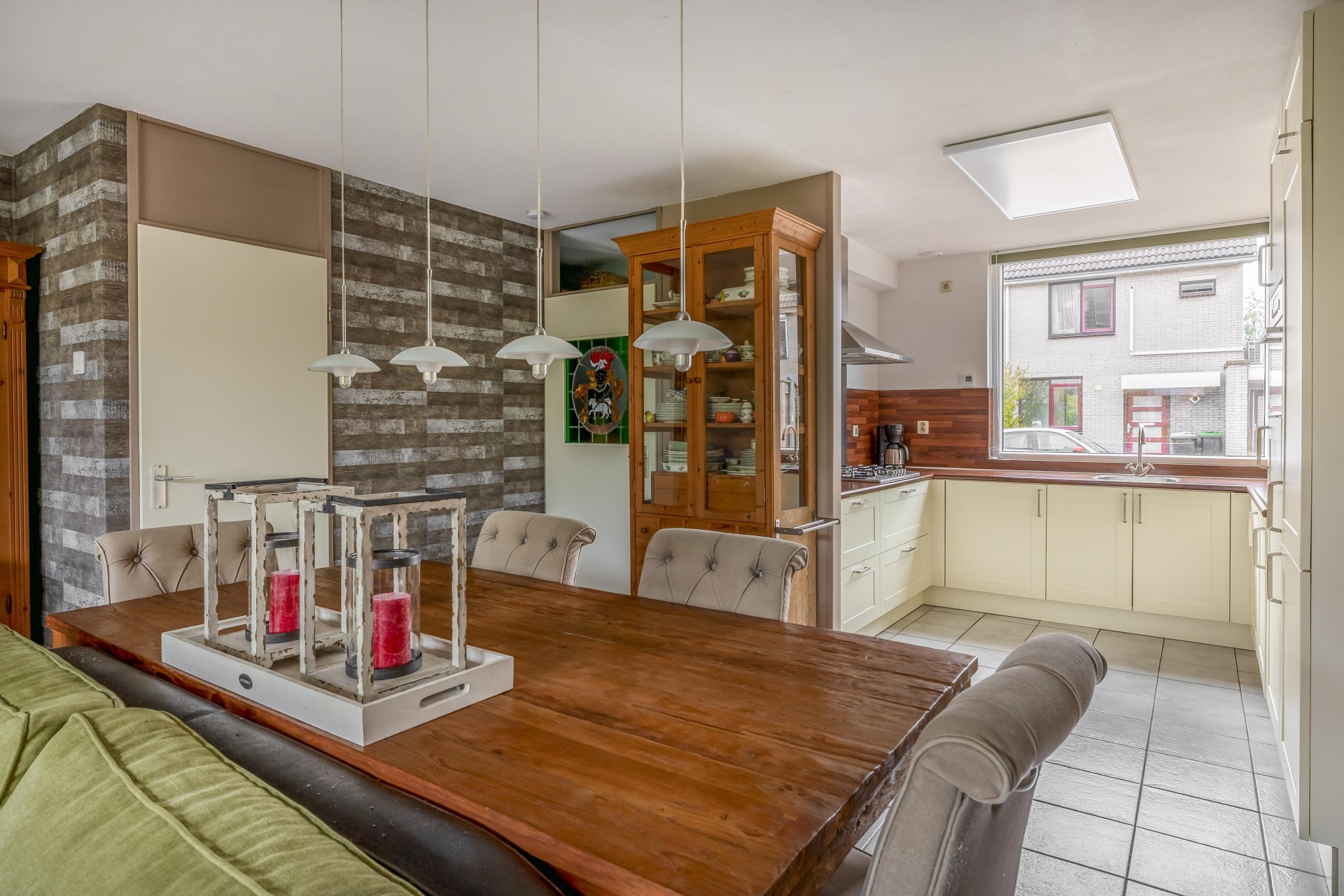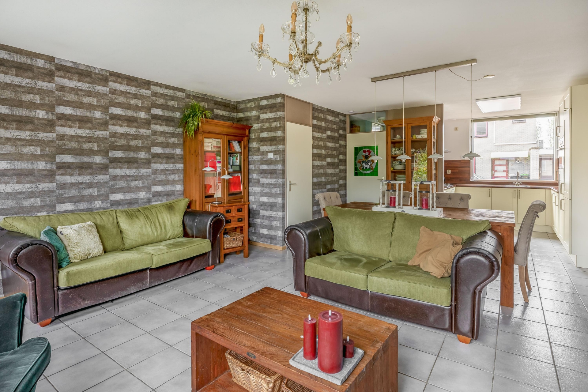 De woonkamer is tuingericht en heeft dankzij de grote raampartijen een mooie lichtinval. Er is voldoende ruimte voor een royale zithoek en een gezellige eethoek. De vloer is neutraal betegeld en vormt samen met de lichte wandafwerking een rustige basis. Via de achterdeur stap je zo de tuin in.