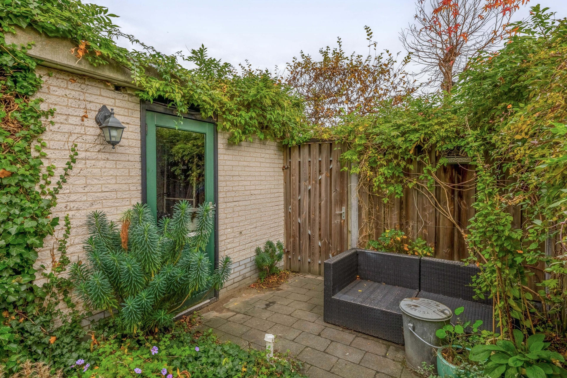De achtertuin is natuurlijk aangelegd en biedt verrassend veel privacy door het vele groen. Dankzij de diepte van bijna 10 meter is er altijd wel een plekje in de zon of schaduw te vinden. De ligging op het noordoosten betekent dat je ’s ochtends en aan het begin van de middag kunt genieten van de zon. Achterin de tuin staat een vrijstaande stenen berging met elektra – ideaal voor je fiets of tuinspullen – en via de achterom loop je zo naar het achterpad.