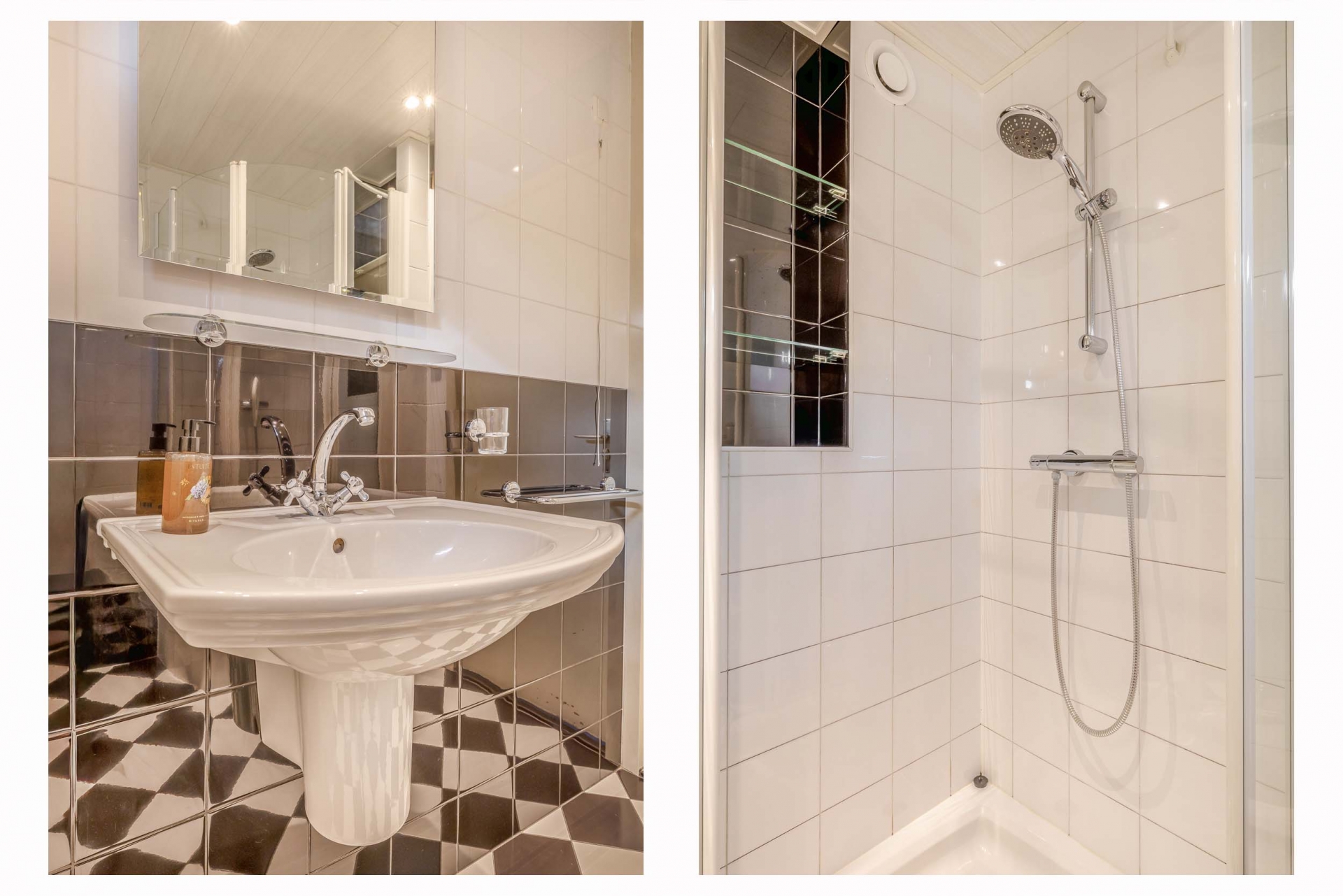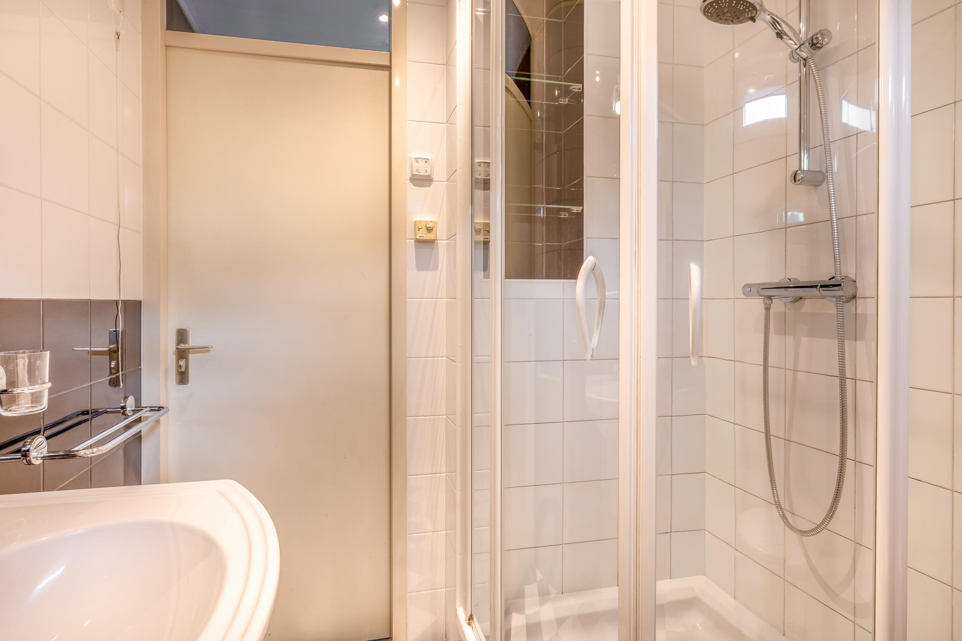 De badkamer is compact maar compleet, met een douchecabine, toilet en wastafelmeubel. Alles is keurig betegeld in een lichte kleurstelling en goed onderhouden.