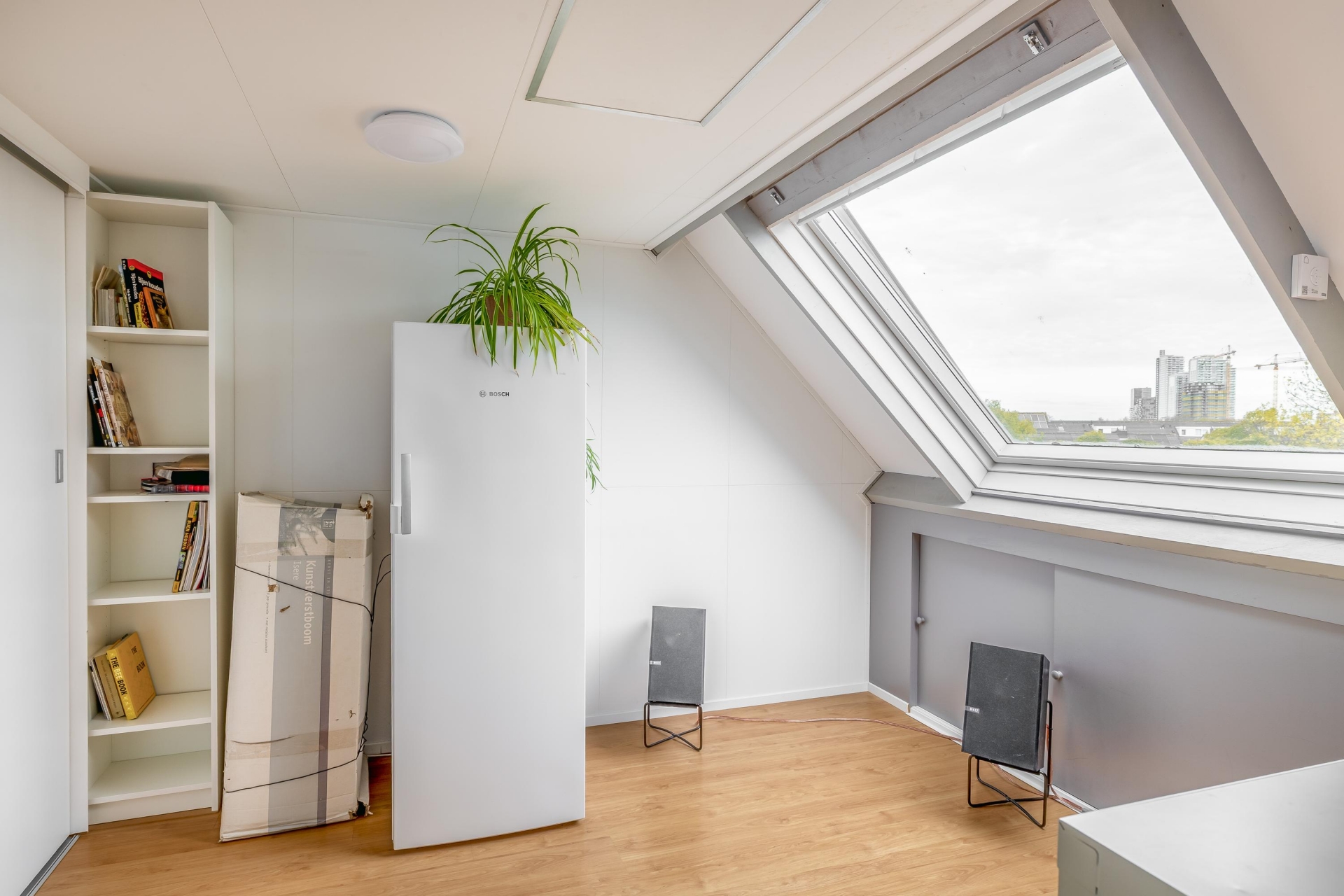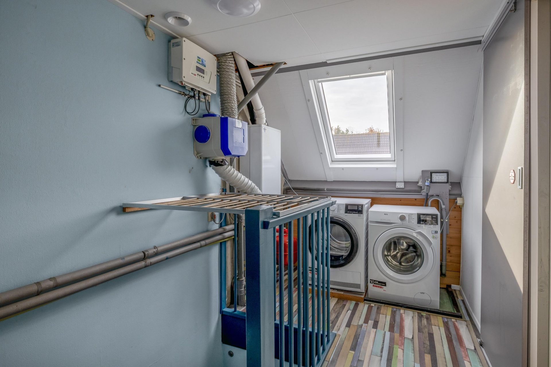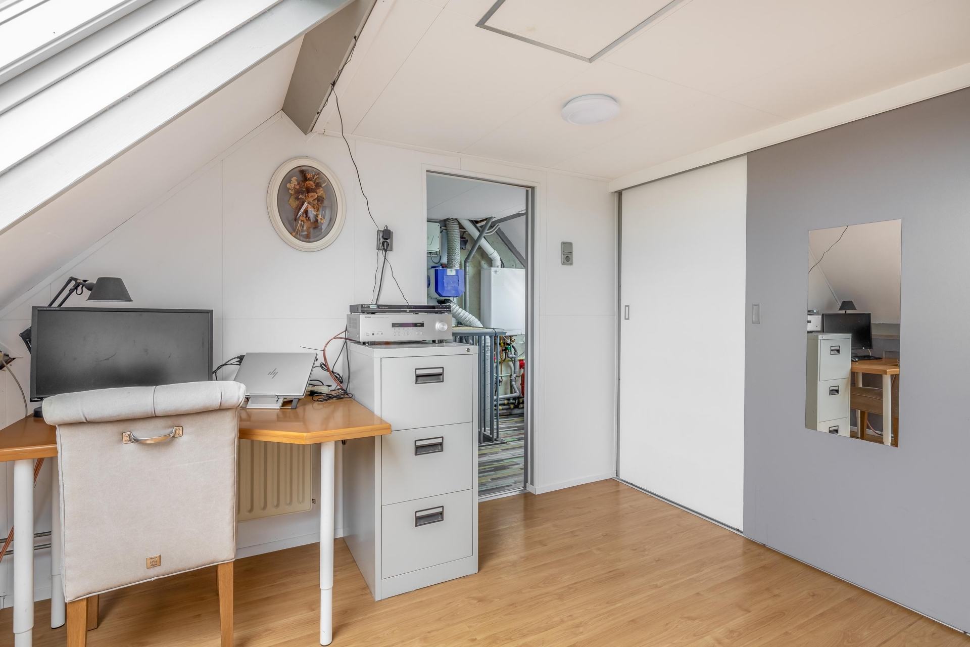 De zolderverdieping is ook keurig verzorgt. Hier vind je de vierde slaapkamer met groot dakvenster én de overloop met was-/stookruimte met de opstelplaats voor wasmachine, droger en de Intergas HR combiketel (2022). De zolder is netjes afgewerkt en voorzien van extra bergruimte.