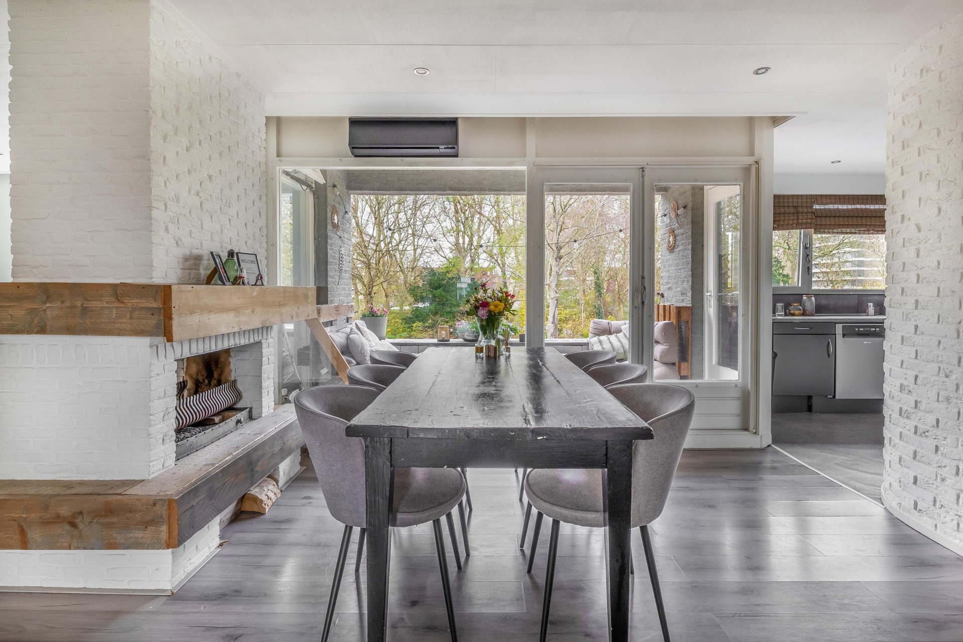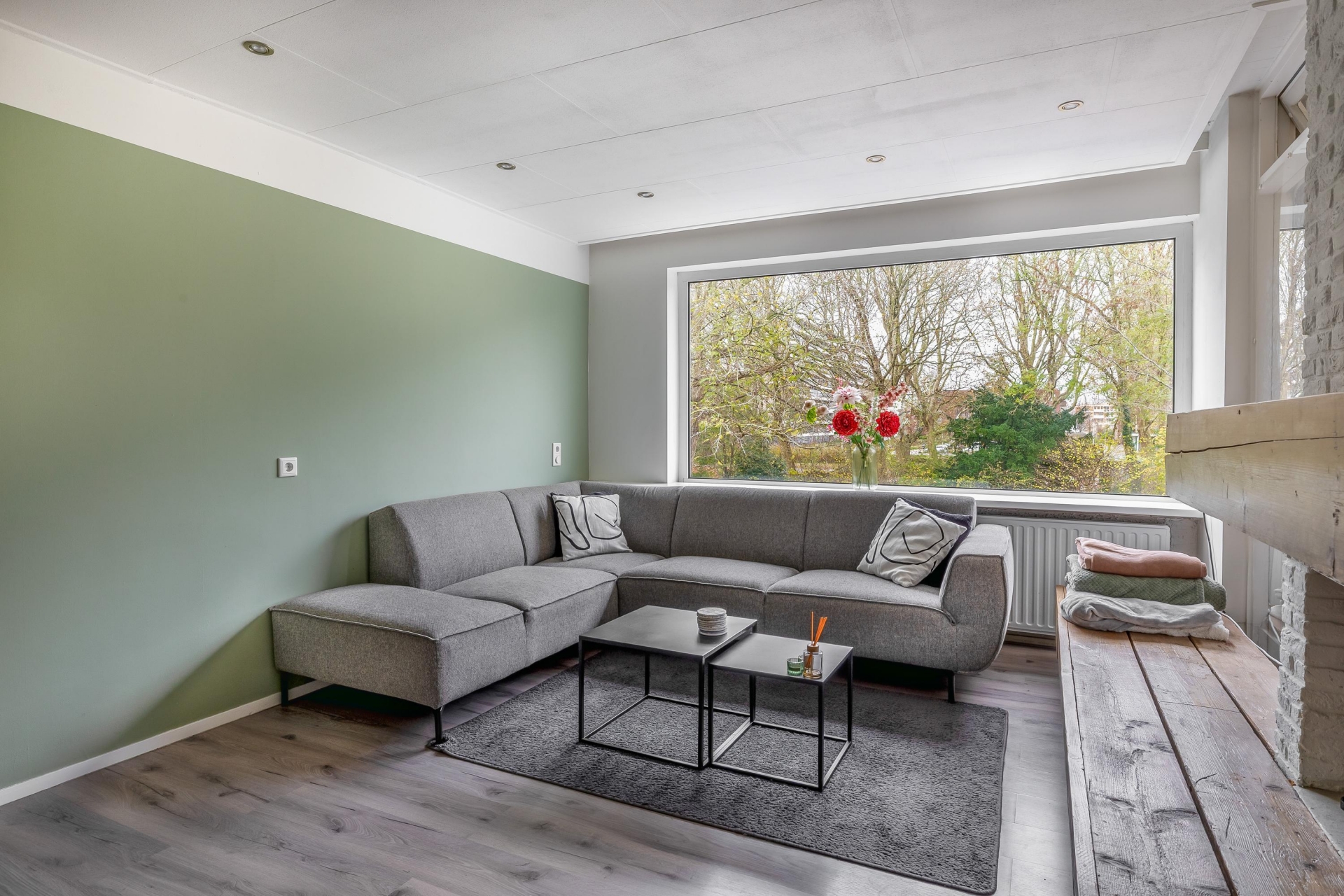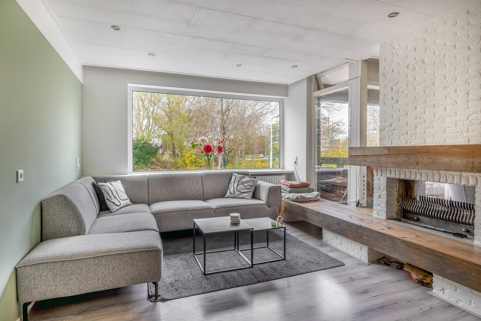 De woonkamer is ruim en licht, met genoeg plek voor een grote zithoek én een royale eettafel. De sfeervolle afwerking, zoals de houten details bij de haard en het rustige kleurgebruik, zorgen voor een warme uitstraling. Grote ramen aan de voorzijde geven zicht op het park aan de overkant van de straat. Een uitzicht dat nét even dat extra’s geeft aan het woongedeelte.