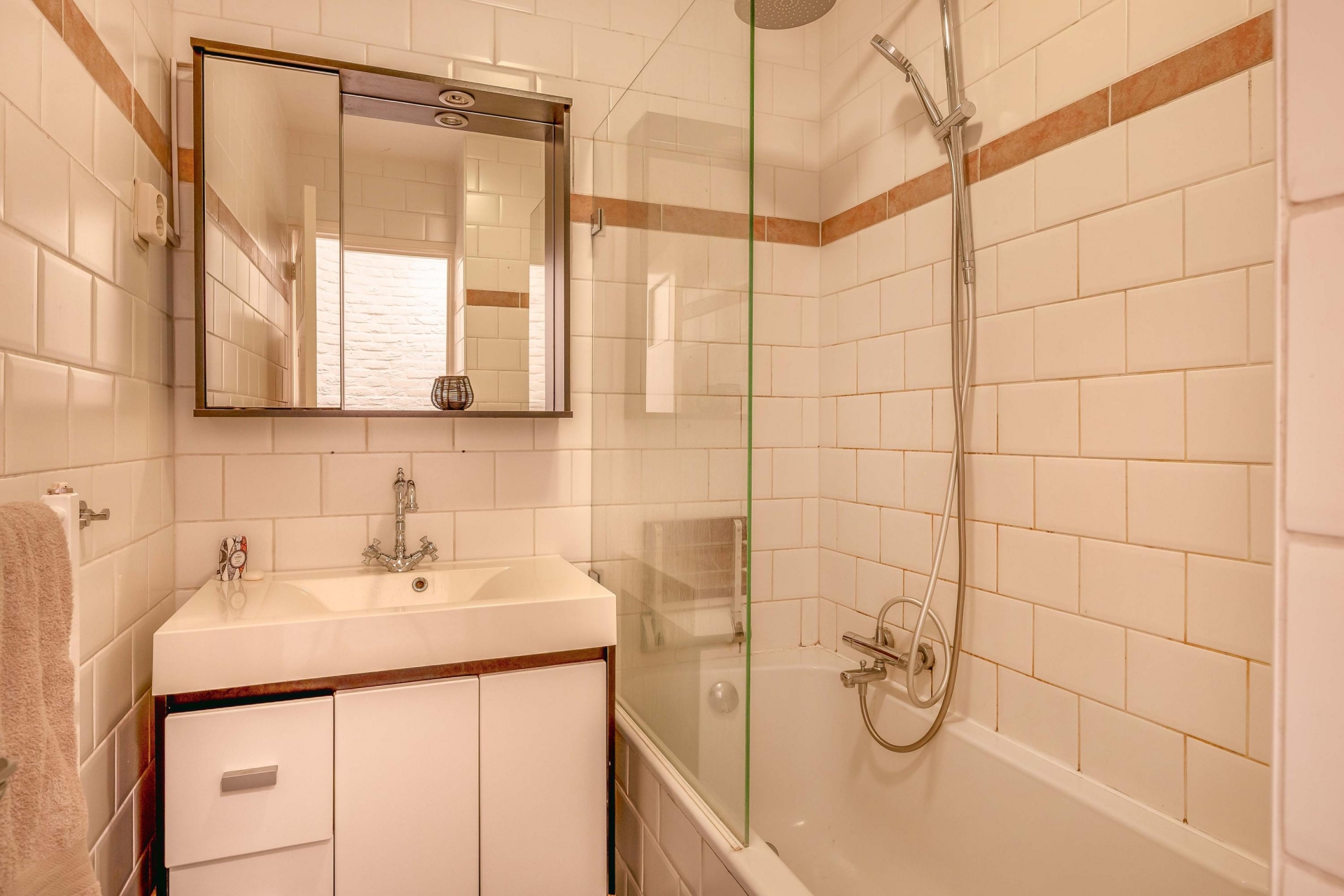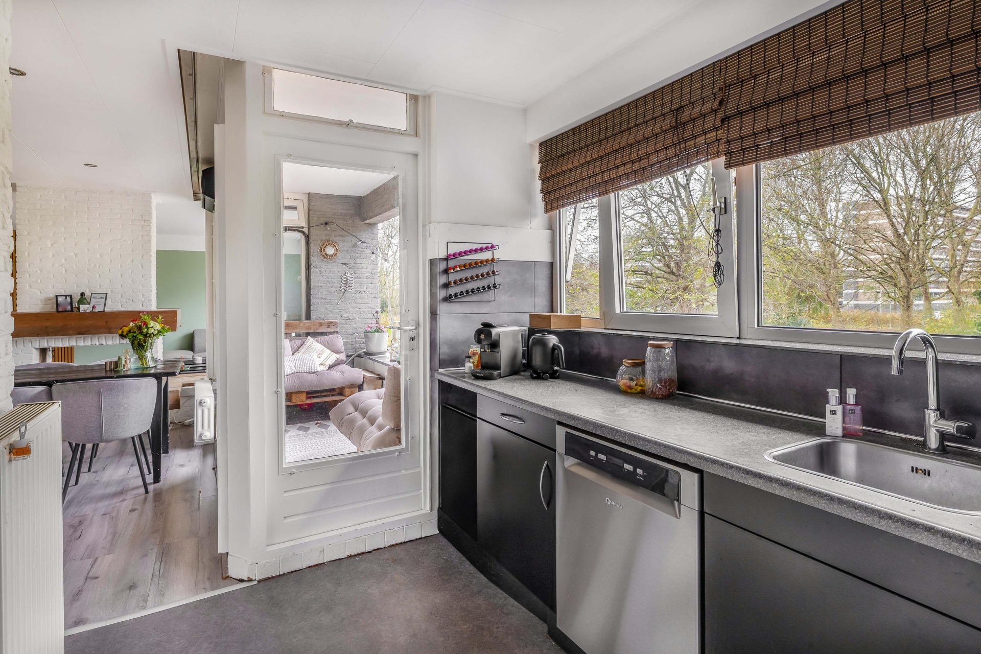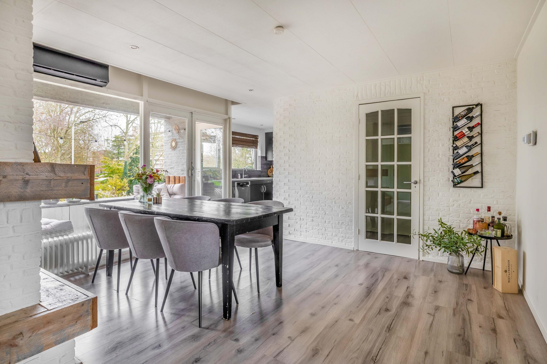 De woonkamer is ruim en licht, met genoeg plek voor een grote zithoek én een royale eettafel. De sfeervolle afwerking, zoals de houten details bij de haard en het rustige kleurgebruik, zorgen voor een warme uitstraling. Grote ramen aan de voorzijde geven zicht op het park aan de overkant van de straat. Een uitzicht dat nét even dat extra’s geeft aan het woongedeelte.