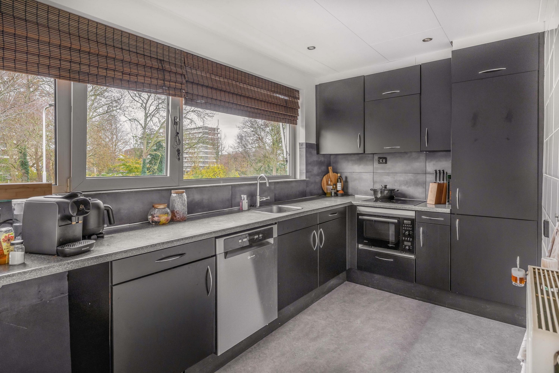 Het balkon ligt op het zuidoosten, wat betekent dat je hier heerlijk van de zon kunt genieten. Door de ligging aan de voorzijde kijk je richting het groen en de volwassen bomen van het tegenovergelegen park, wat een ontspanning!