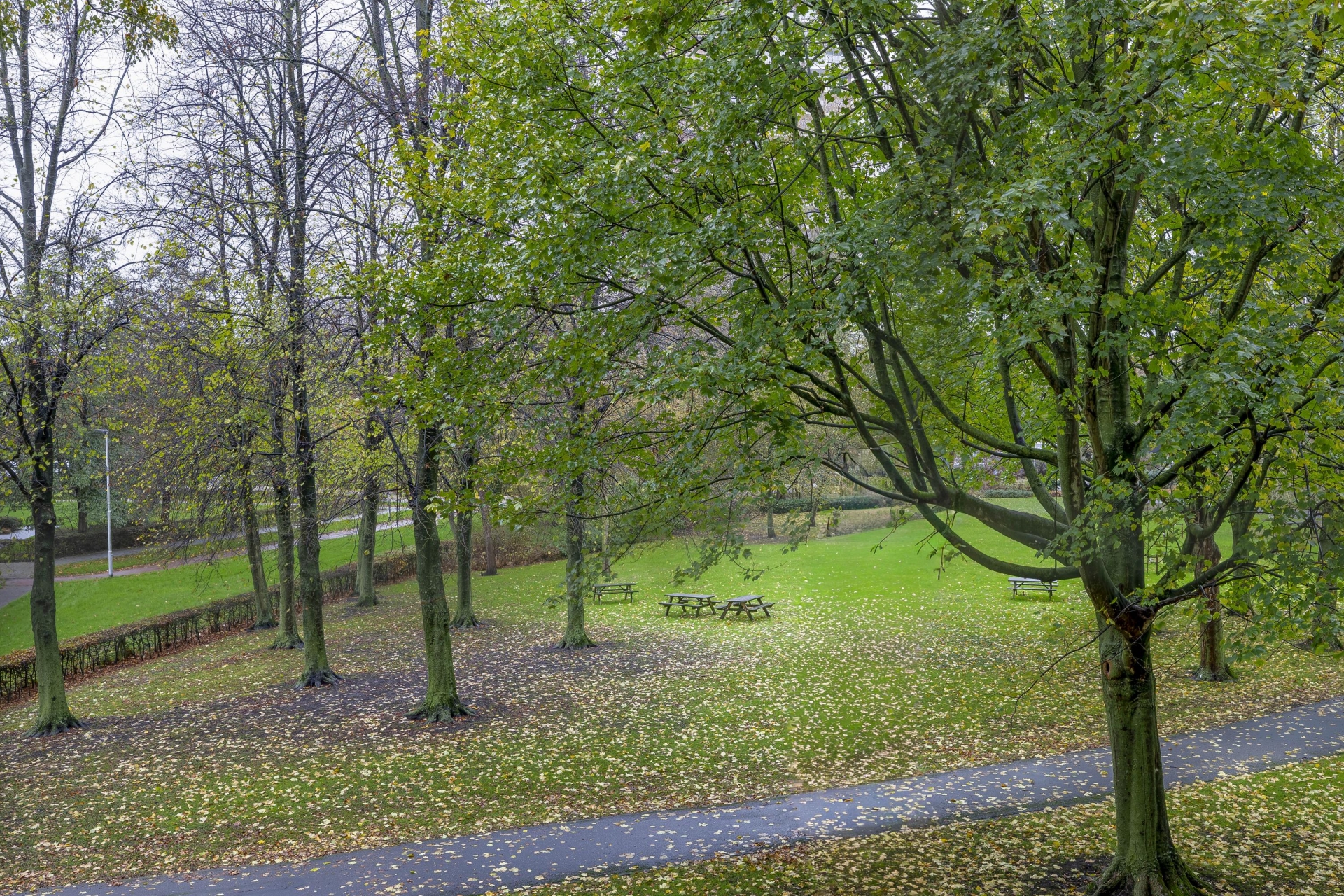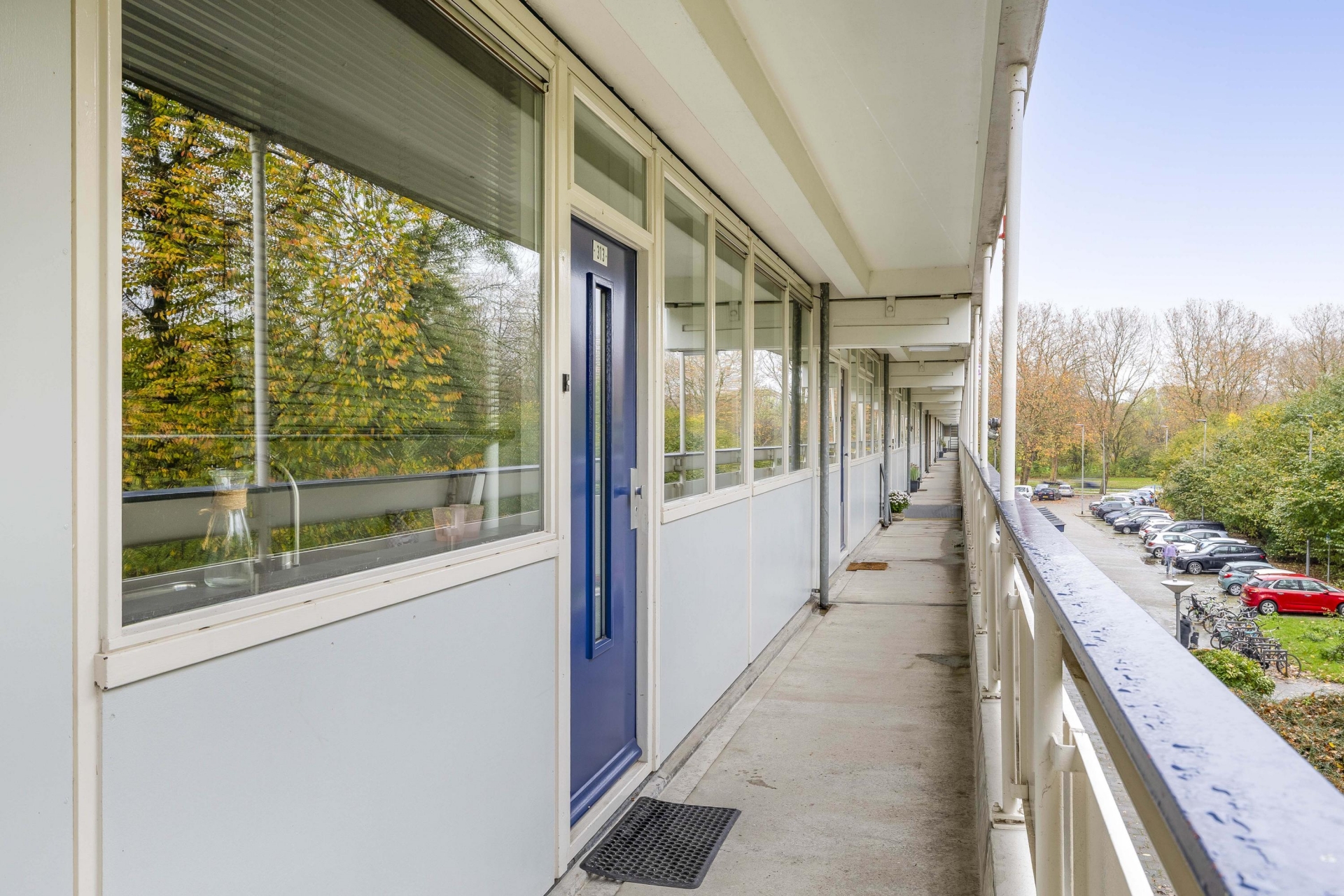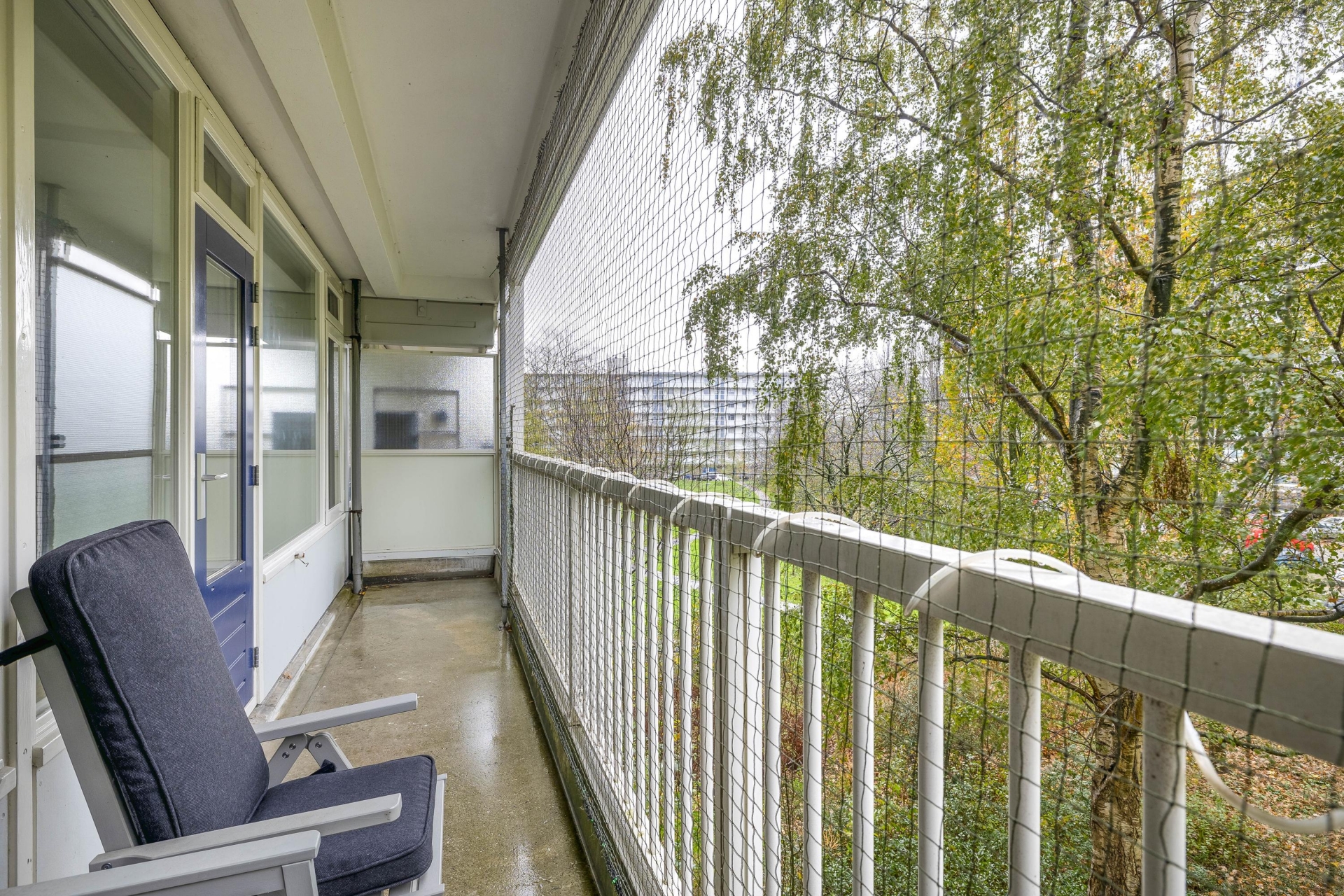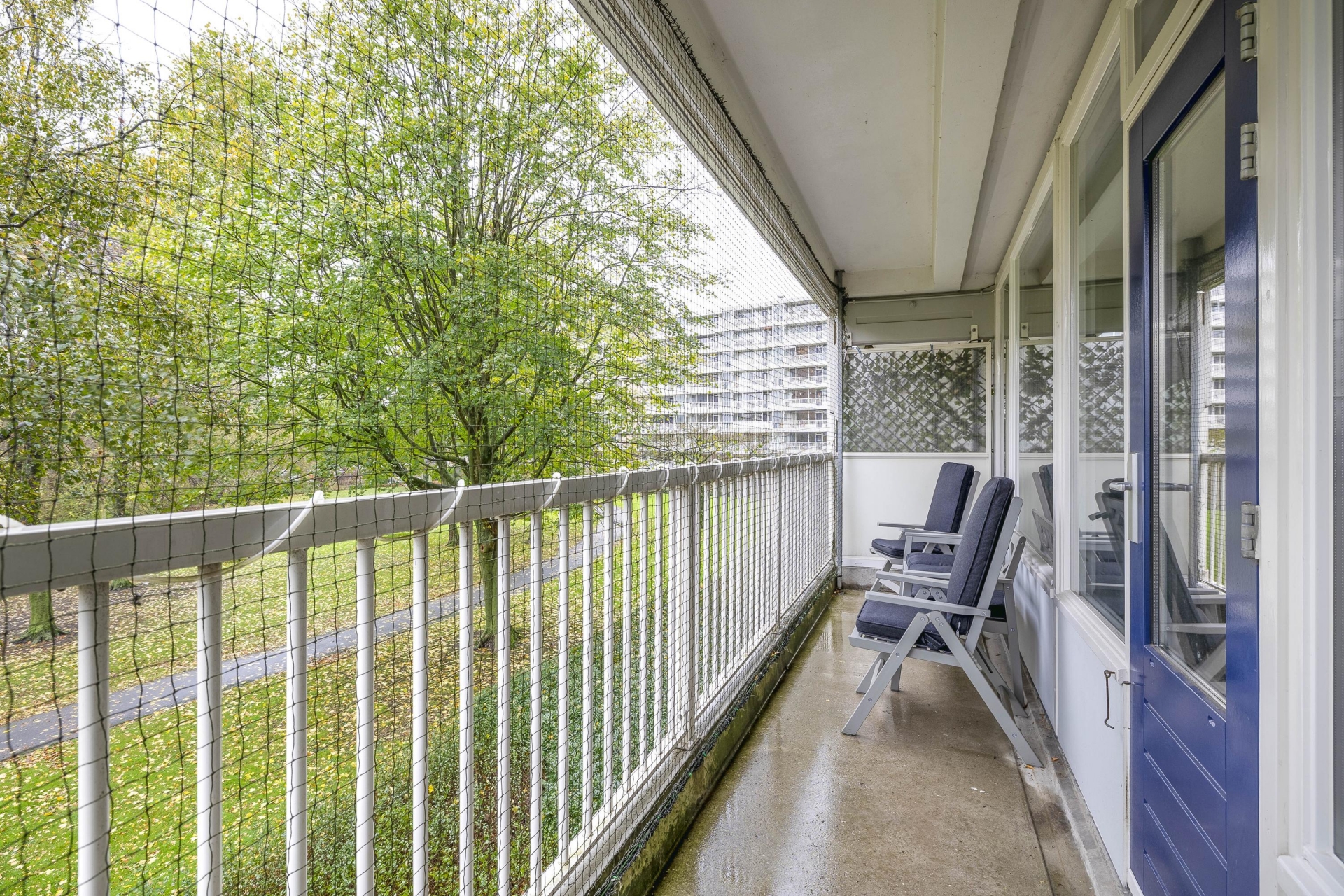 Het balkon, gelegen op het zuidwesten, biedt uitzicht op een groen parkje.