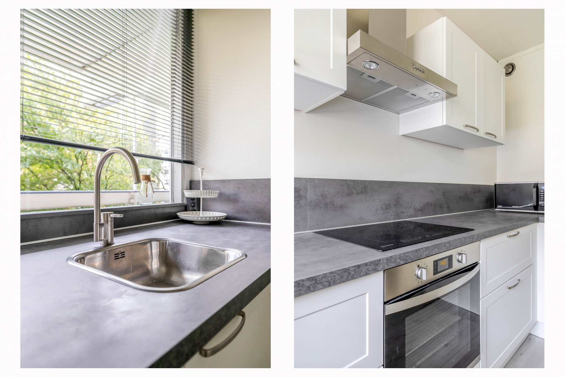 Bij binnenkomst bereikt u direct de halfopen keuken aan de linkerzijde, die praktisch is ingedeeld. De keuken is strak afgewerkt en voorzien van een vaatwasser, inductiekookplaat met afzuigkap, oven en koel-vriescombinatie.
