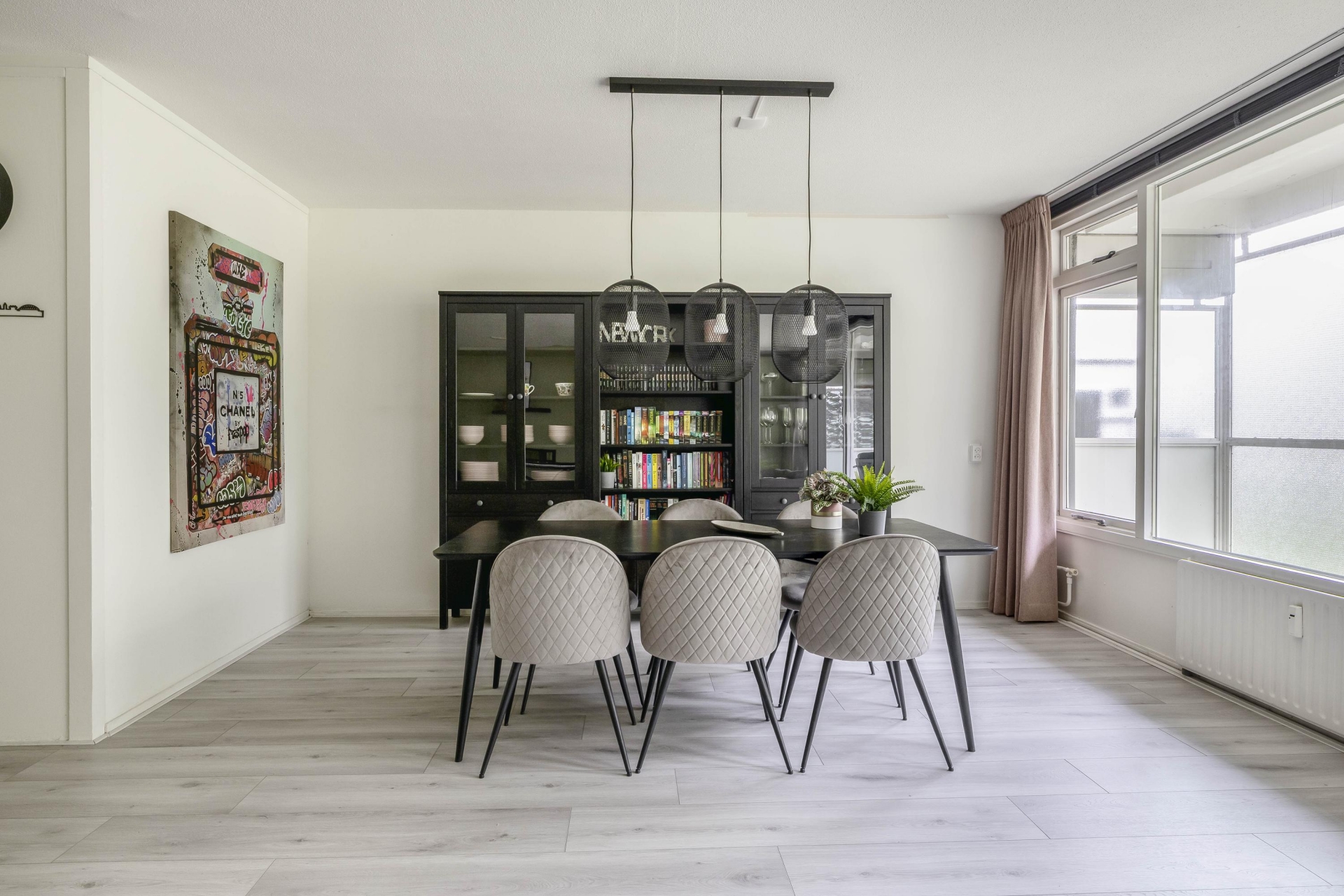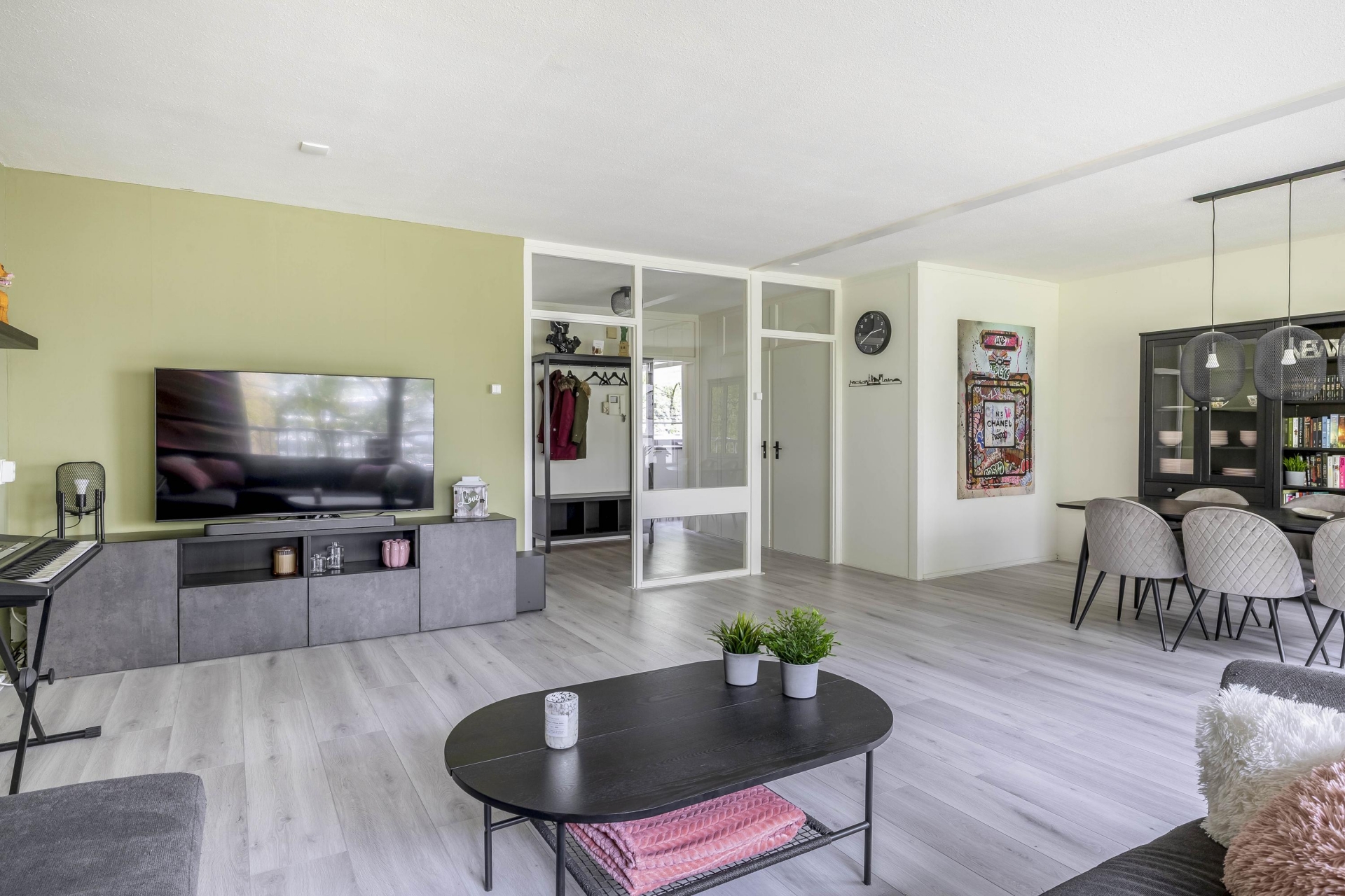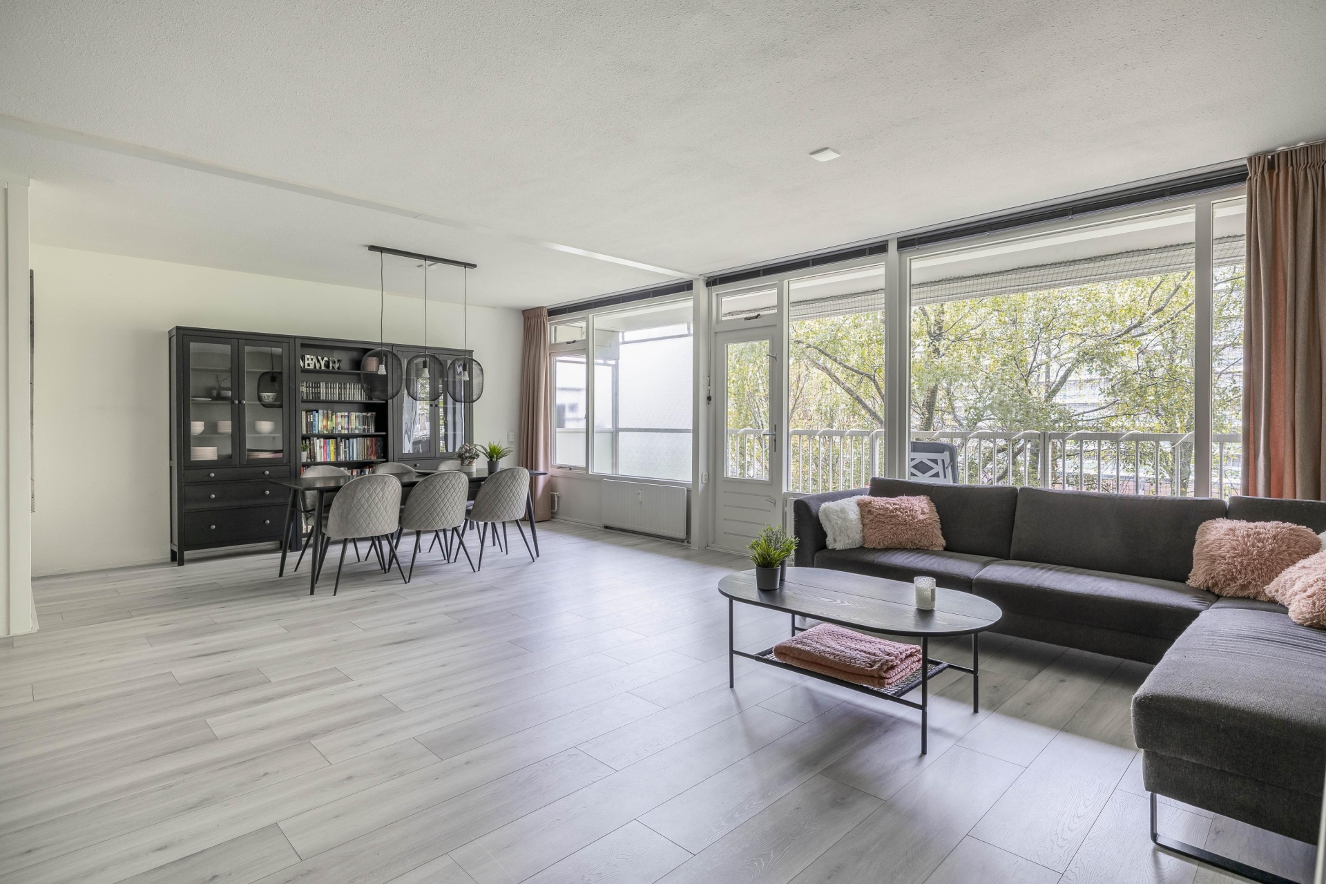 De woonkamer bevindt zich over de hele breedte van het appartement en heeft grote raampartijen, waardoor het leefgedeelte ruim en licht aanvoelt. De ruimte is praktisch in te delen, waardoor het eet- en zitgedeelte gemakkelijk van elkaar gescheiden kunnen worden. In de originele indeling bevond zich hier de derde slaapkamer.