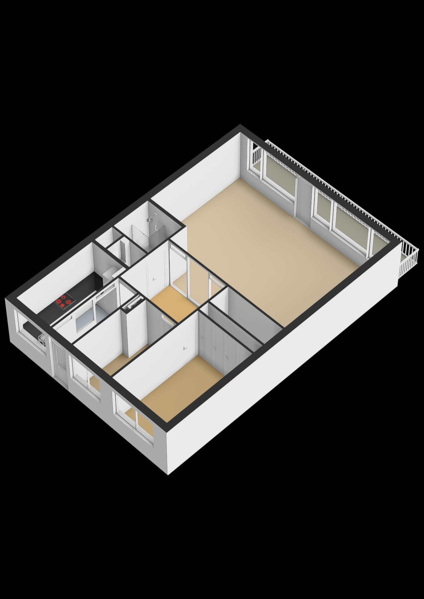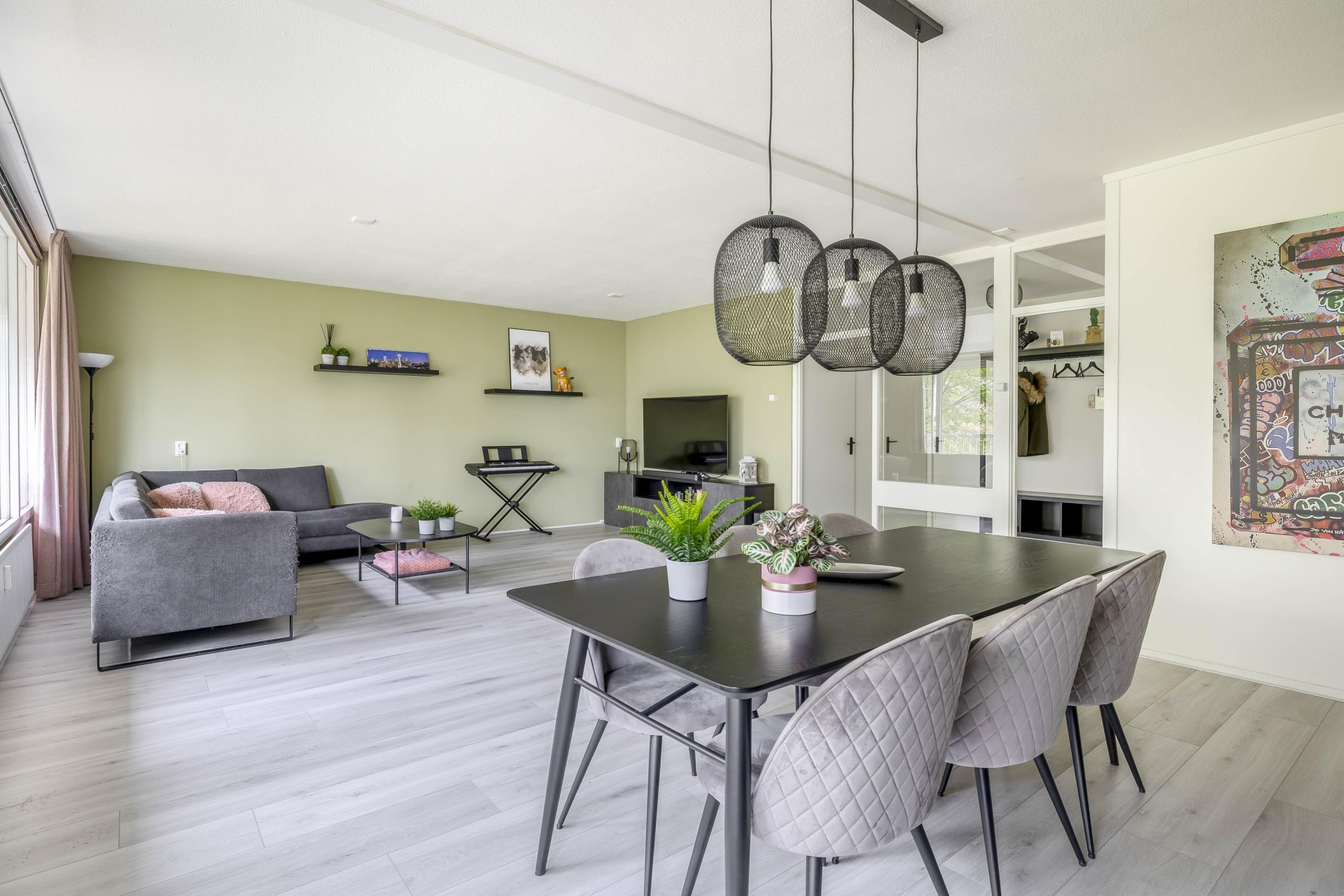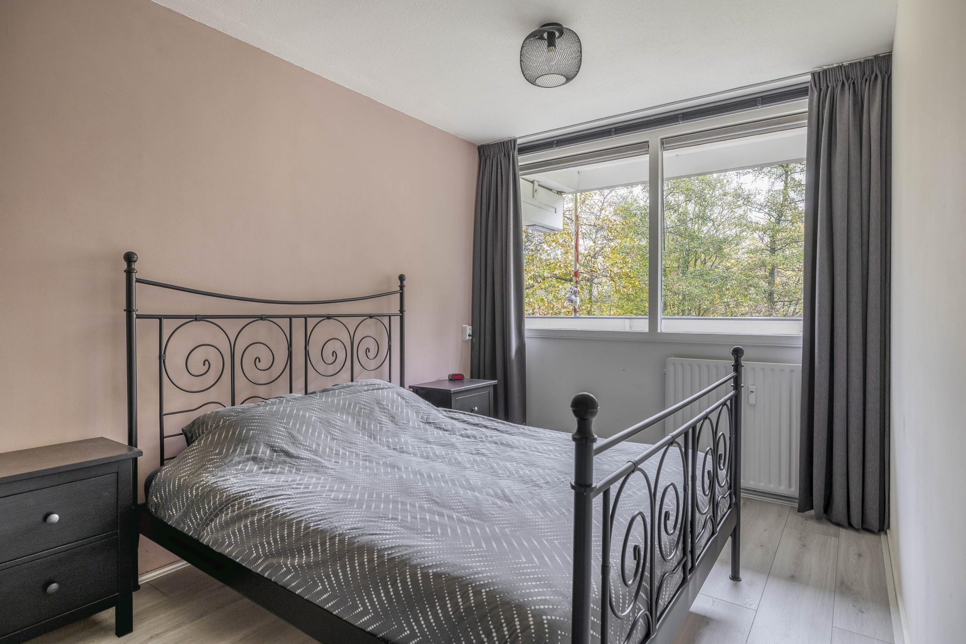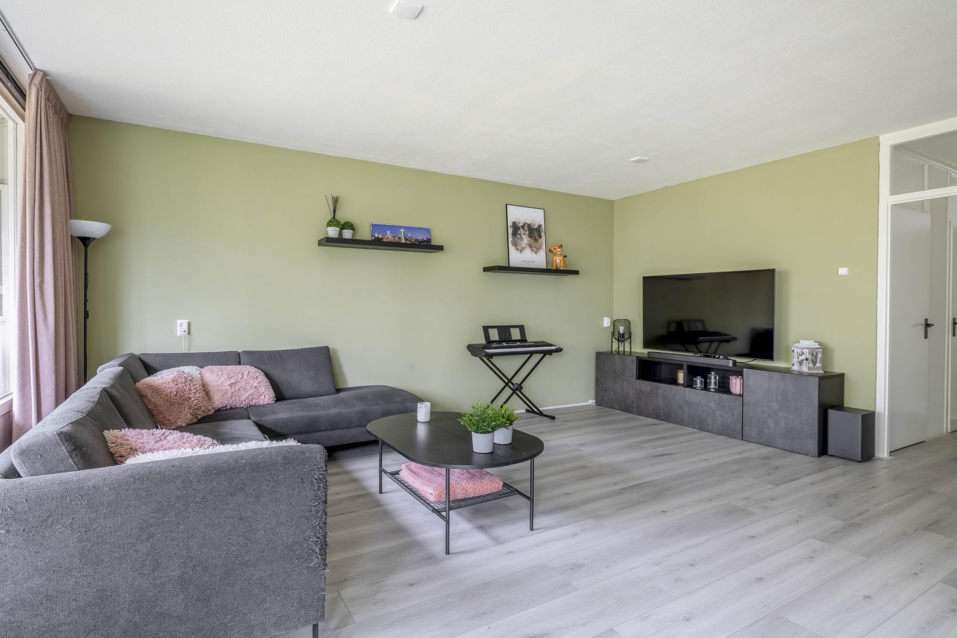 De woonkamer bevindt zich over de hele breedte van het appartement en heeft grote raampartijen, waardoor het leefgedeelte ruim en licht aanvoelt. De ruimte is praktisch in te delen, waardoor het eet- en zitgedeelte gemakkelijk van elkaar gescheiden kunnen worden. In de originele indeling bevond zich hier de derde slaapkamer.