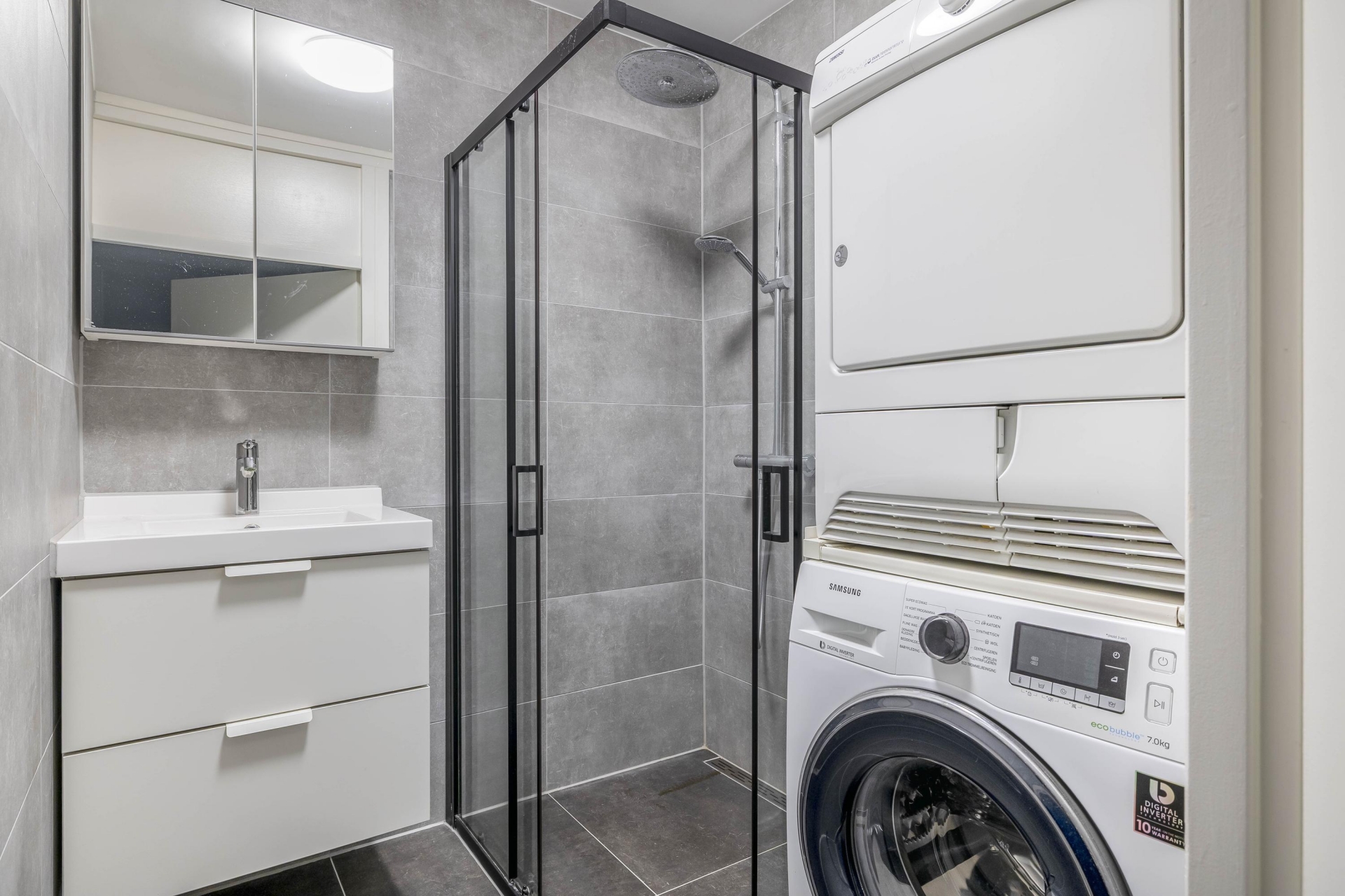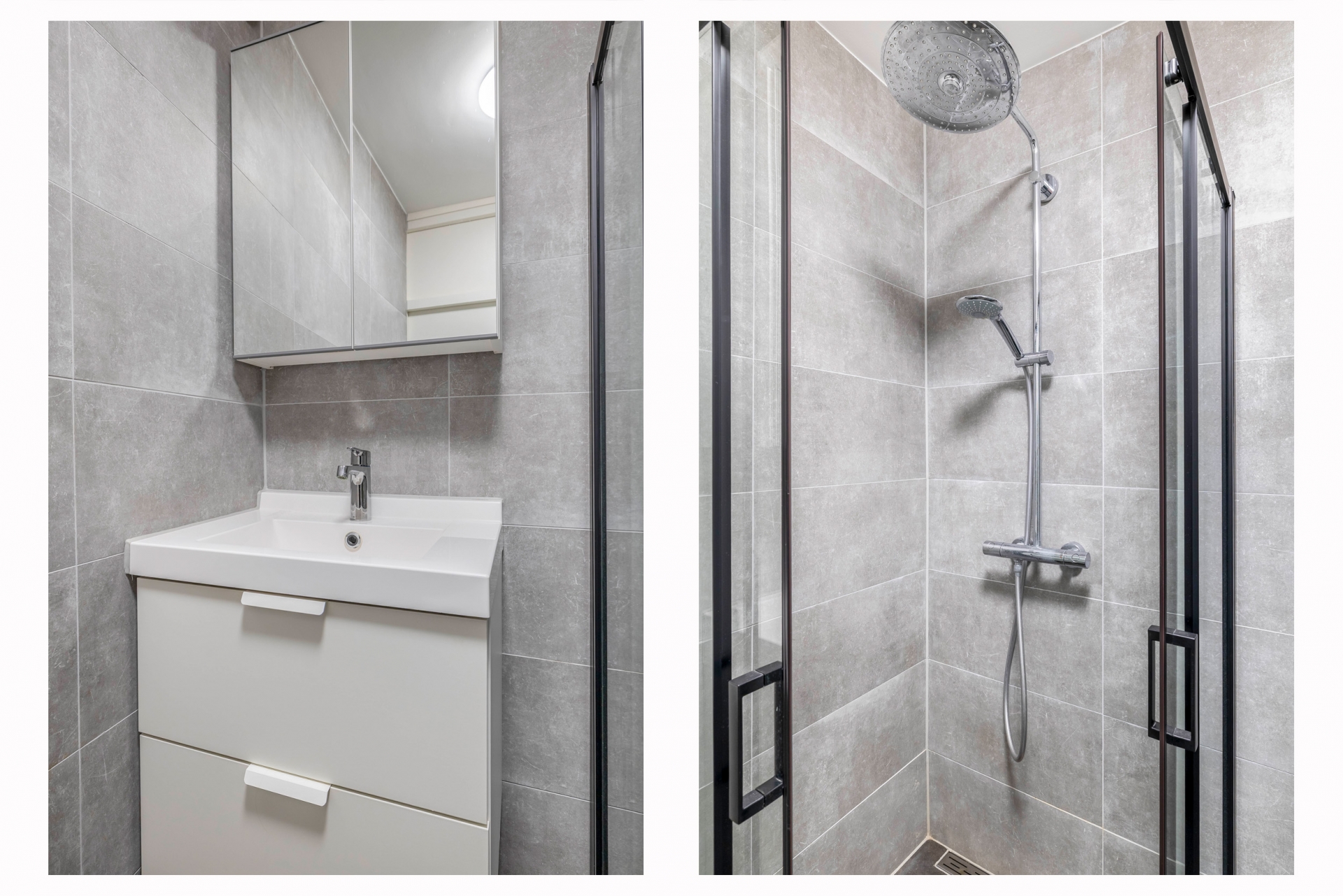Het toilet en de badkamer zijn van elkaar gescheiden. De volledig betegelde badkamer is uitgerust met een inloopdouche en een modern wastafelmeubel.