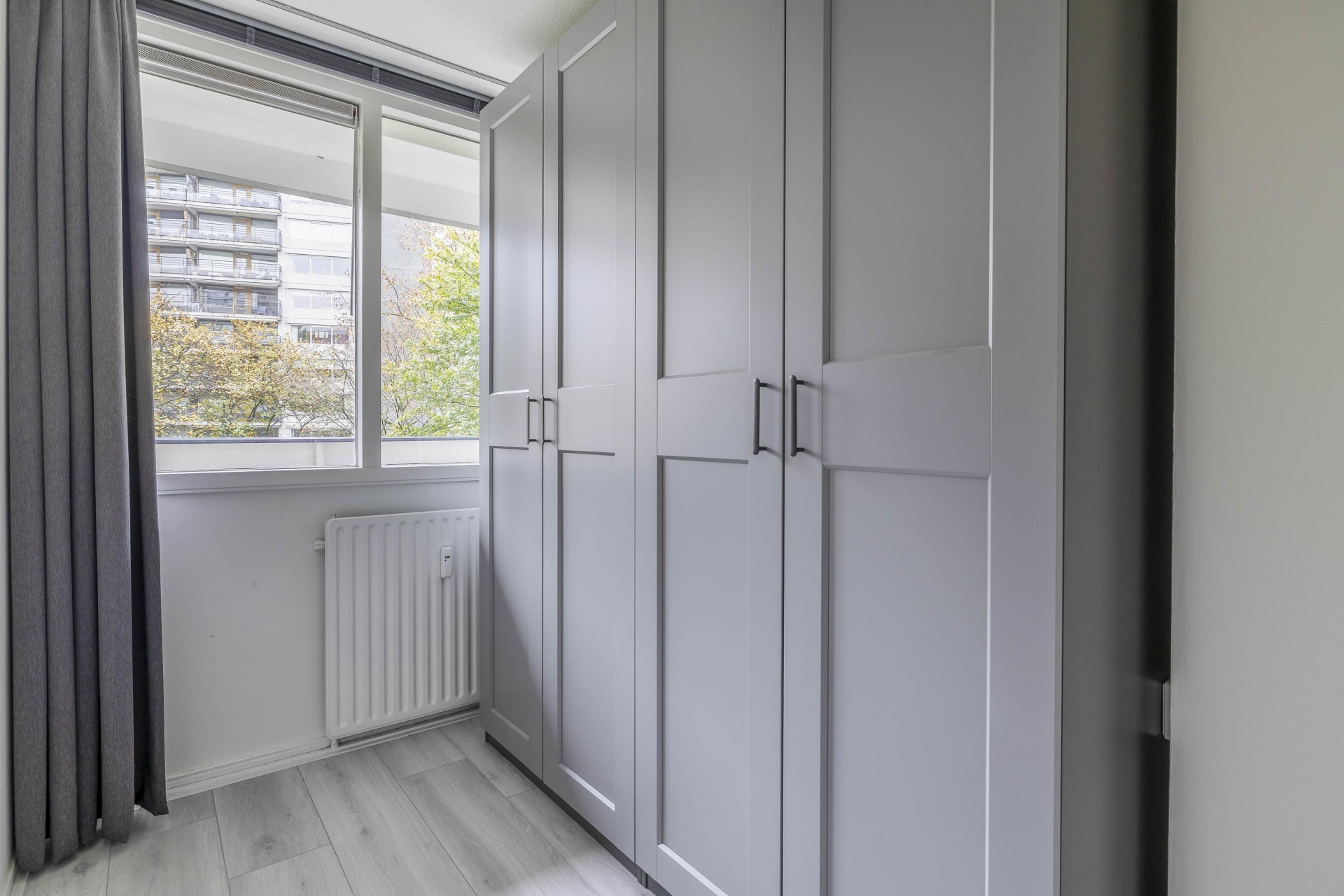 Vanuit de centrale hal zijn alle vertrekken toegankelijk. Aan de voorzijde van het appartement bevinden zich twee slaapkamers van respectievelijk 12 m² en 6 m². De grootste slaapkamer beschikt bovendien over een praktische ingebouwde kast.