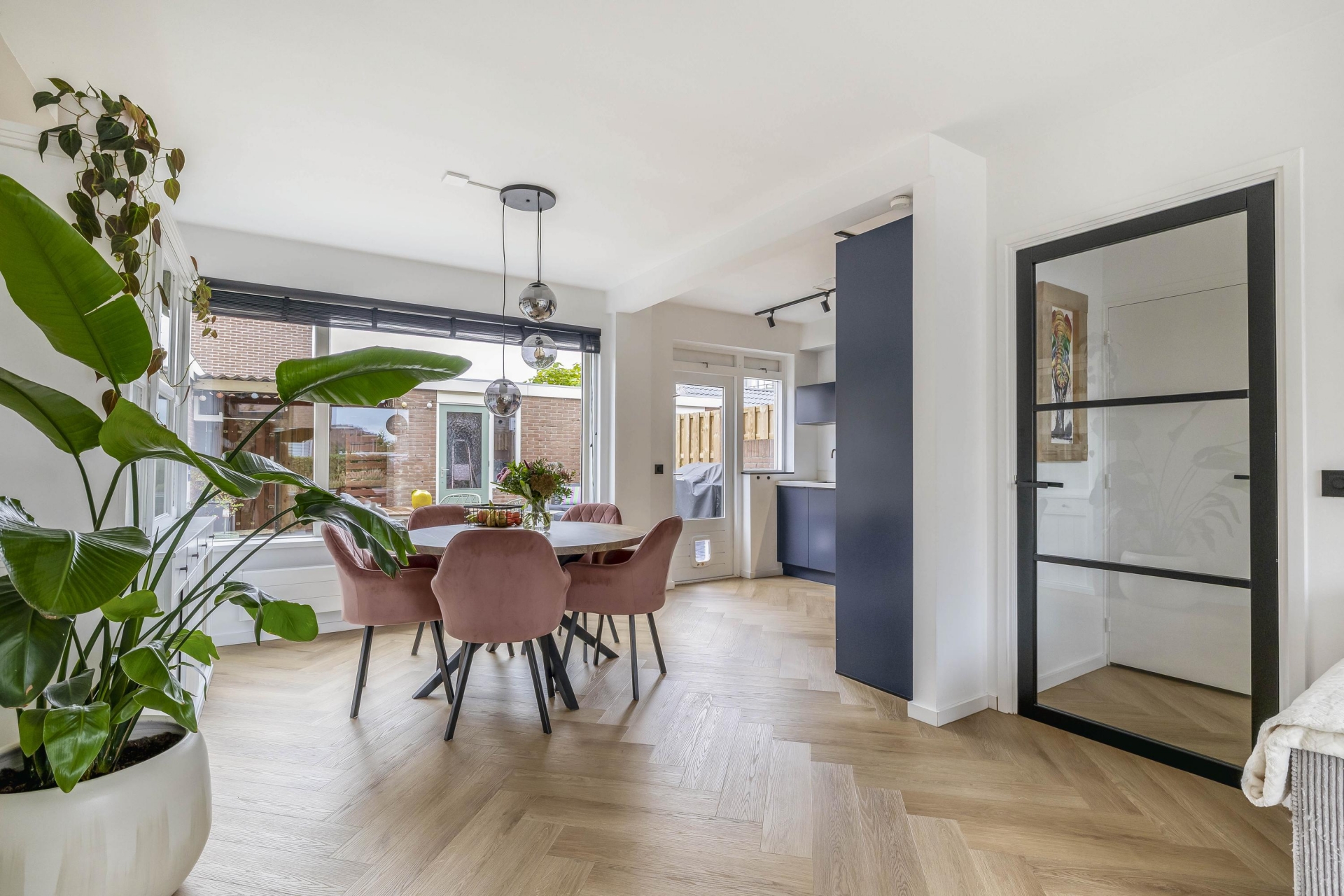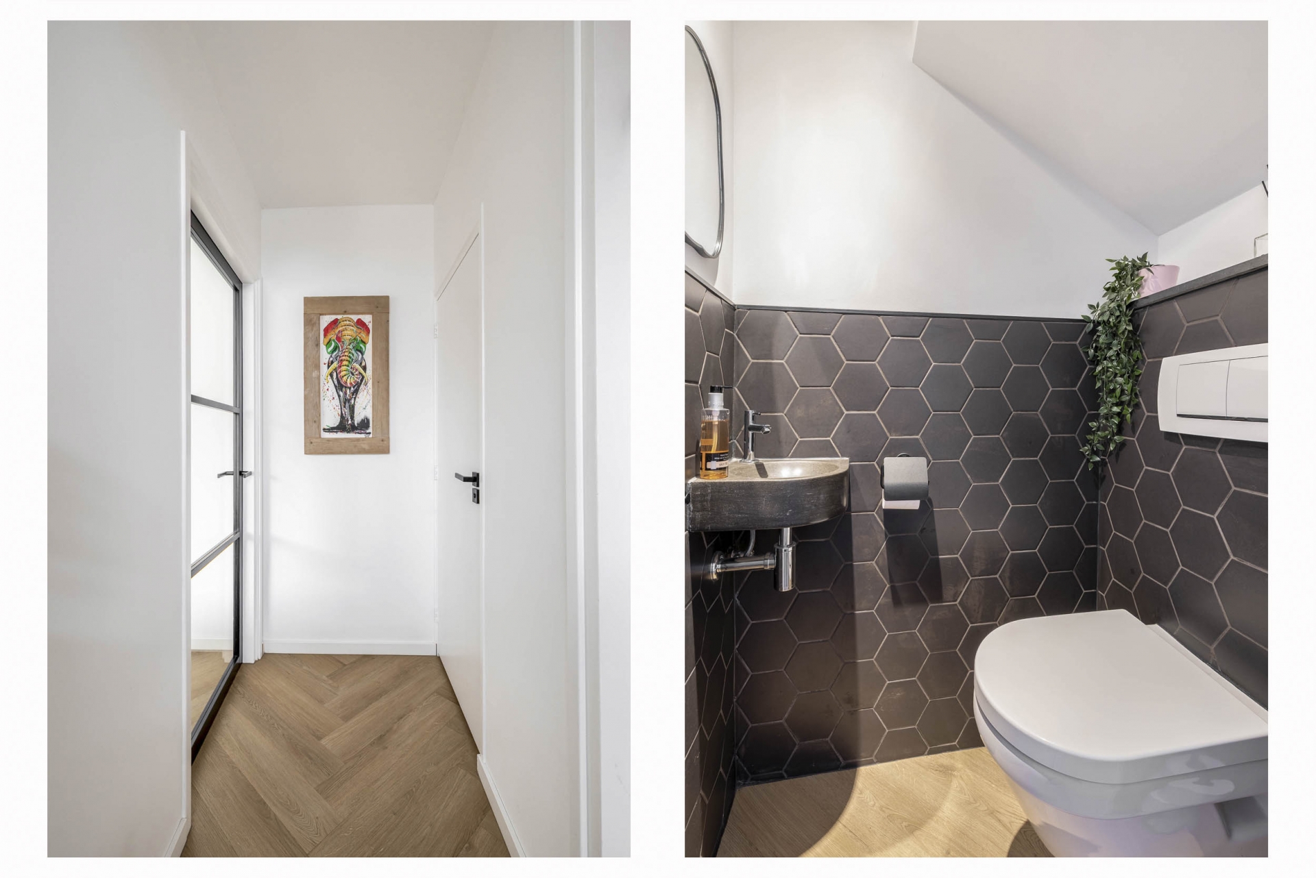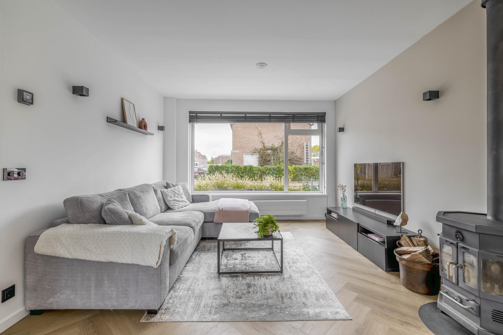 De voortuin met moderne bestrating en strak aangelegde beplanting zet direct de toon. Binnen wacht een sfeervolle woonkamer met veel lichtinval, een gezellige houtkachel en een eigentijdse vloer in visgraatmotief. De neutrale kleuren en strakke afwerking zorgen voor een rustige en warme sfeer. Ook de keuken is netjes en praktisch ingericht, met voldoende ruimte voor dagelijks gemak.
