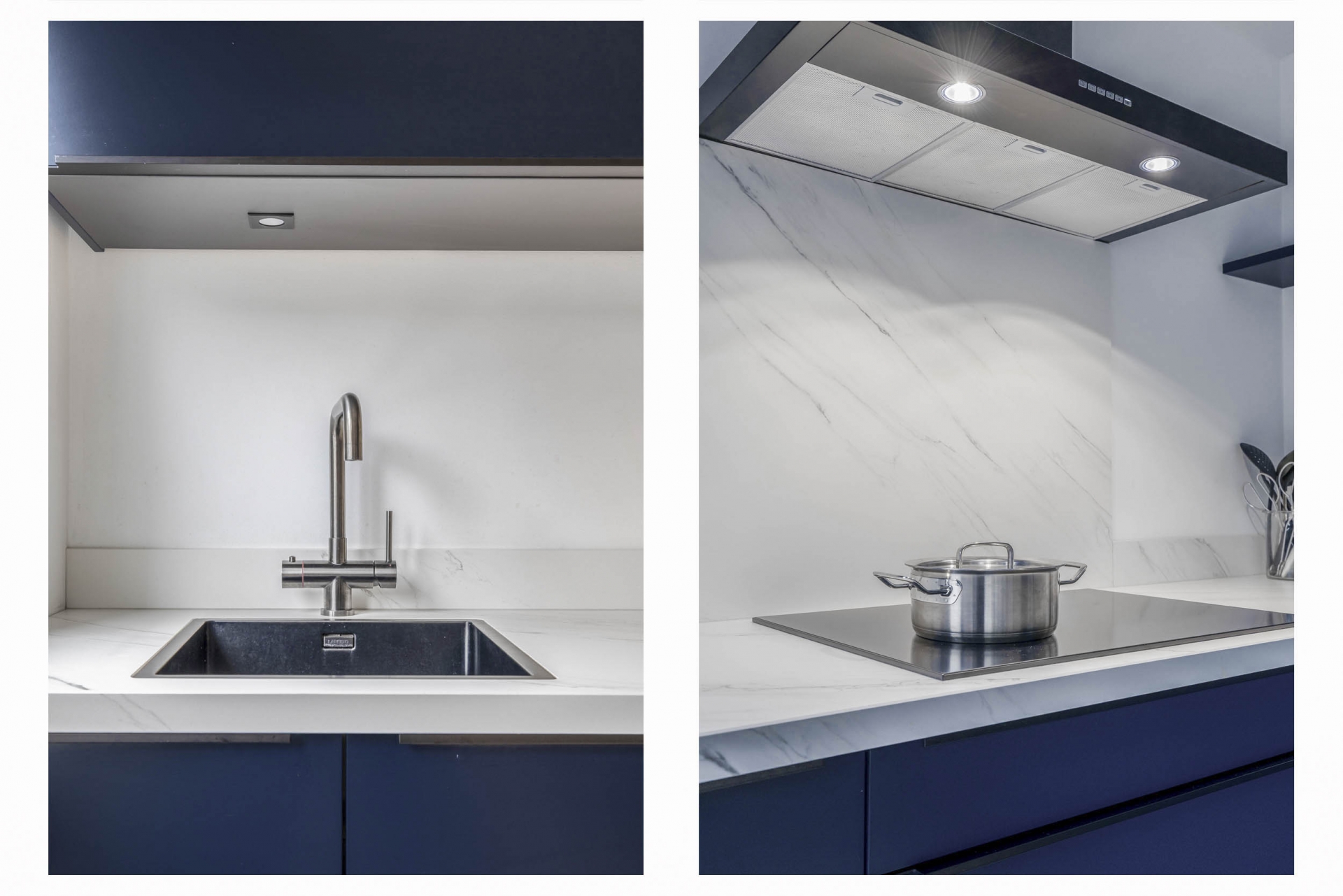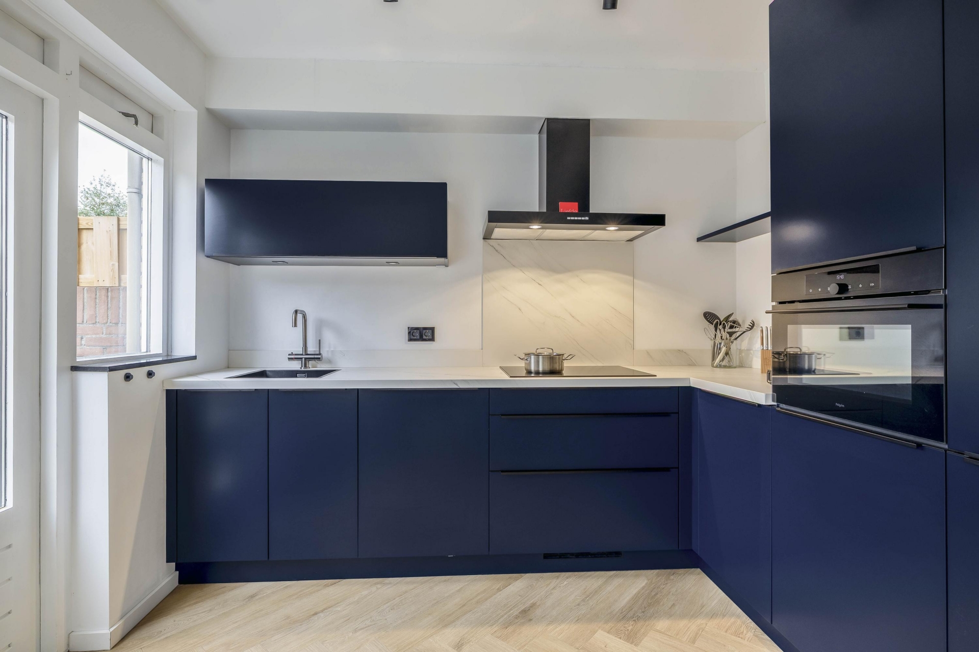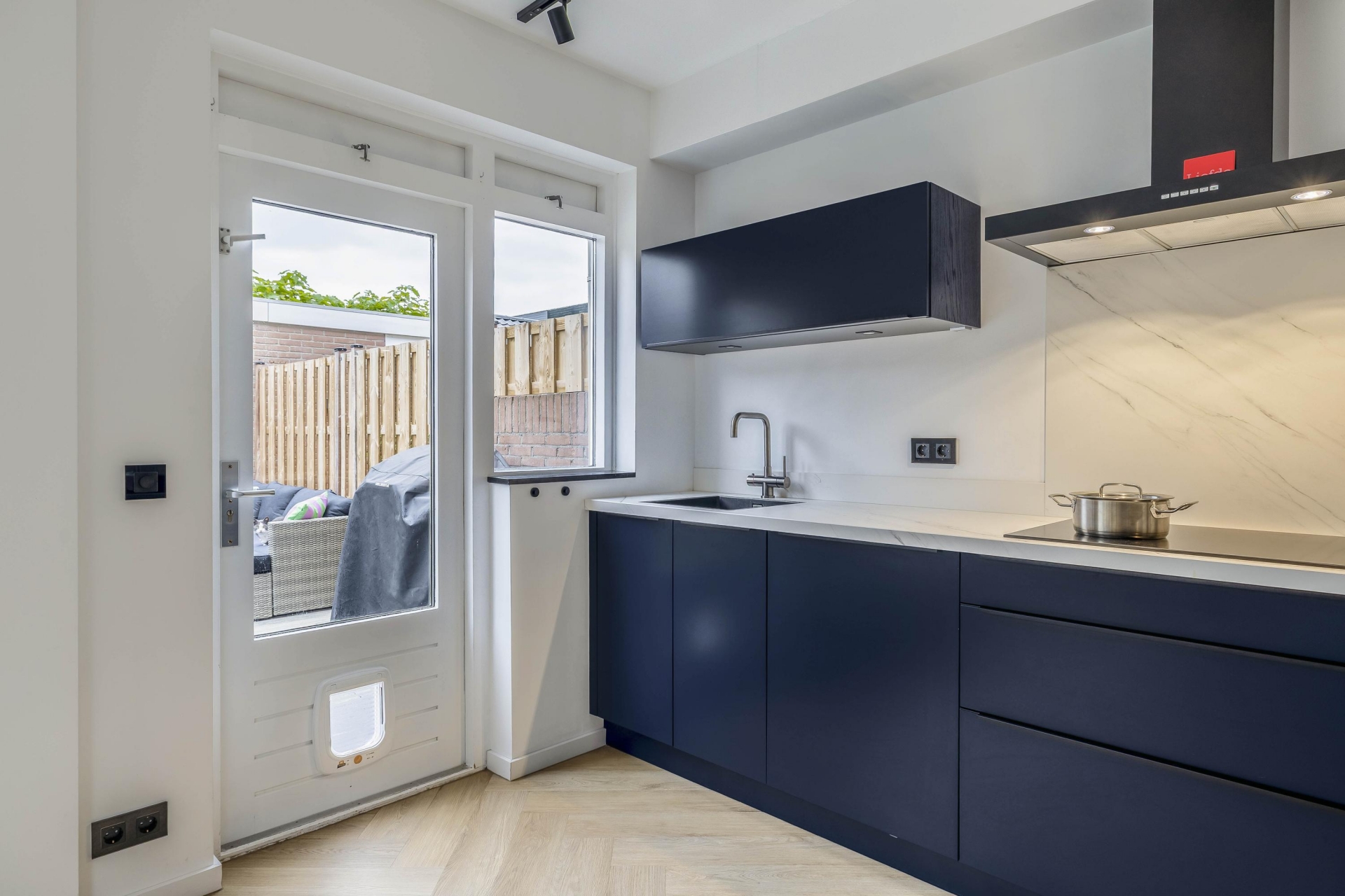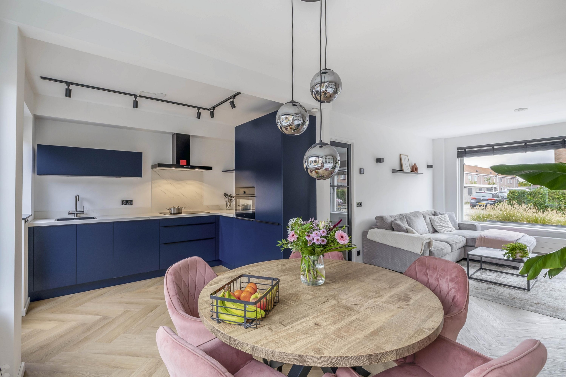 De voortuin met moderne bestrating en strak aangelegde beplanting zet direct de toon. Binnen wacht een sfeervolle woonkamer met veel lichtinval, een gezellige houtkachel en een eigentijdse vloer in visgraatmotief. De neutrale kleuren en strakke afwerking zorgen voor een rustige en warme sfeer. Ook de keuken is netjes en praktisch ingericht, met voldoende ruimte voor dagelijks gemak.