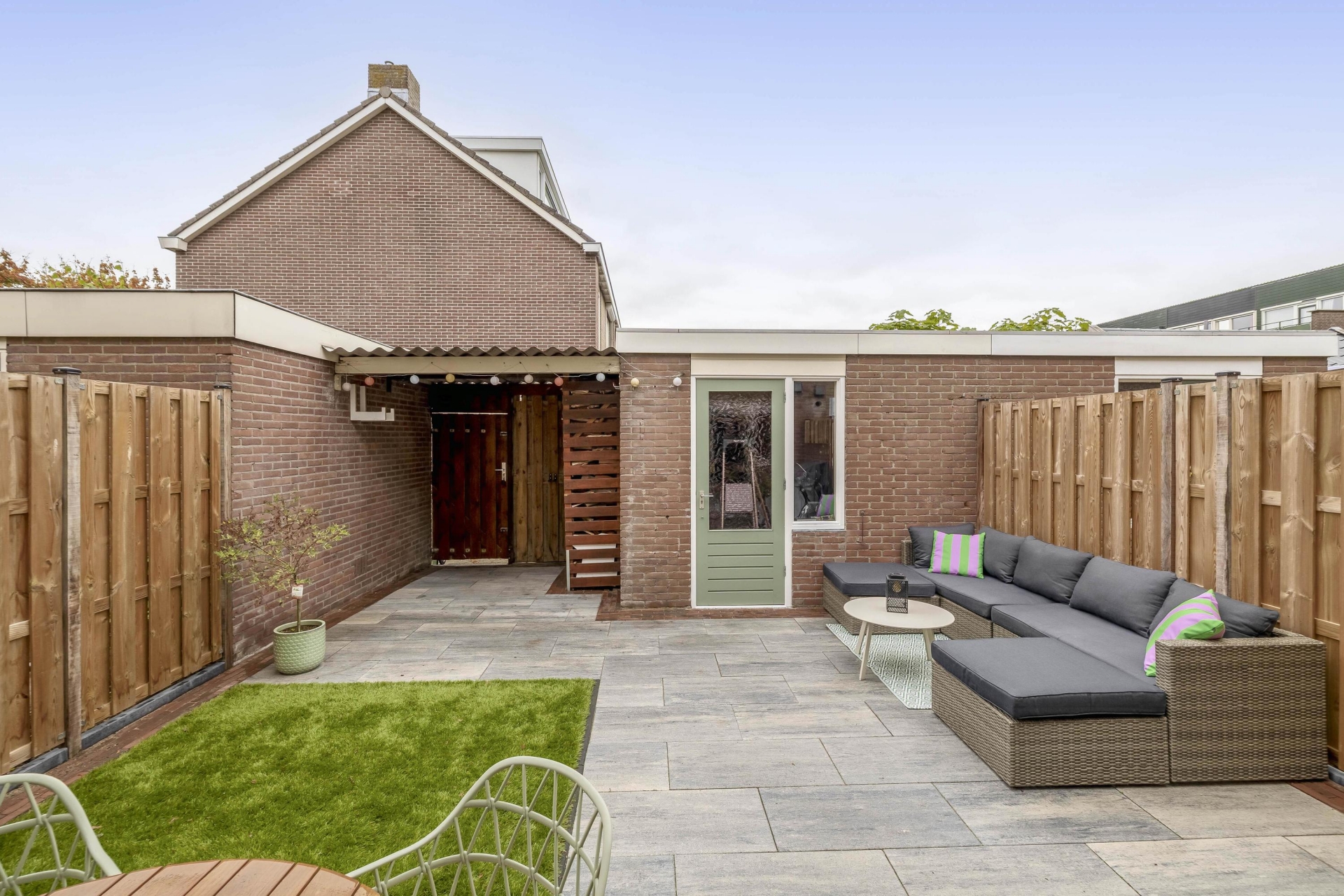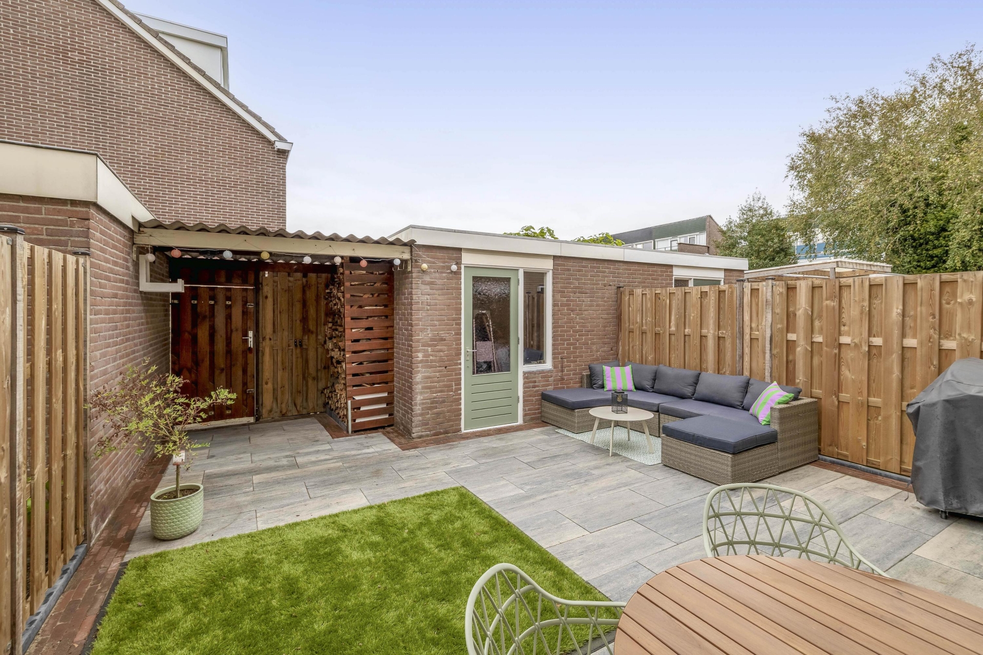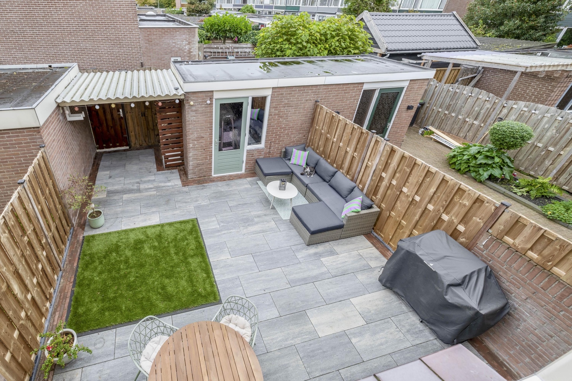 De diepe achtertuin is onderhoudsvriendelijk aangelegd met grote tegels, een stukje kunstgras en een leuke zithoek – perfect om zomers buiten te eten of gewoon lekker in de schaduw te zitten. Dankzij de achterom is de tuin ook ideaal voor wie graag met de fiets thuiskomt of kinderen heeft die via de poort de buurt in- en uitlopen. Extra fijn: achterin de tuin is er een overkapping, zodat je ook met minder weer droog buiten kunt zitten of spullen kunt stallen.