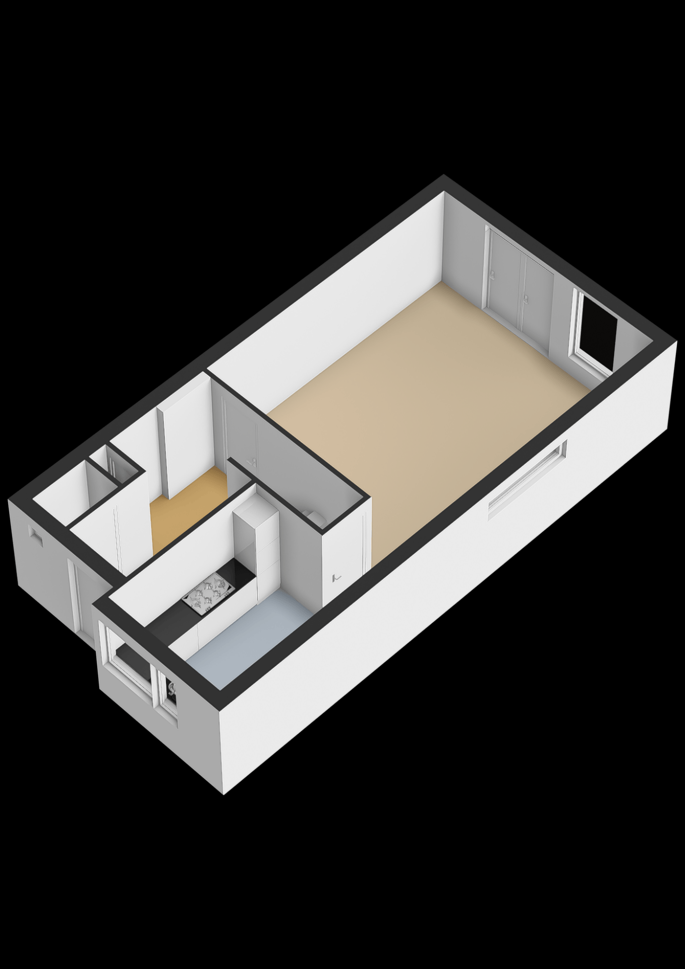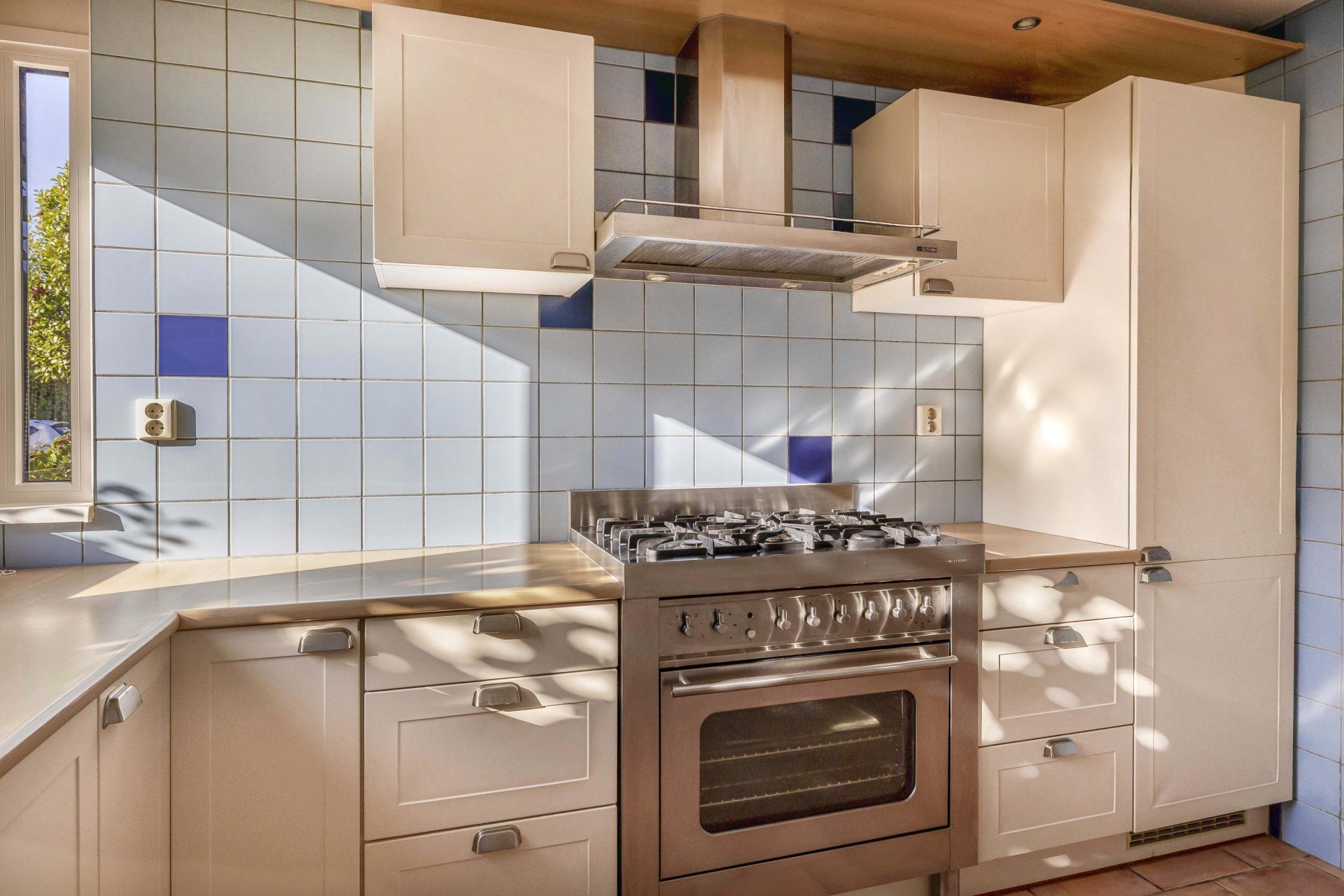 De keuken aan de voorzijde is uitgevoerd in een lichte kleurstelling en voorzien van diverse inbouwapparatuur, waaronder een groot gasfornuis met oven, afzuigkap, vaatwasser, koelkast en magnetron. Dankzij de U-opstelling is er veel werk- en bergruimte, en heb je direct zicht op de straat. De trapkast zorgt voor de nodige bergruimte.