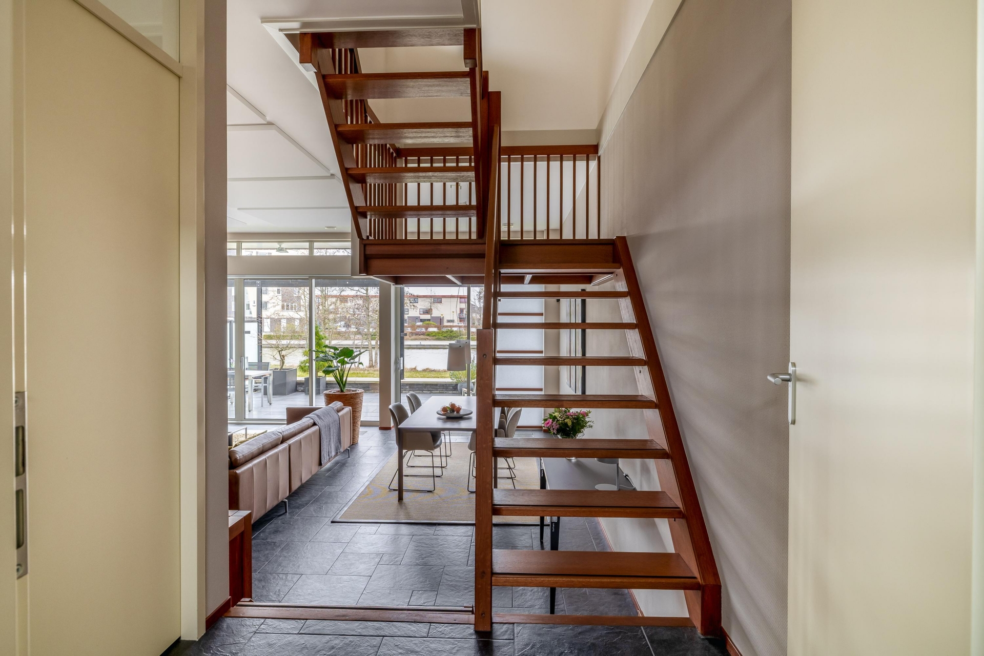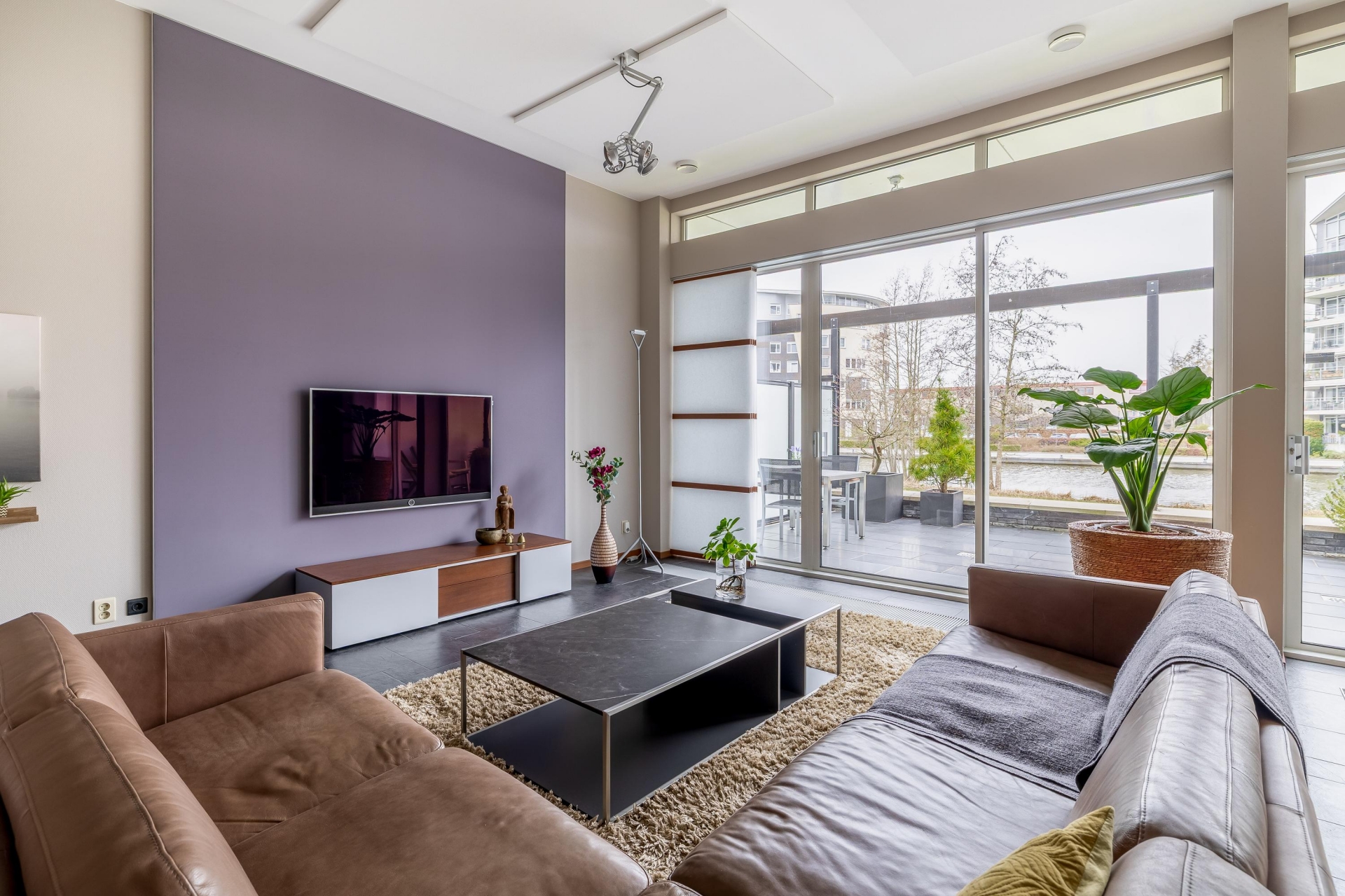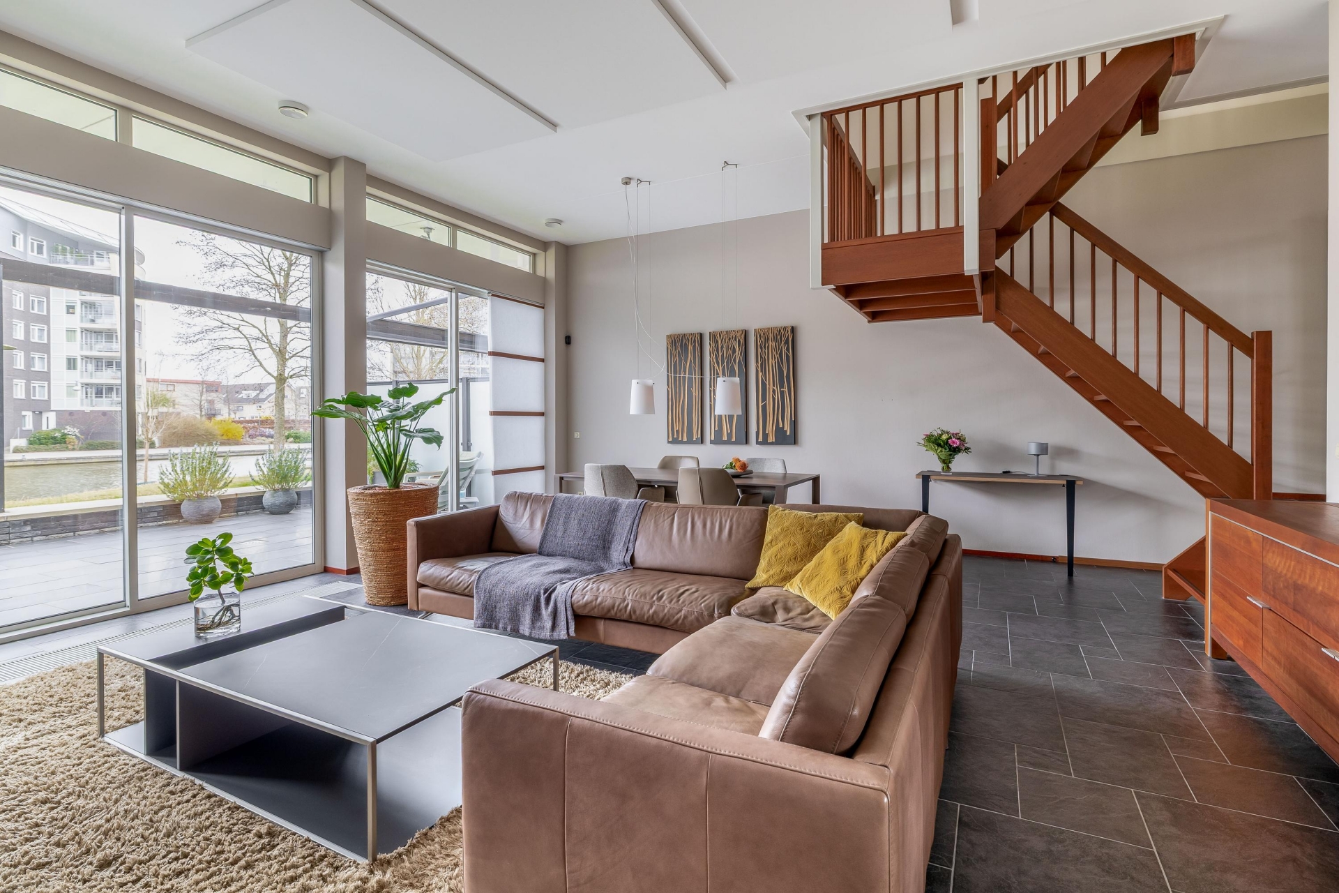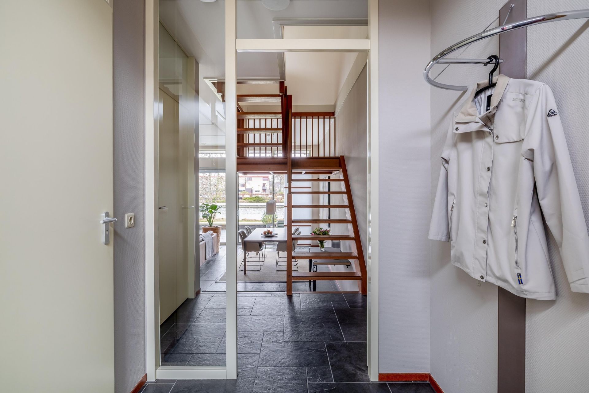 Aan de achterzijde bevindt zich de woonkamer, een echte eyecatcher van het huis. Hier zit je letterlijk aan het water, met een vrij uitzicht dat nooit verveelt. De grote raampartijen halen buiten naar binnen en zorgen voor een prachtige lichtinval. Vanuit hier stap je zo de tuin in, die op het westen ligt. Een heerlijke plek om te genieten van de zon tot in de avonduren.