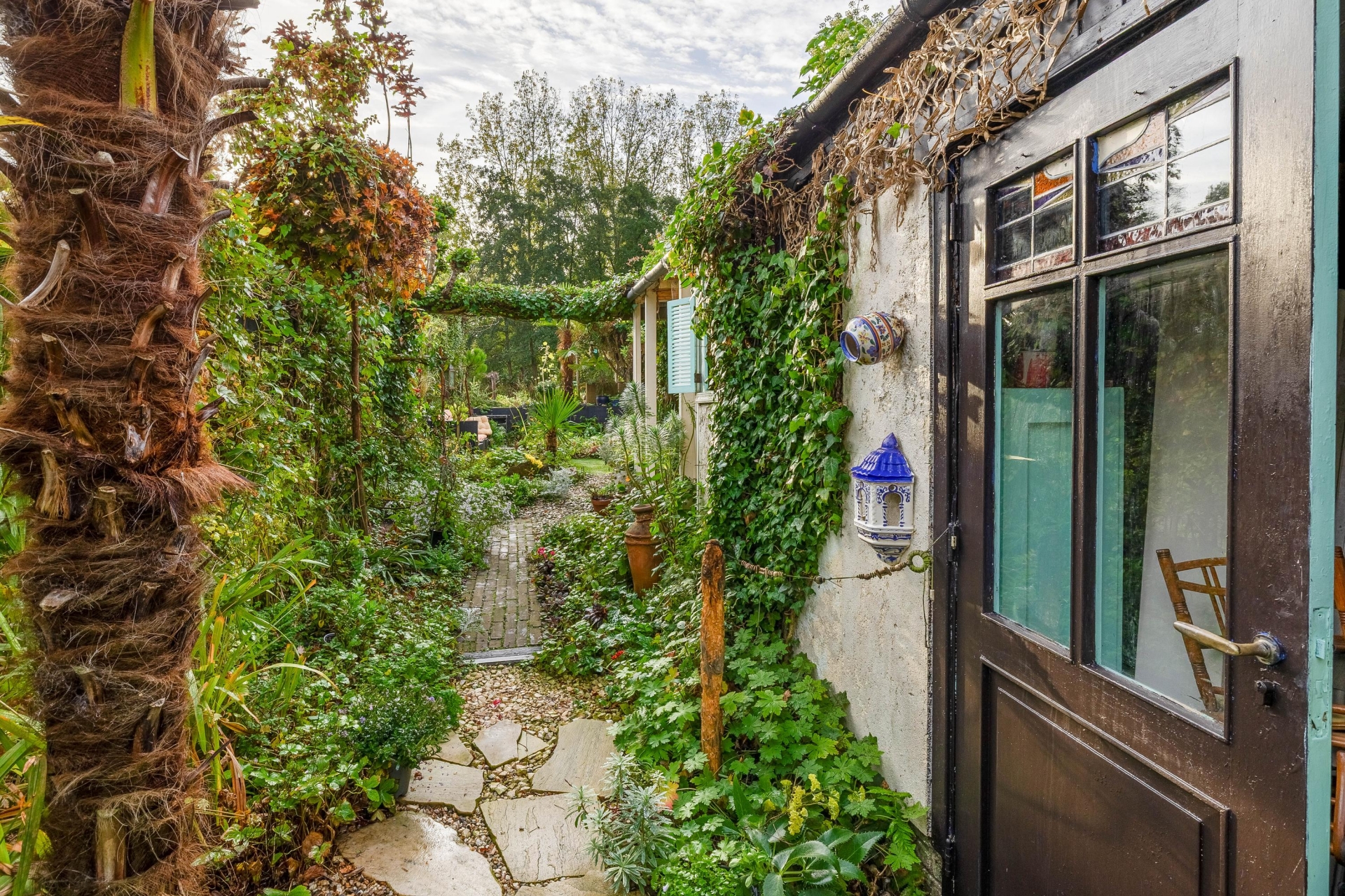 Het erf is middels een zelf aangebrachte loopbrug te betreden. Officieel heeft u ook recht van overpad via de buren. Via de groene voortuin is de woning te betreden.