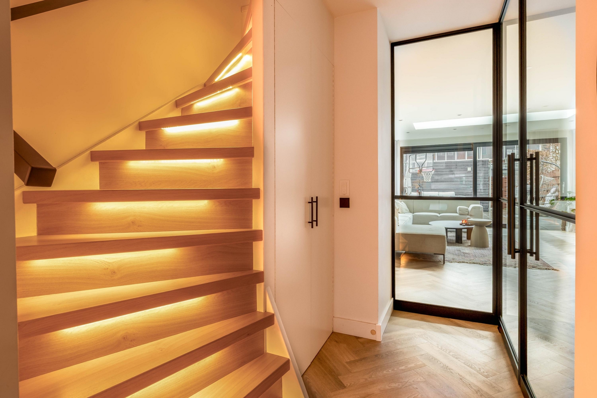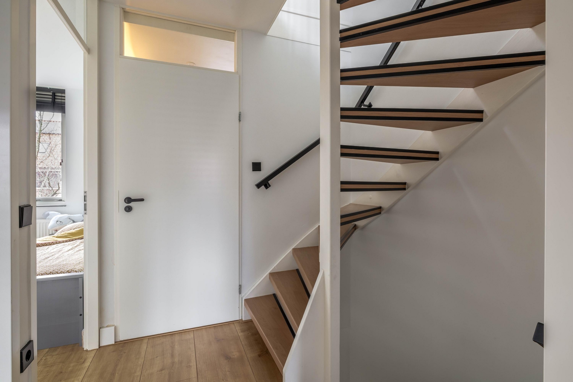 Entree, hal met toegang tot het toilet, de meterkast, een kast onder de trap, trapopgang naar de eerste verdieping en de woonkamer. De fraaie taatsdeuren bieden een luxe, uitnodigende uitstraling om de woonkamer te betreden. De tuingerichte woonkamer is aan de achterzijde uitgebouwd. Tevens is hier een mooie lichtstraat in geplaatst voor de nodige daglichttoetreding. Middels de schuifpui is er toegang tot de achtertuin. Deze is gelegen op het oosten waardoor het mogelijk is om al vroeg van de zon te kunnen genieten. Liever een plek in de schaduw? Dat kan middels het elektrische zonnescherm. Verder is er een houten berging, buitenkraan en een achterom aanwezig. De luxe open keuken (2022) is aan de voorzijde gelegen. De matzwarte keuken heeft een parallel-opstelling en is voorzien van alle benodigde inbouwapparatuur. De gehele begane grond is recent gestuct en er ligt een mooie PVC-visgraat vloer met vloerverwarming.