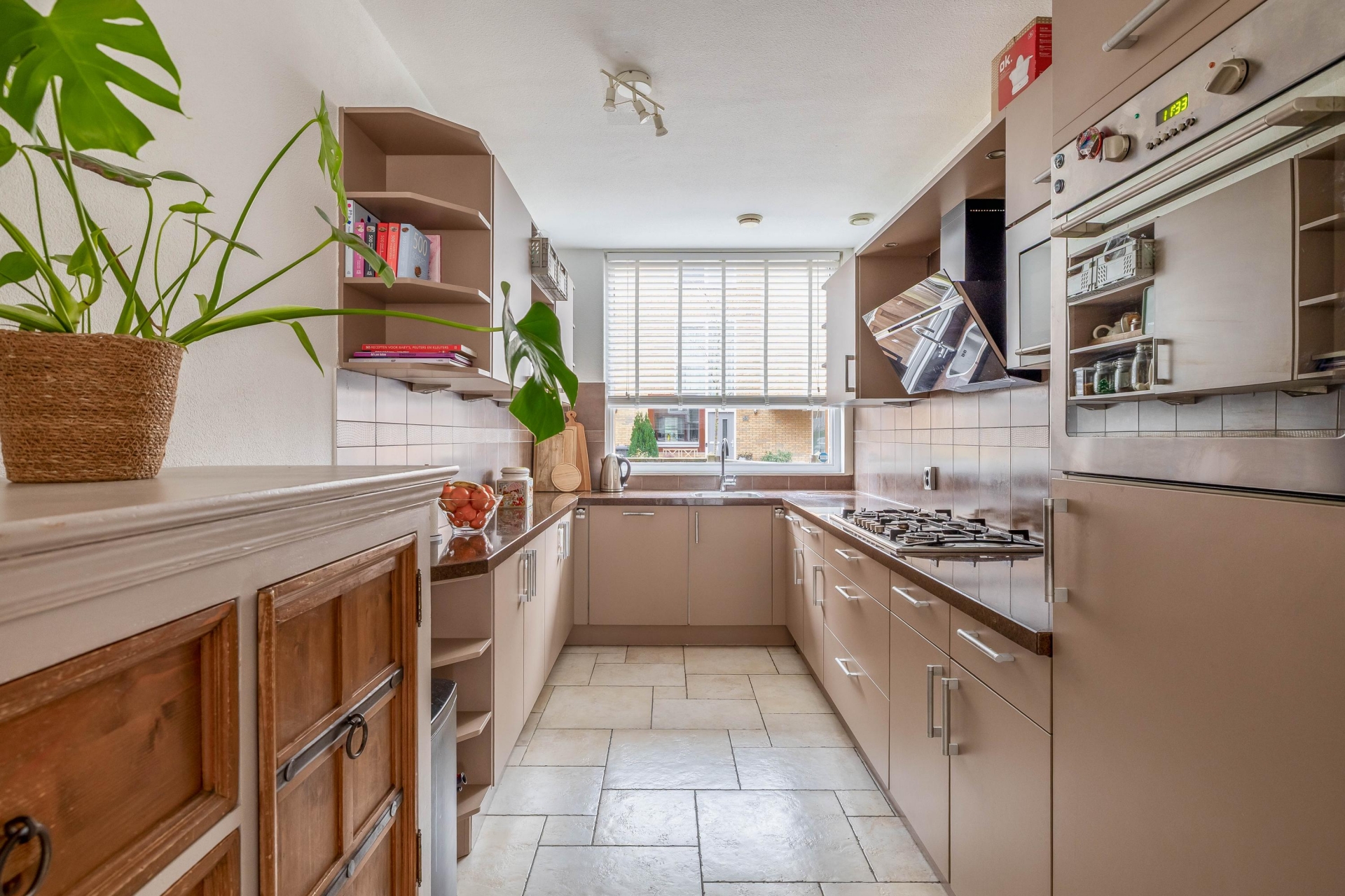 Aan de voorzijde ligt de de half open keuken, uitgevoerd in een warme, neutrale kleurstelling met volop kastruimte, een 5-pits gaskookplaat, afzuigkap, oven, combimagnetron, vaatwasser en koel-/vriescombinatie. De keuken heeft een rechte opstelling met een extra wandkast, wat zorgt voor een praktische en efficiënte indeling.