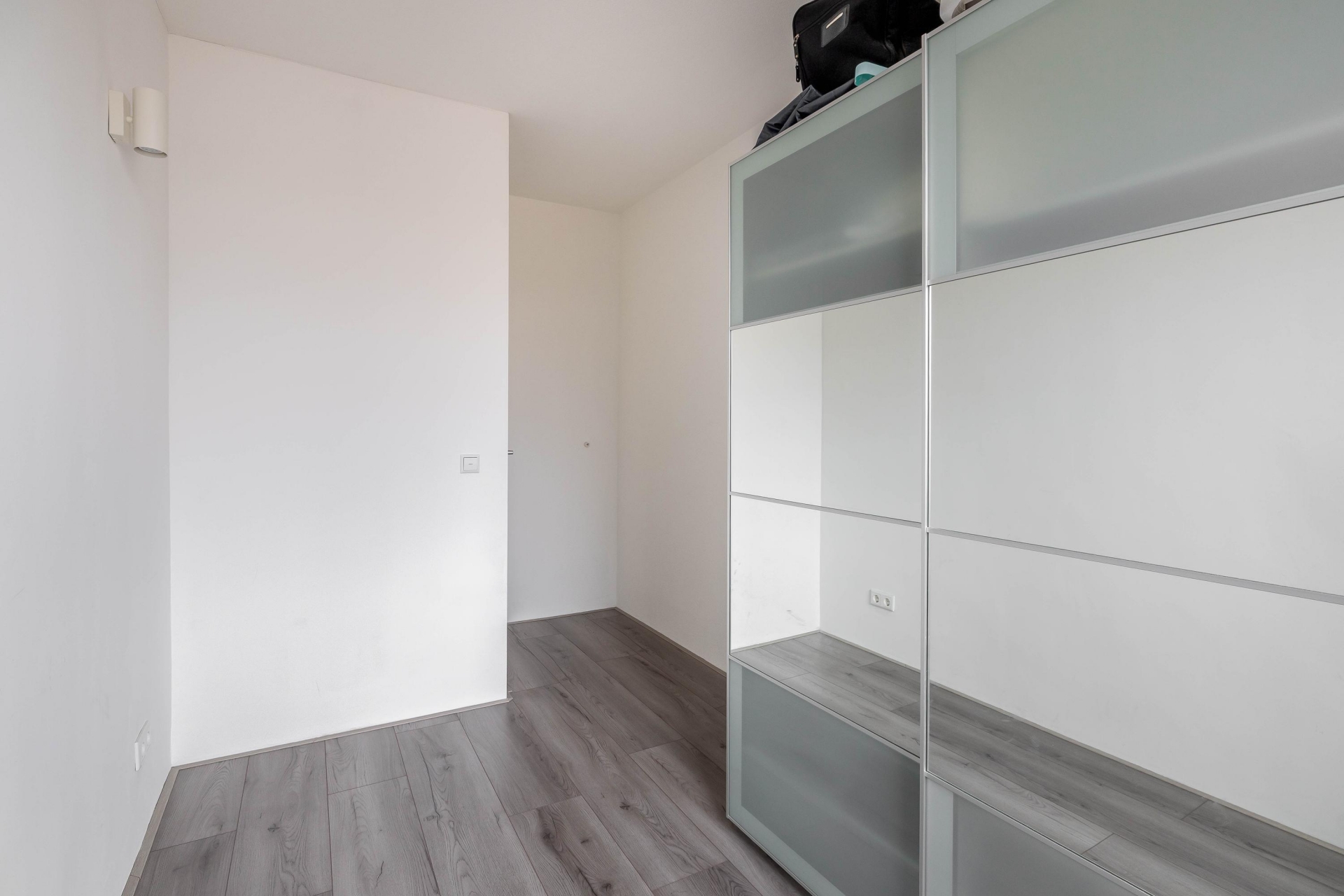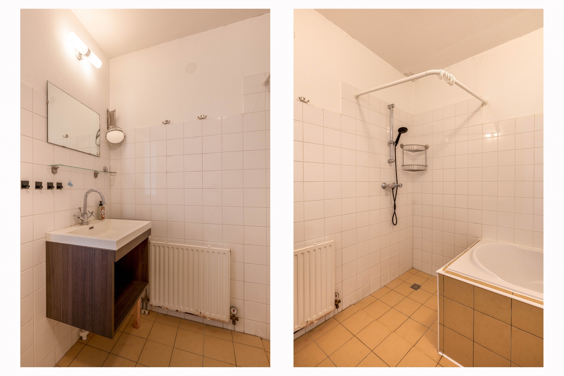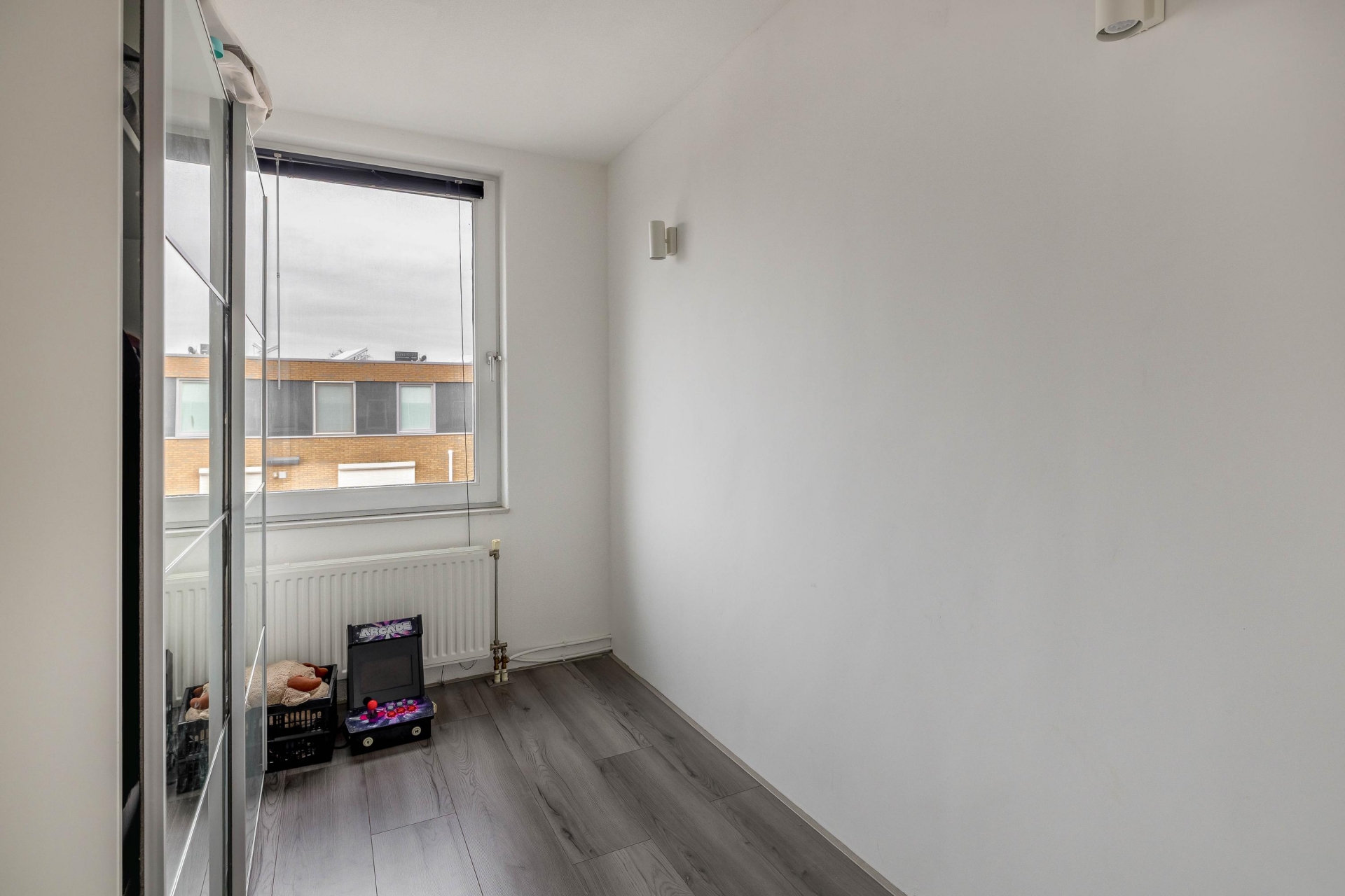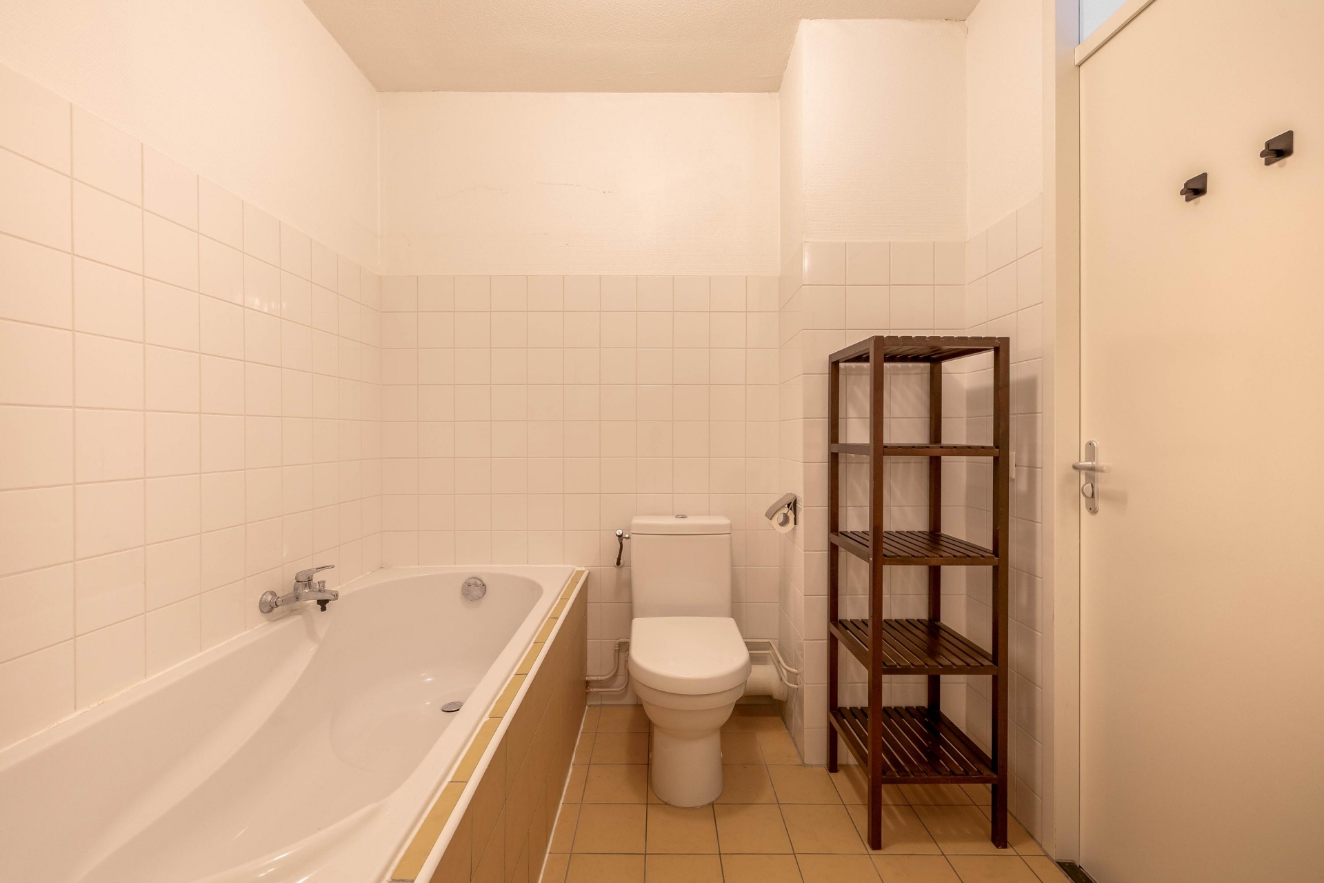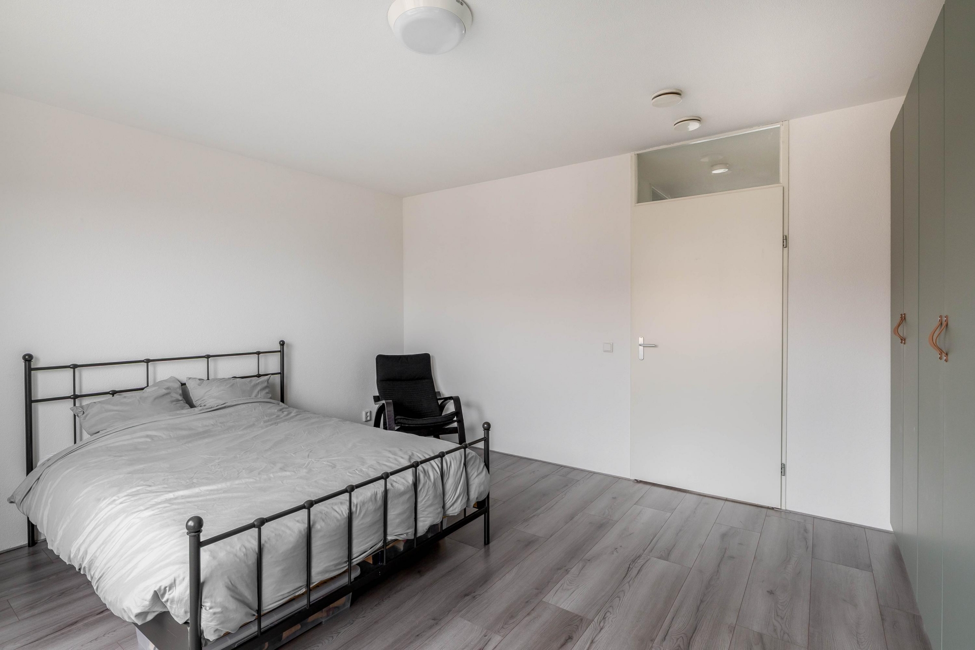 Op de eerste verdieping bevindt zich de grootste slaapkamer, over de volle breedte van de woning. Deze is ruim genoeg voor een groot bed en een kledingkast, en heeft prettig daglicht. De badkamer is compleet uitgevoerd met een ligbad, inloopdouche, toilet en wastafelmeubel.