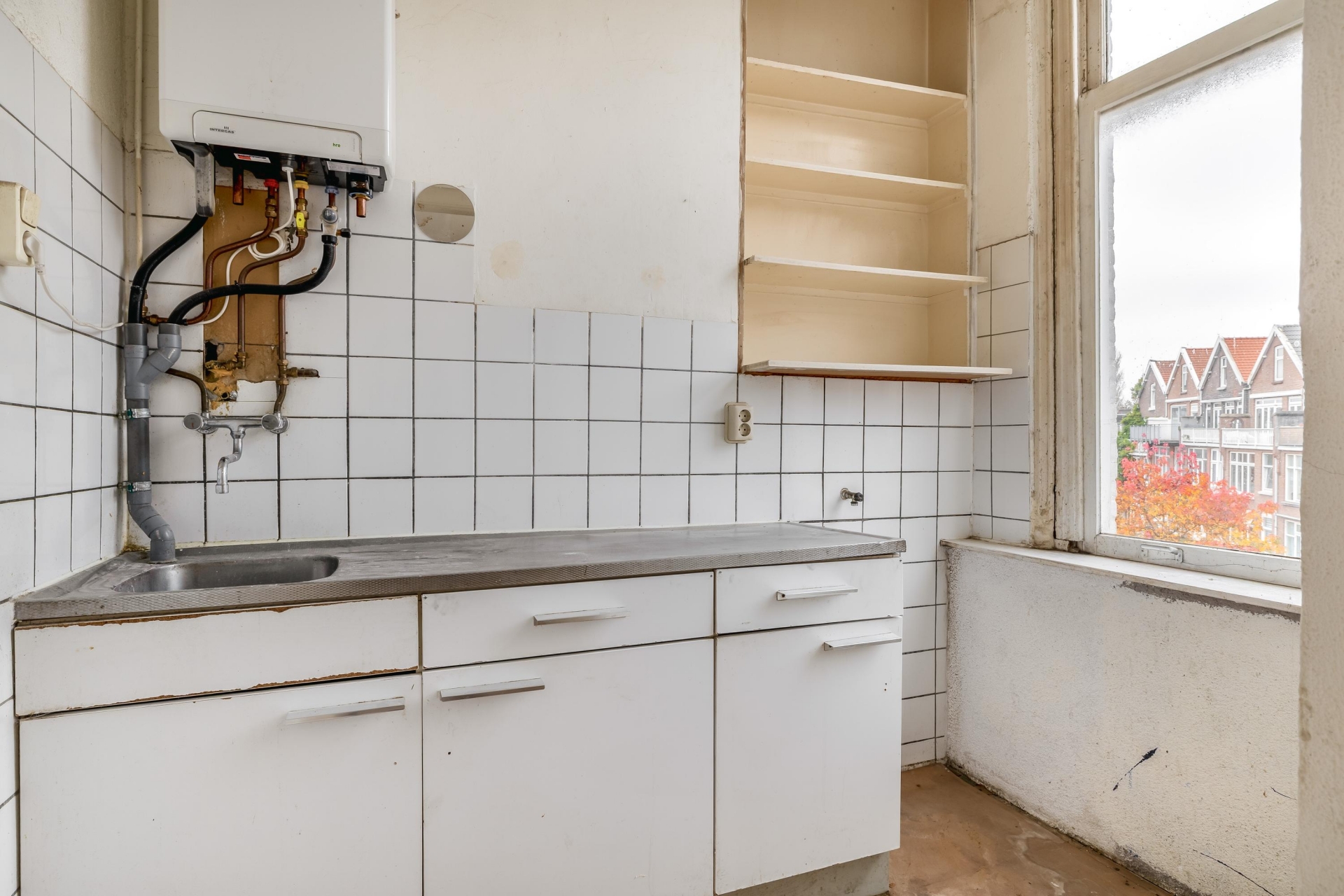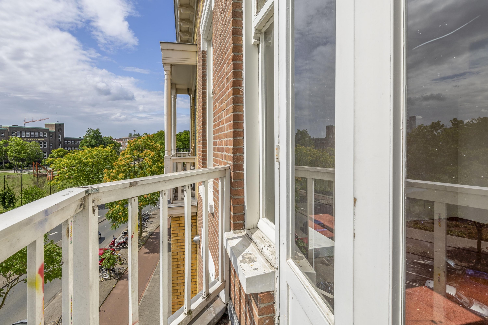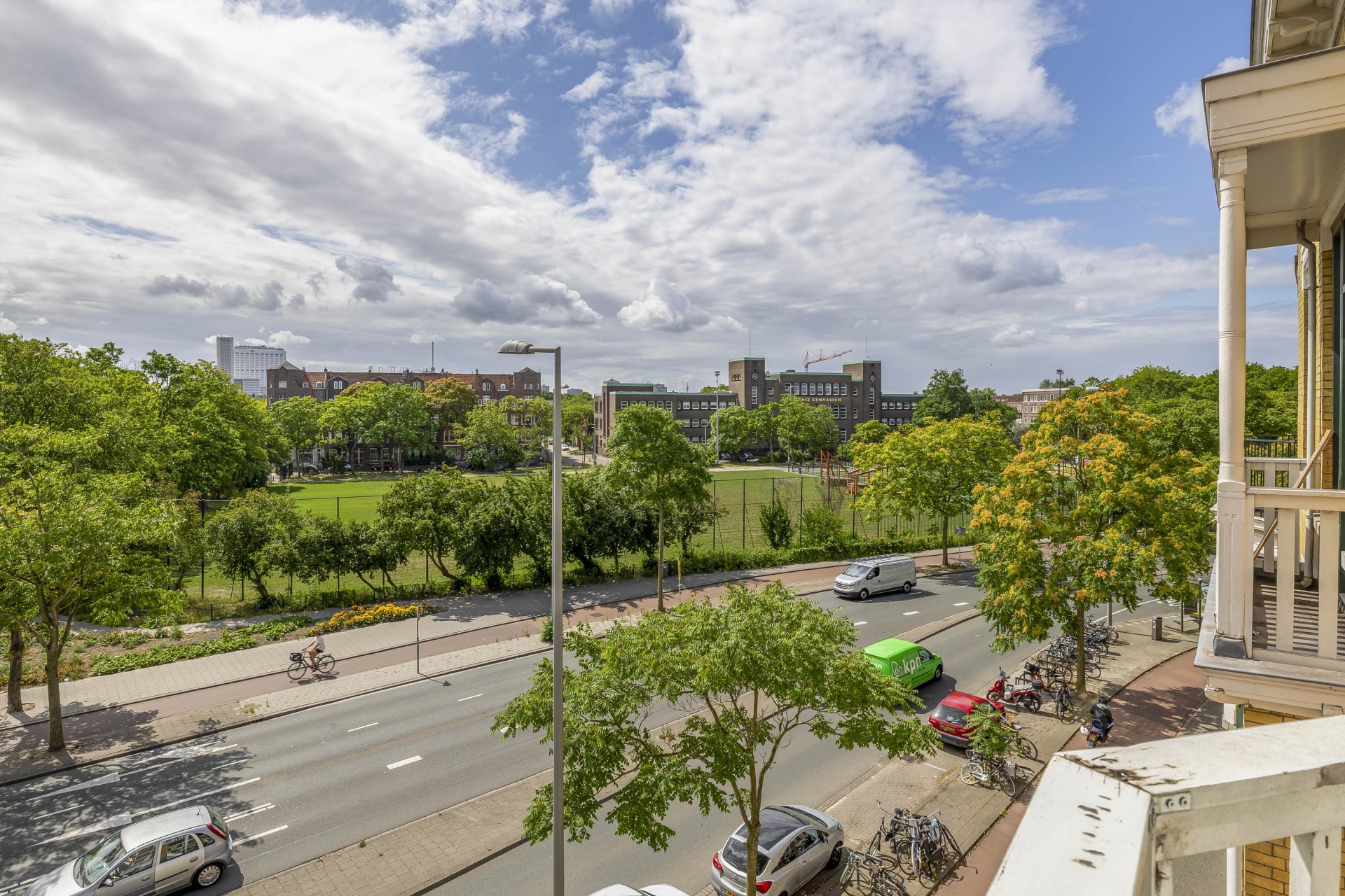 Aan de voorzijde van de woonkamer bevindt zich het balkon. Door een gunstige ligging is het hier overdag heerlijk genieten van uitzicht over de stad en groen. Daarnaast beschikt de woning over grote raampartijen aan zowel de voor- als achterzijde. In combinatie met de plafondhoogte van ca. 2,88 meter zorgt dit voor een prettige ruimtelijke beleving en veel natuurlijke lichtinval.