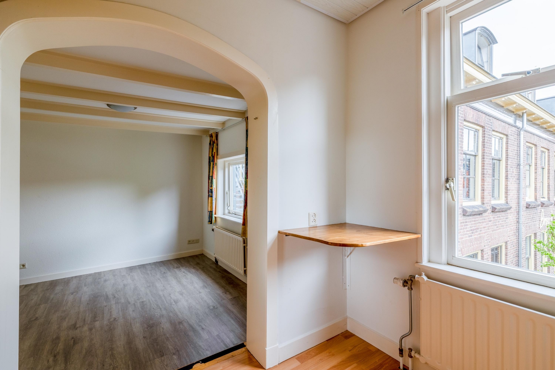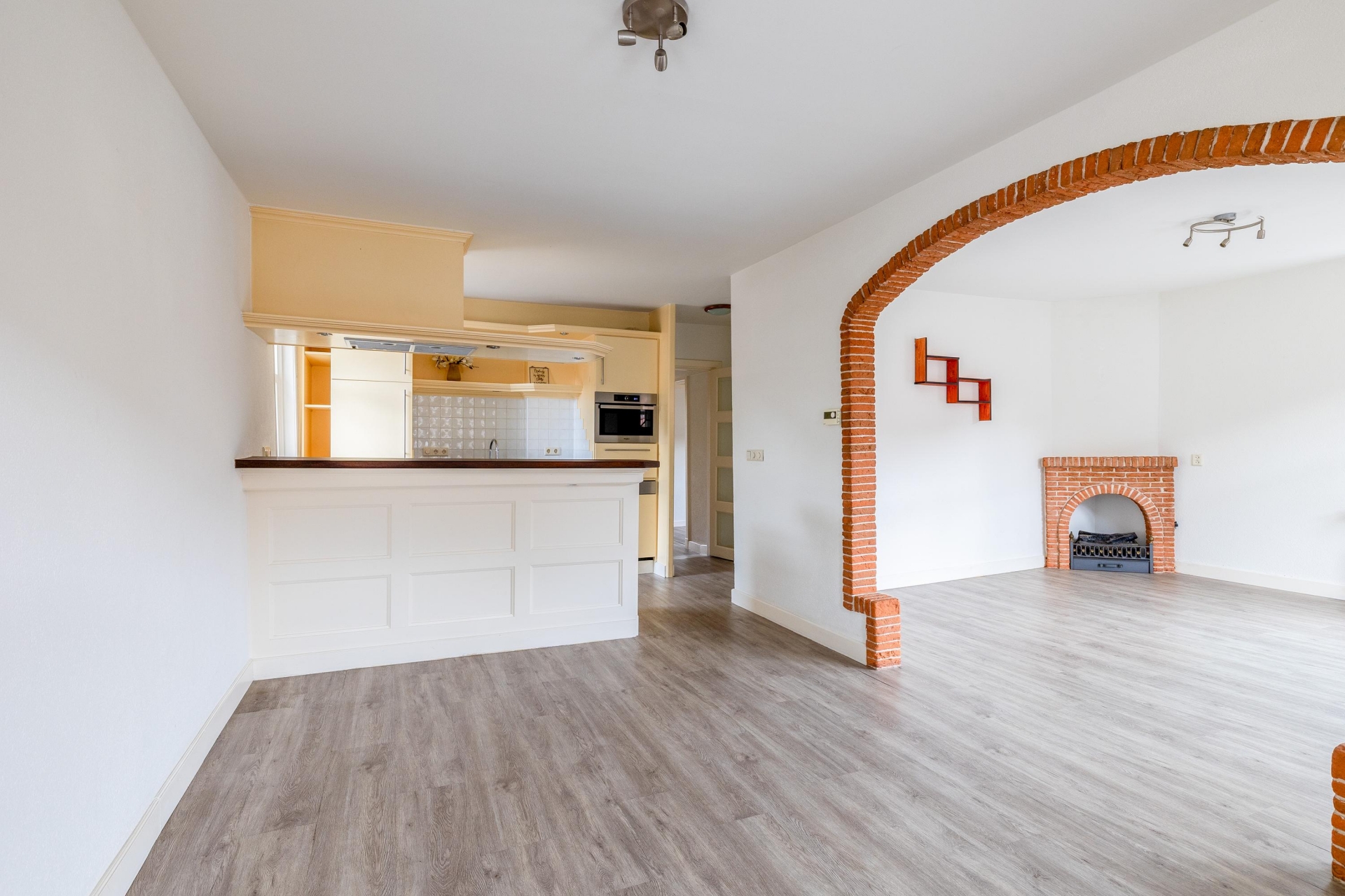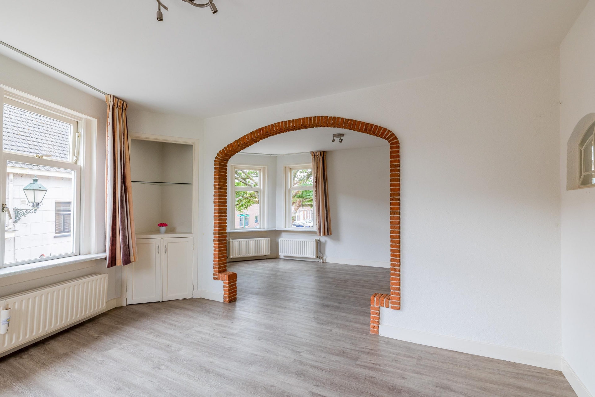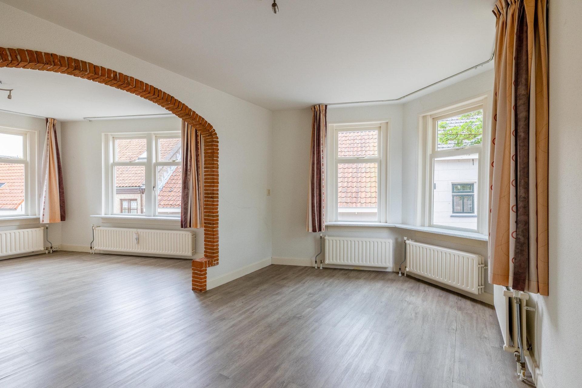 De woonkamer is een heerlijke plek om te ontspannen. De fraaie boog met bakstenen rand geeft de ruimte extra karakter en zorgt voor een speelse indeling met verschillende zitgedeeltes. De grote ramen aan de voorzijde brengen veel licht naar binnen en bieden zicht op de charmante straatjes van het oude centrum. De vloer heeft een moderne uitstraling en combineert goed met de lichte muren, waardoor je er direct je eigen stijl in kwijt kunt.
