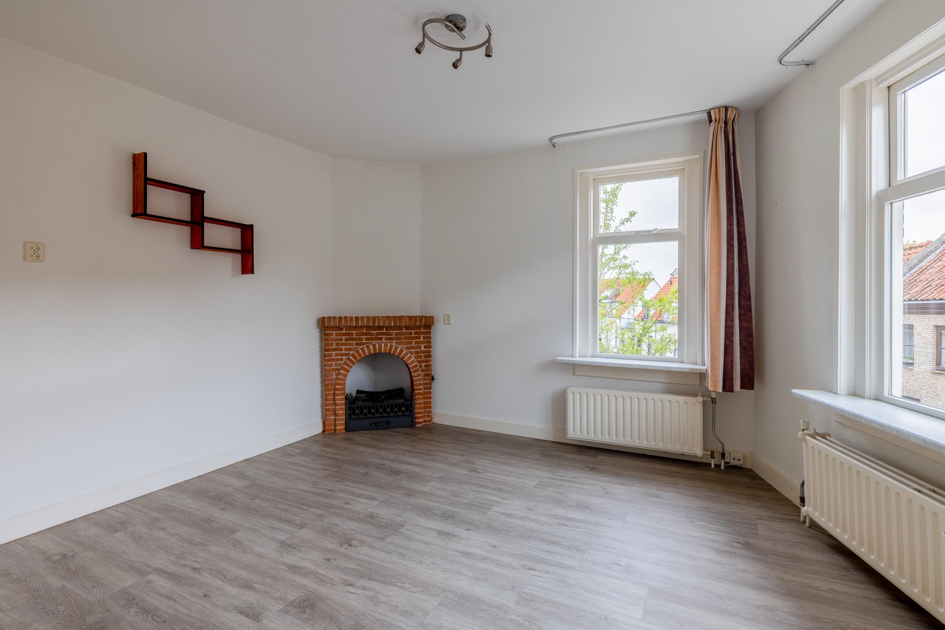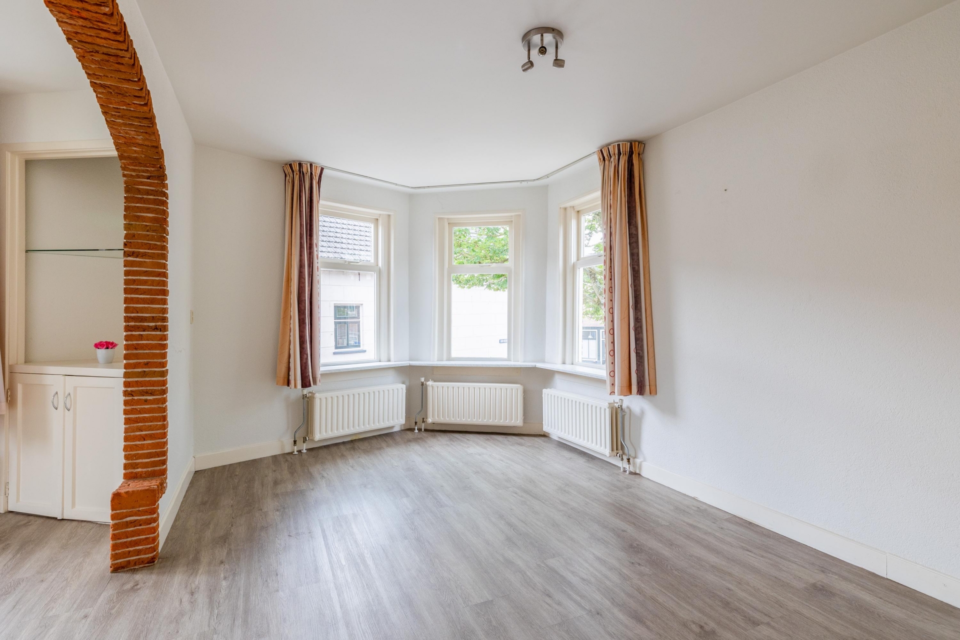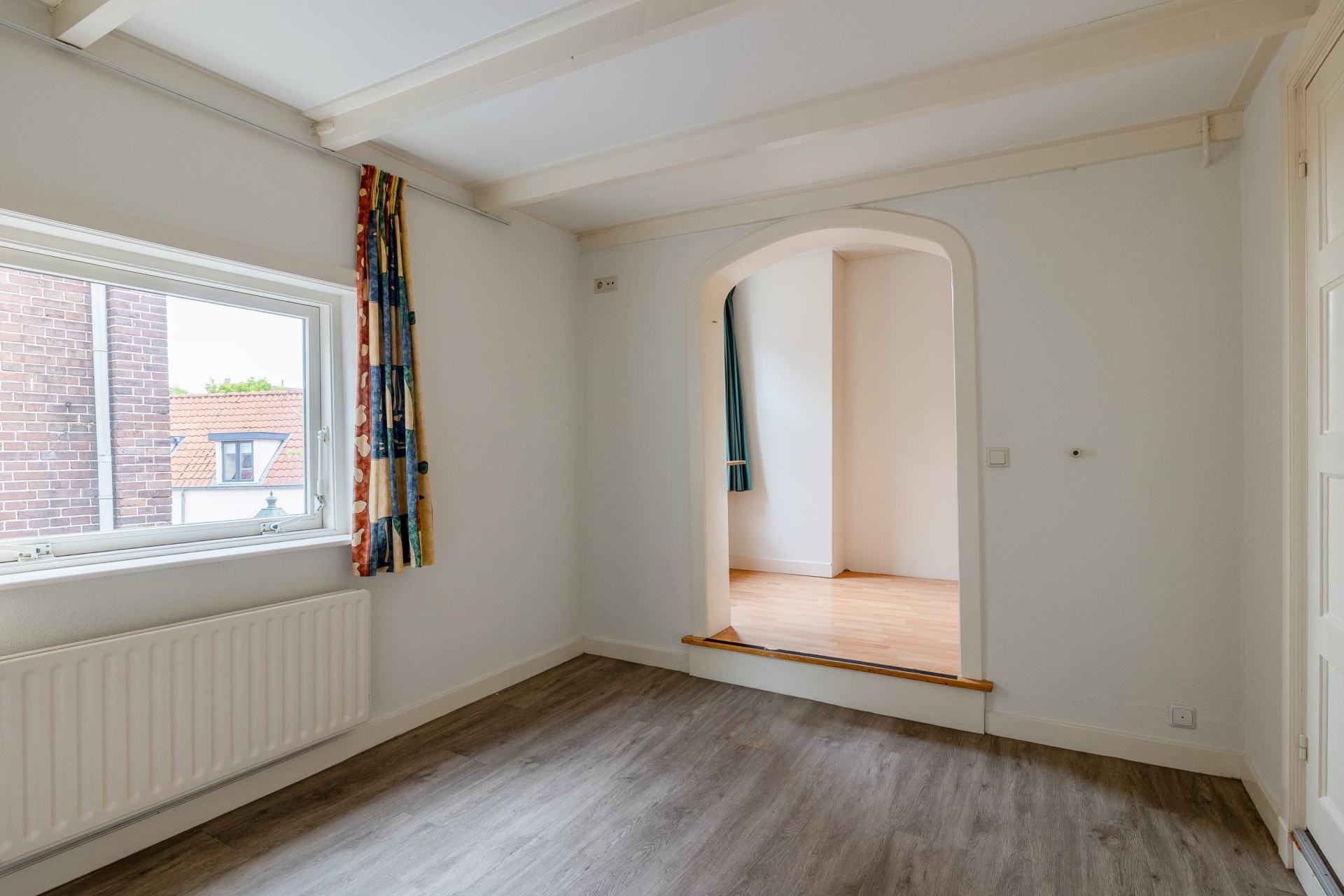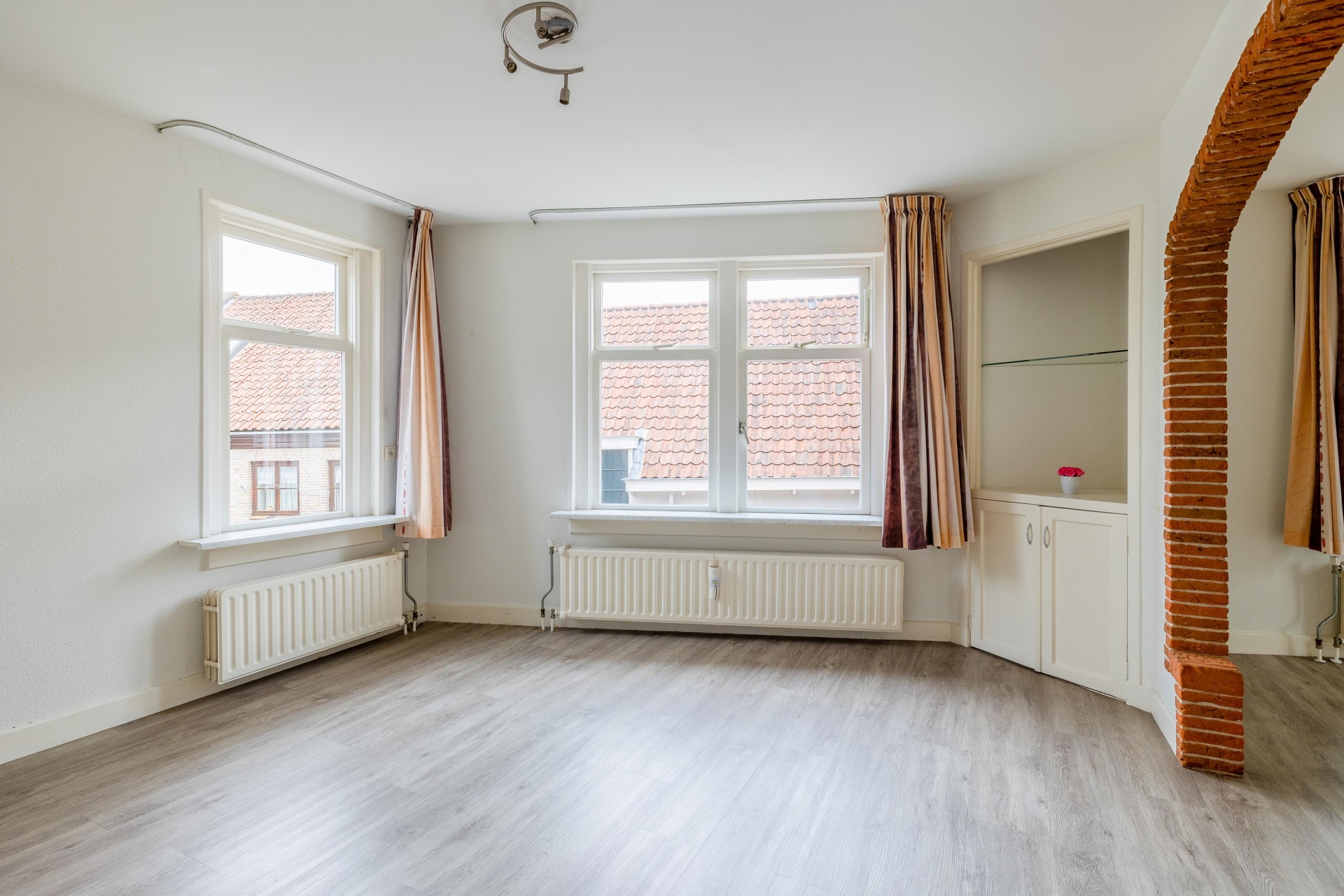 De woonkamer is een heerlijke plek om te ontspannen. De fraaie boog met bakstenen rand geeft de ruimte extra karakter en zorgt voor een speelse indeling met verschillende zitgedeeltes. De grote ramen aan de voorzijde brengen veel licht naar binnen en bieden zicht op de charmante straatjes van het oude centrum. De vloer heeft een moderne uitstraling en combineert goed met de lichte muren, waardoor je er direct je eigen stijl in kwijt kunt.