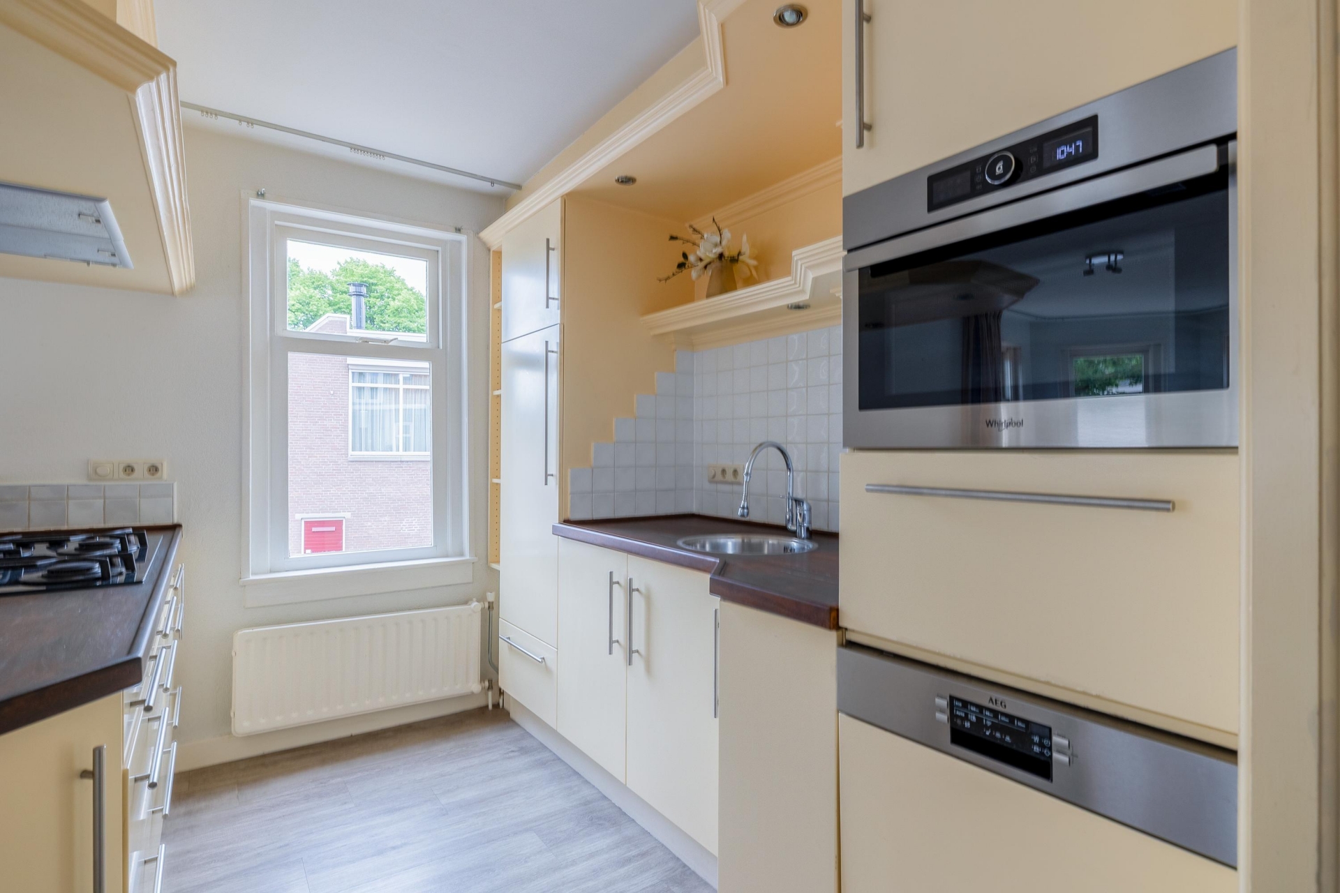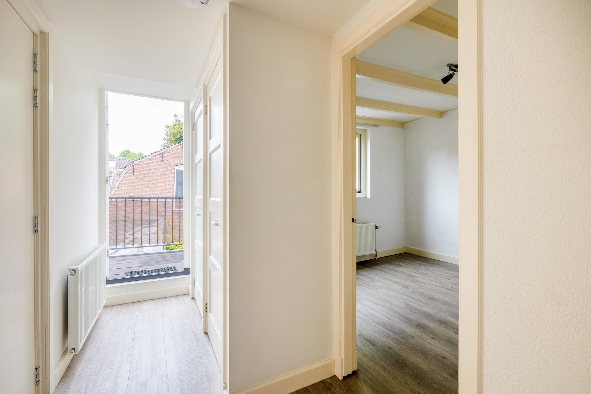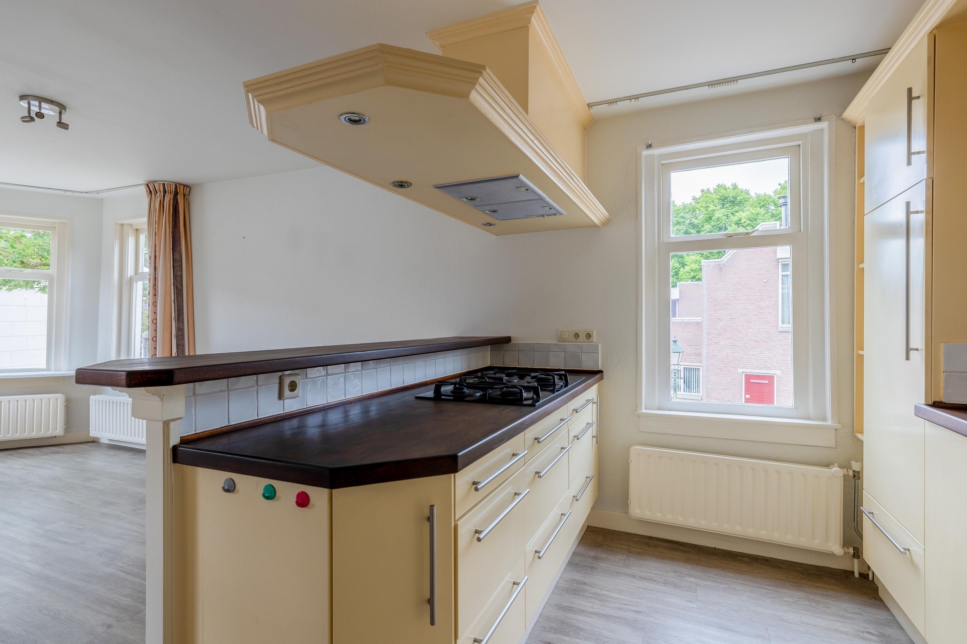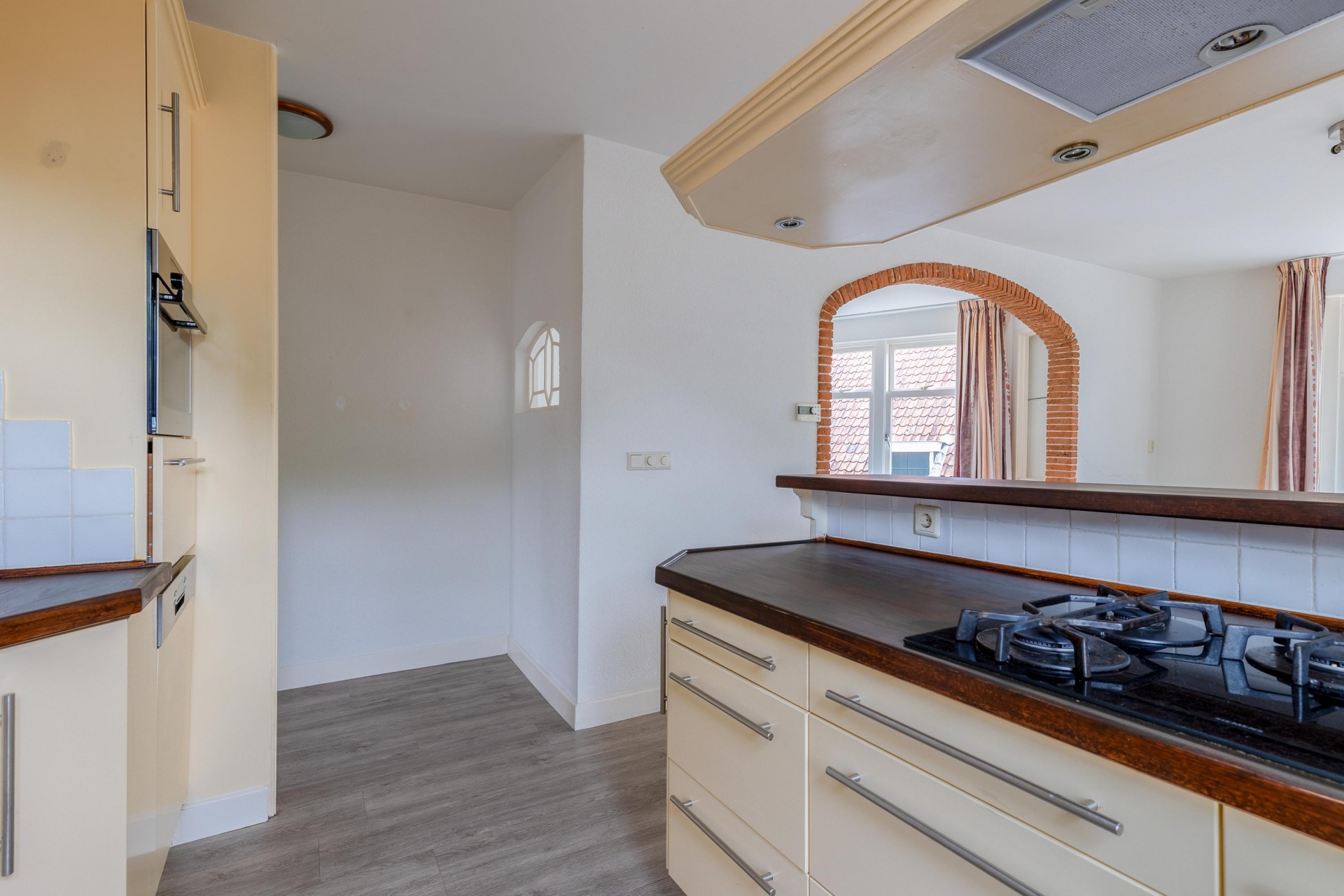 De woonkamer is een heerlijke plek om te ontspannen. De fraaie boog met bakstenen rand geeft de ruimte extra karakter en zorgt voor een speelse indeling met verschillende zitgedeeltes. De grote ramen aan de voorzijde brengen veel licht naar binnen en bieden zicht op de charmante straatjes van het oude centrum. De vloer heeft een moderne uitstraling en combineert goed met de lichte muren, waardoor je er direct je eigen stijl in kwijt kunt.
