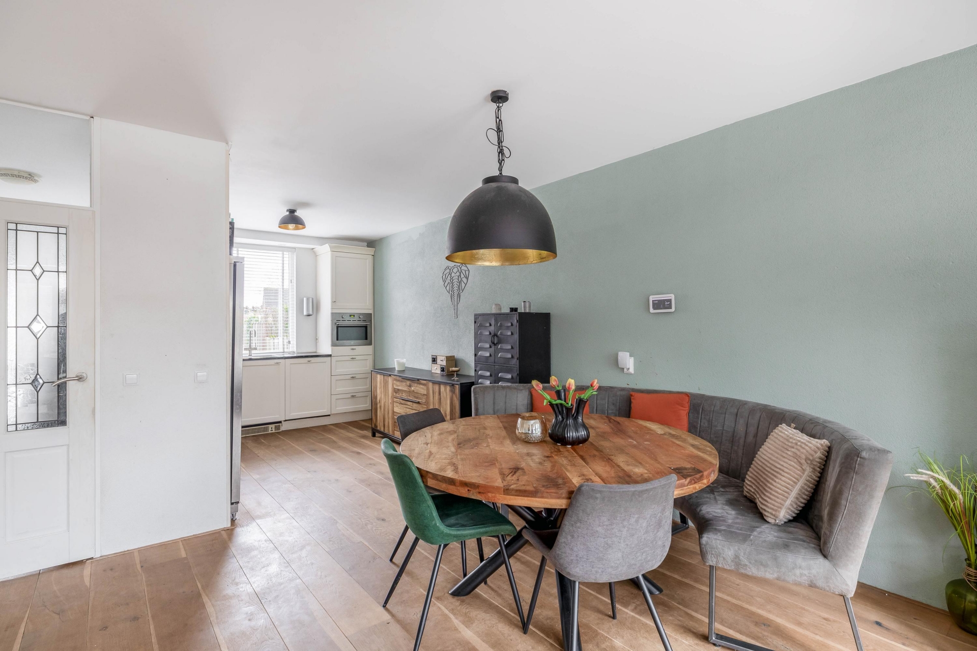 De begane grond is slim ingedeeld en voelt dankzij de grote ramen en serre heerlijk ruim en licht aan. De woonkamer van ca. 27 m² is een fijne plek om te ontspannen, met een natuurlijke doorloop naar de serre die perfect dienstdoet als tweede zithoek en/of speelruimte. Hier kijk je uit op de zonnige en verzorgde achtertuin, gelegen op het oosten – ideaal voor een ontbijtje in de ochtendzon of een ontspannen borrel aan het eind van de dag.